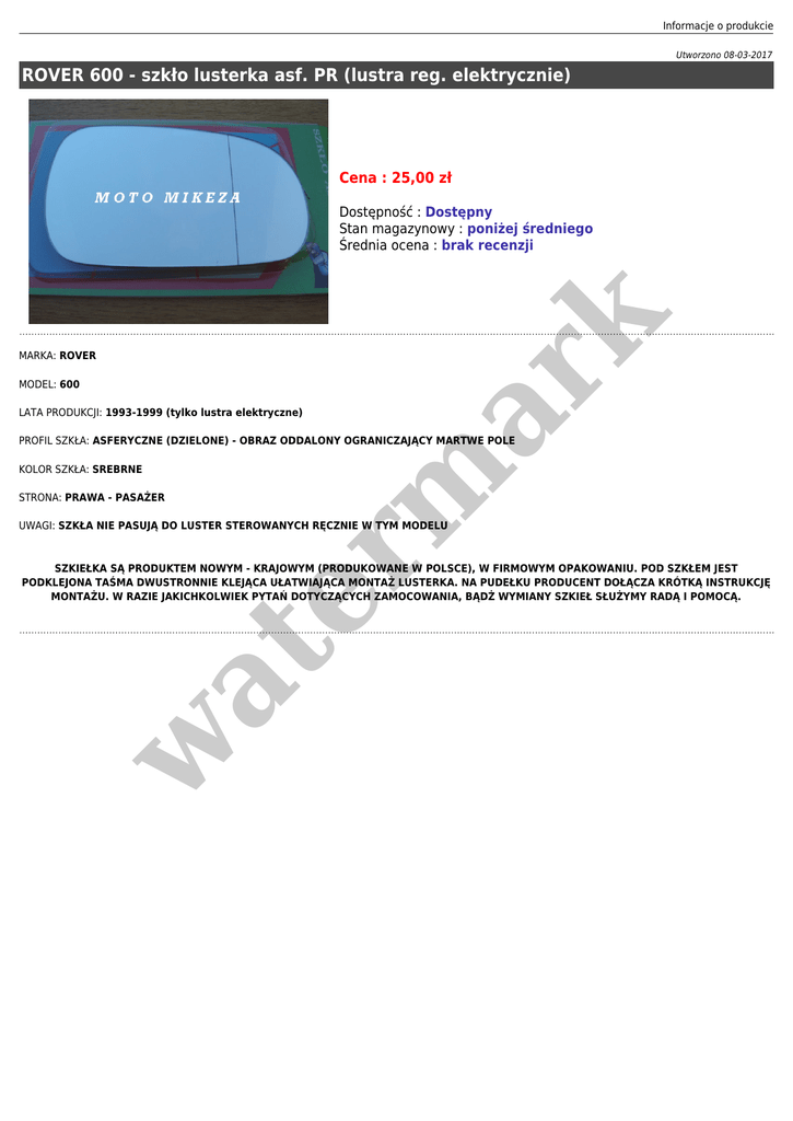 Informacje o produkcie Utworzono 08-03-2017 ROVER 600 - szkło lusterka asf. PR (lustra reg. elektrycznie) Cena : 25,00 zł MARKA: ROVER MODEL: 600 er m ar k Dostępność : Dostępny Stan magazynowy : poniżej średniego Średnia ocena : brak recenzji LATA PRODUKCJI: 1993-1999 (tylko lustra elektryczne) PROFIL SZKŁA: ASFERYCZNE (DZIELONE) - OBRAZ ODDALONY OGRANICZAJĄCY MARTWE POLE KOLOR SZKŁA: SREBRNE STRONA: PRAWA - PASAŻER UWAGI: SZKŁA NIE PASUJĄ DO LUSTER STEROWANYCH RĘCZNIE W TYM MODELU w at SZKIEŁKA SĄ PRODUKTEM NOWYM - KRAJOWYM (PRODUKOWANE W POLSCE), W FIRMOWYM OPAKOWANIU. POD SZKŁEM JEST PODKLEJONA TAŚMA DWUSTRONNIE KLEJĄCA UŁATWIAJĄCA MONTAŻ LUSTERKA. NA PUDEŁKU PRODUCENT DOŁĄCZA KRÓTKĄ INSTRUKCJĘ MONTAŻU. W RAZIE JAKICHKOLWIEK PYTAŃ DOTYCZĄCYCH ZAMOCOWANIA, BĄDŻ WYMIANY SZKIEŁ SŁUŻYMY RADĄ I POMOCĄ.