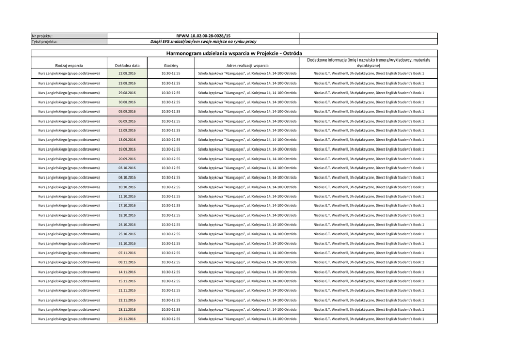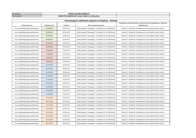 RPWM.10.02.00-28-0028/15 Dzięki EFS znalazł/am/em swoje miejsce na rynku pracy Nr projektu: Tytuł projektu: Harmonogram udzielania wsparcia w Projekcie - Ostróda Rodzaj wsparcia Dokładna data Godziny Adres realizacji wsparcia Dodatkowe informacje (imię i nazwisko trenera/wykładowcy, materiały dydaktyczne) Kurs j.angielskiego (grupa podstawowa) 22.08.2016 10.30-12.55 Szkoła Językowa "4Languages", ul. Kolejowa 14, 14-100 Ostróda Nicolas E.T. Weatherill, 3h dydaktyczne, Direct English Student`s Book 1 Kurs j.angielskiego (grupa podstawowa) 23.08.2016 10.30-12.55 Szkoła Językowa "4Languages", ul. Kolejowa 14, 14-100 Ostróda Nicolas E.T. Weatherill, 3h dydaktyczne, Direct English Student`s Book 1 Kurs j.angielskiego (grupa podstawowa) 29.08.2016 10.30-12.55 Szkoła Językowa "4Languages", ul. Kolejowa 14, 14-100 Ostróda Nicolas E.T. Weatherill, 3h dydaktyczne, Direct English Student`s Book 1 Kurs j.angielskiego (grupa podstawowa) 30.08.2016 10.30-12.55 Szkoła Językowa "4Languages", ul. Kolejowa 14, 14-100 Ostróda Nicolas E.T. Weatherill, 3h dydaktyczne, Direct English Student`s Book 1 Kurs j.angielskiego (grupa podstawowa) 05.09.2016 10.30-12.55 Szkoła Językowa "4Languages", ul. Kolejowa 14, 14-100 Ostróda Nicolas E.T. Weatherill, 3h dydaktyczne, Direct English Student`s Book 1 Kurs j.angielskiego (grupa podstawowa) 06.09.2016 10.30-12.55 Szkoła Językowa "4Languages", ul. Kolejowa 14, 14-100 Ostróda Nicolas E.T. Weatherill, 3h dydaktyczne, Direct English Student`s Book 1 Kurs j.angielskiego (grupa podstawowa) 12.09.2016 10.30-12.55 Szkoła Językowa "4Languages", ul. Kolejowa 14, 14-100 Ostróda Nicolas E.T. Weatherill, 3h dydaktyczne, Direct English Student`s Book 1 Kurs j.angielskiego (grupa podstawowa) 13.09.2016 10.30-12.55 Szkoła Językowa "4Languages", ul. Kolejowa 14, 14-100 Ostróda Nicolas E.T. Weatherill, 3h dydaktyczne, Direct English Student`s Book 1 Kurs j.angielskiego (grupa podstawowa) 19.09.2016 10.30-12.55 Szkoła Językowa "4Languages", ul. Kolejowa 14, 14-100 Ostróda Nicolas E.T. Weatherill, 3h dydaktyczne, Direct English Student`s Book 1 Kurs j.angielskiego (grupa podstawowa) 20.09.2016 10.30-12.55 Szkoła Językowa "4Languages", ul. Kolejowa 14, 14-100 Ostróda Nicolas E.T. Weatherill, 3h dydaktyczne, Direct English Student`s Book 1 Kurs j.angielskiego (grupa podstawowa) 03.10.2016 10.30-12.55 Szkoła Językowa "4Languages", ul. Kolejowa 14, 14-100 Ostróda Nicolas E.T. Weatherill, 3h dydaktyczne, Direct English Student`s Book 1 Kurs j.angielskiego (grupa podstawowa) 04.10.2016 10.30-12.55 Szkoła Językowa "4Languages", ul. Kolejowa 14, 14-100 Ostróda Nicolas E.T. Weatherill, 3h dydaktyczne, Direct English Student`s Book 1 Kurs j.angielskiego (grupa podstawowa) 10.10.2016 10.30-12.55 Szkoła Językowa "4Languages", ul. Kolejowa 14, 14-100 Ostróda Nicolas E.T. Weatherill, 3h dydaktyczne, Direct English Student`s Book 1 Kurs j.angielskiego (grupa podstawowa) 11.10.2016 10.30-12.55 Szkoła Językowa "4Languages", ul. Kolejowa 14, 14-100 Ostróda Nicolas E.T. Weatherill, 3h dydaktyczne, Direct English Student`s Book 1 Kurs j.angielskiego (grupa podstawowa) 17.10.2016 10.30-12.55 Szkoła Językowa "4Languages", ul. Kolejowa 14, 14-100 Ostróda Nicolas E.T. Weatherill, 3h dydaktyczne, Direct English Student`s Book 1 Kurs j.angielskiego (grupa podstawowa) 18.10.2016 10.30-12.55 Szkoła Językowa "4Languages", ul. Kolejowa 14, 14-100 Ostróda Nicolas E.T. Weatherill, 3h dydaktyczne, Direct English Student`s Book 1 Kurs j.angielskiego (grupa podstawowa) 24.10.2016 10.30-12.55 Szkoła Językowa "4Languages", ul. Kolejowa 14, 14-100 Ostróda Nicolas E.T. Weatherill, 3h dydaktyczne, Direct English Student`s Book 1 Kurs j.angielskiego (grupa podstawowa) 25.10.2016 10.30-12.55 Szkoła Językowa "4Languages", ul. Kolejowa 14, 14-100 Ostróda Nicolas E.T. Weatherill, 3h dydaktyczne, Direct English Student`s Book 1 Kurs j.angielskiego (grupa podstawowa) 31.10.2016 10.30-12.55 Szkoła Językowa "4Languages", ul. Kolejowa 14, 14-100 Ostróda Nicolas E.T. Weatherill, 3h dydaktyczne, Direct English Student`s Book 1 Kurs j.angielskiego (grupa podstawowa) 07.11.2016 10.30-12.55 Szkoła Językowa "4Languages", ul. Kolejowa 14, 14-100 Ostróda Nicolas E.T. Weatherill, 3h dydaktyczne, Direct English Student`s Book 1 Kurs j.angielskiego (grupa podstawowa) 08.11.2016 10.30-12.55 Szkoła Językowa "4Languages", ul. Kolejowa 14, 14-100 Ostróda Nicolas E.T. Weatherill, 3h dydaktyczne, Direct English Student`s Book 1 Kurs j.angielskiego (grupa podstawowa) 14.11.2016 10.30-12.55 Szkoła Językowa "4Languages", ul. Kolejowa 14, 14-100 Ostróda Nicolas E.T. Weatherill, 3h dydaktyczne, Direct English Student`s Book 1 Kurs j.angielskiego (grupa podstawowa) 15.11.2016 10.30-12.55 Szkoła Językowa "4Languages", ul. Kolejowa 14, 14-100 Ostróda Nicolas E.T. Weatherill, 3h dydaktyczne, Direct English Student`s Book 1 Kurs j.angielskiego (grupa podstawowa) 21.11.2016 10.30-12.55 Szkoła Językowa "4Languages", ul. Kolejowa 14, 14-100 Ostróda Nicolas E.T. Weatherill, 3h dydaktyczne, Direct English Student`s Book 1 Kurs j.angielskiego (grupa podstawowa) 22.11.2016 10.30-12.55 Szkoła Językowa "4Languages", ul. Kolejowa 14, 14-100 Ostróda Nicolas E.T. Weatherill, 3h dydaktyczne, Direct English Student`s Book 1 Kurs j.angielskiego (grupa podstawowa) 28.11.2016 10.30-12.55 Szkoła Językowa "4Languages", ul. Kolejowa 14, 14-100 Ostróda Nicolas E.T. Weatherill, 3h dydaktyczne, Direct English Student`s Book 1 Kurs j.angielskiego (grupa podstawowa) 29.11.2016 10.30-12.55 Szkoła Językowa "4Languages", ul. Kolejowa 14, 14-100 Ostróda Nicolas E.T. Weatherill, 3h dydaktyczne, Direct English Student`s Book 1