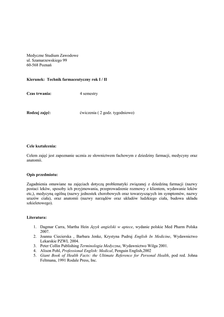 Medyczne Studium Zawodowe ul. Szamarzewskiego 99 60-568 Poznań Kierunek: Technik farmaceutyczny rok I / II Czas trwania: 4 semestry Rodzaj zajęć: ćwiczenia ( 2 godz. tygodniowo) Cele kształcenia: Celem zajęć jest zapoznanie ucznia ze słownictwem fachowym z dziedziny farmacji, medycyny oraz anatomii. Opis przedmiotu: Zagadnienia omawiane na zajęciach dotyczą problematyki związanej z dziedziną farmacji (nazwy postaci leków, sposoby ich przyjmowania, przeprowadzenie rozmowy z klientem, wydawanie leków etc,), medycyną ogólną (nazwy jednostek chorobowych oraz towarzyszących im symptomów, nazwy urazów ciała), oraz anatomii (nazwy narządów oraz układów ludzkiego ciała, budowa układu szkieletowego). Literatura: 1. Dagmar Carra, Martha Hein Język angielski w aptece, wydanie polskie Med Pharm Polska 2007. 2. Joanna Ciecierska , Barbara Jenke, Krystyna Pudruj English In Medicine, Wydawnictwo Lekarskie PZWL 2004. 3. Peter Collin Publishing Terminologia Medyczna, Wydawnictwo Wilga 2001. 4. Alison Pohl, Professional English: Medical, Penguin English,2002 5. Giant Book of Health Facts: the Ultimate Reference for Personal Health, pod red. Johna Feltmana, 1991 Rodale Press, Inc.