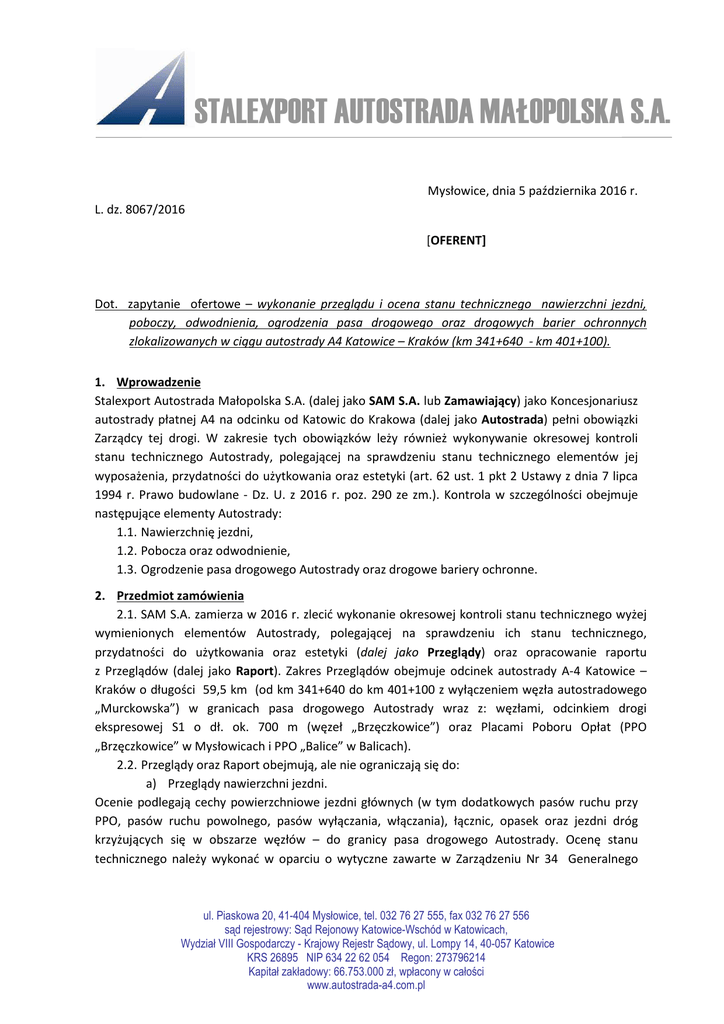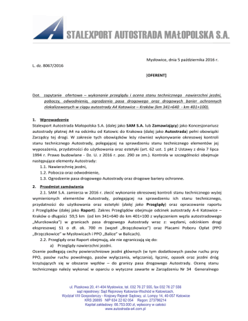 STALEXPORT AUTOSTRADA MAŁOPOLSKA S.A. Mysłowice, dnia 5 października 2016 r. L. dz. 8067/2016 [OFERENT] Dot. zapytanie ofertowe – wykonanie przeglądu i ocena stanu technicznego nawierzchni jezdni, poboczy, odwodnienia, ogrodzenia pasa drogowego oraz drogowych barier ochronnych zlokalizowanych w ciągu autostrady A4 Katowice – Kraków (km 341+640 - km 401+100). 1. Wprowadzenie Stalexport Autostrada Małopolska S.A. (dalej jako SAM S.A. lub Zamawiający) jako Koncesjonariusz autostrady płatnej A4 na odcinku od Katowic do Krakowa (dalej jako Autostrada) pełni obowiązki Zarządcy tej drogi. W zakresie tych obowiązków leży również wykonywanie okresowej kontroli stanu technicznego Autostrady, polegającej na sprawdzeniu stanu technicznego elementów jej wyposażenia, przydatności do użytkowania oraz estetyki (art. 62 ust. 1 pkt 2 Ustawy z dnia 7 lipca 1994 r. Prawo budowlane - Dz. U. z 2016 r. poz. 290 ze zm.). Kontrola w szczególności obejmuje następujące elementy Autostrady: 1.1. Nawierzchnię jezdni, 1.2. Pobocza oraz odwodnienie, 1.3. Ogrodzenie pasa drogowego Autostrady oraz drogowe bariery ochronne. 2. Przedmiot zamówienia 2.1. SAM S.A. zamierza w 2016 r. zlecić wykonanie okresowej kontroli stanu technicznego wyżej wymienionych elementów Autostrady, polegającej na sprawdzeniu ich stanu technicznego, przydatności do użytkowania oraz estetyki (dalej jako Przeglądy) oraz opracowanie raportu z Przeglądów (dalej jako Raport). Zakres Przeglądów obejmuje odcinek autostrady A-4 Katowice – Kraków o długości 59,5 km (od km 341+640 do km 401+100 z wyłączeniem węzła autostradowego „Murckowska”) w granicach pasa drogowego Autostrady wraz z: węzłami, odcinkiem drogi ekspresowej S1 o dł. ok. 700 m (węzeł „Brzęczkowice”) oraz Placami Poboru Opłat (PPO „Brzęczkowice” w Mysłowicach i PPO „Balice” w Balicach). 2.2. Przeglądy oraz Raport obejmują, ale nie ograniczają się do: a) Przeglądy nawierzchni jezdni. Ocenie podlegają cechy powierzchniowe jezdni głównych (w tym dodatkowych pasów ruchu przy PPO, pasów ruchu powolnego, pasów wyłączania, włączania), łącznic, opasek oraz jezdni dróg krzyżujących się w obszarze węzłów – do granicy pasa drogowego Autostrady. Ocenę stanu technicznego należy wykonać w oparciu o wytyczne zawarte w Zarządzeniu Nr 34 Generalnego ul. Piaskowa 20, 41-404 Mysłowice, tel. 032 76 27 555, fax 032 76 27 556 sąd rejestrowy: Sąd Rejonowy Katowice-Wschód w Katowicach, Wydział VIII Gospodarczy - Krajowy Rejestr Sądowy, ul. Lompy 14, 40-057 Katowice KRS 26895 NIP 634 22 62 054 Regon: 273796214 Kapitał zakładowy: 66.753.000 zł, wpłacony w całości www.autostrada-a4.com.pl Dyrektora Dróg Krajowych i Autostrad z dnia 30 kwietnia 2015 r. w sprawie diagnostyki stanu nawierzchni i jej elementów. b) Przeglądy poboczy oraz odwodnienia. Ocenie podlegają pobocza utwardzone (w tym pasy awaryjnego postoju), pobocza nieutwardzone oraz liniowe elementy odwodnienia jak: rowy, ścieki (w tym odwodnienie w pasie dzielącym), z wyłączeniem przepustów oraz zbiorników retencyjnych. Ocenę stanu technicznego poboczy oraz systemu odwodnienia należy wykonać w oparciu o wytyczne w Zarządzeniu nr 5 Generalnego Dyrektora Dróg Krajowych i Autostrad z dnia 22 lutego 2008 r. w sprawie systemu oceny stanu pobocza i odwodnienia dróg (SOPO). c) Przeglądy ogrodzenia pasa drogowego Autostrady oraz drogowych barier ochronnych. Ocenę stanu technicznego ogrodzenia oraz drogowych barier ochronnych należy wykonać na podstawie oceny wizualnej, w oparciu o kryteria ustalone z Zamawiającym. Formularze oceny winny zawierać w szczególności: Dla ogrodzenia: − Lokalizację wraz ze wskazaniem kilometrażu kontrolowanych odcinków, − Określenie wysokości ogrodzenia dla kontrolowanego odcinka, − Ocenę stanu technicznego wszystkich elementów ogrodzenia (w tym: przęsła, bramy, furtki), − Wskazanie ewentualnych nieprawidłowości, − Zalecenia pokontrolne – w tym wskazanie zalecanych zabiegów, Dla drogowych barier ochronnych: − Lokalizację wraz ze wskazaniem kilometrażu kontrolowanych odcinków, − Określenie typu drogowej bariery ochronnej dla kontrolowanego odcinka, − Ocenę stanu technicznego, − Wskazanie ewentualnych nieprawidłowości, − Zalecenia pokontrolne – w tym wskazanie zalecanych zabiegów, d) Wykonanie Raportu z Przeglądów. Raport należy opracować w odrębnych tomach dla wyżej wymienionych grup elementów. Raport winien zawierać w szczególności: − część opisową obejmującą przedmiot i zakres opracowania, metodę oceny stanu technicznego, podstawy wykonania, użyte oznaczenia, skróty itp., − formularze z Przeglądów, − protokoły zbiorcze z Przeglądów, − dokumentację fotograficzną miejsc lub elementów charakterystycznych, stanowiących zagrożenie bezpieczeństwa ruchu, wymagające przeprowadzenia najpilniejszych napraw, − podsumowanie (zestawienia zbiorcze, ocena techniczna, wnioski, zalecenia, itp.), − inne wymagane dokumenty (np. kopie uprawnień zawodowych i zaświadczenie o przynależności do Okręgowej Izby Inżynierów Budownictwa osób wykonujących Przeglądy). 2.3. W przypadku zainteresowania z Państwa strony wykonaniem Przeglądów oraz opracowaniem Raportu prosimy o złożenie oferty (dalej jako Oferta). 2 2.4. Zakres oraz technologia wykonania Przeglądów były przedmiotem oceny inżynieryjnej i są objęte Wytycznymi Zamawiającego (załącznik nr 1), które stanowią podstawę do sporządzenia oraz wyceny Oferty. 3. Cena i termin wykonania zamówienia 3.1. Przeglądy i Raport objęte niniejszym postępowaniem wykonane zostaną w oparciu o kontrakt ryczałtowy o ustalonej cenie. 3.2. W ofercie należy podać łączną cenę netto i brutto za wykonanie Przeglądów i Raportu (dalej jako Cena) z wyszczególnieniem podziału Ceny na każdą z trzech grup kontrolowanych elementów. 3.3. Zamawiający nie przewiduje dzielenia z