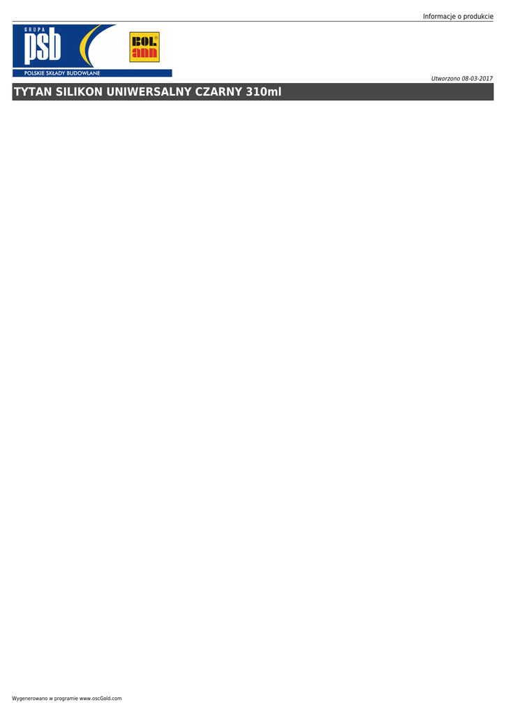 Informacje o produkcie Utworzono 08-03-2017 TYTAN SILIKON UNIWERSALNY CZARNY 310ml Wygenerowano w programie www.oscGold.com Cena : 14,19 zł Nr katalogowy : 273 Producent : TYTAN Dostępność : Dostępny Stan magazynowy : brak w magazynie Średnia ocena : brak recenzji Informacje o produkcie OPIS OGÓLNYTrwale elastyczny, łatwy w użyciu silikon o kwaśnym systemie utwardzania. Doskonale nadaje się do zastosowania wewnątrz i na zewnątrz pomieszczeń. Odporny na promieniowanie UV i zmienne warunki atmosferyczne. Tworzy trwałą i wodoszczelną spoinę, zabezpieczającą szczeliny przed wnikaniem wilgoci i powietrza.ZASTOSOWANIE spoinowanie płytek ceramicznych i połączeń narożnych uszczelnianie instalacji kanalizacyjnych i hydraulicznych uszczelnianie połączeń i szczelin drobne naprawcze prace domowe WŁAŚCIWOŚCI doskonale przyczepny do materiałów takich jak szkło, ceramika, glazura, drewno, twarde PVC, polistyren wodoszczelny elastyczny odporny na promieniowanie UV i zmienne warunki atmosferyczne trwały kolor po utwardzeniu do wewnątrz i na zewnątrz Wygenerowano w programie www.oscGold.com