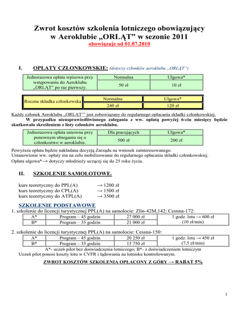 Zwrot kosztów szkolenia lotniczego obowiązujący w Aeroklubie „ORLĄT” w sezonie 2011 obowiązuje od 01.07.2010 I. OPŁATY CZŁONKOWSKIE: (dotyczy członków aeroklubu „ORLĄT”) Jednorazowa opłata wpisowa przy wstępowaniu do Aeroklubu „ORLĄT” po raz pierwszy. Roczna składka członkowska Normalna Ulgowa* 50 zł 10 zł Normalna Ulgowa* 240 zł 120 zł KaŜdy członek Aeroklubu „ORLĄT’” jest zobowiązany do regularnego opłacania składki członkowskiej. W przypadku nieusprawiedliwionego zalegania z ww. opłatą powyŜej 6-ciu miesięcy będzie skutkowało skreśleniem z listy członków aeroklubu. Jednorazowa opłata umowna przy ponownym ubieganiu się o członkostwo w aeroklubie. Dla pracujących Ulgowa* 500 zł 200 zł PowyŜsza opłata będzie nakładana decyzją Zarządu na wniosek zainteresowanego. Ustanowienie ww. opłaty ma na celu mobilizowanie do regularnego opłacania składki członkowskiej. Opłata ulgowa*→ dotyczy młodzieŜy uczącej się do 25 roku Ŝycia. II. SZKOLENIE SAMOLOTOWE. kurs teoretyczny do PPL(A) kurs teoretyczny do CPL(A) kurs teoretyczny do ATPL(A) → 1200 zł → 1500 zł → 3500 zł SZKOLENIE PODSTAWOWE 1. szkolenie do licencji turystycznej PPL(A) na samolocie: Zlin-42M,142; Cesnna-172: A* B* Program – 45 godzin Program – 35 godzin 27 000 zł 21 000 zł 1 godz. lotu → 600 zł (10 zł/min) 2. szkolenie do licencji turystycznej PPL(A) na samolocie: Cessna-150: A* B* Program – 45 godzin 20 250 zł 1 godz. lotu → 450 zł (7,5 zł/min) Program – 35 godzin 15 750 zł A*- uczeń pilot bez doświadczenia lotniczego; B*- z doświadczeniem lotniczym Uczeń pilot ponosi koszty lotu w CVFR i lądowania na lotnisku kontrolowanym. ZWROT KOSZTÓW SZKOLENIA OPŁACONY Z GÓRY → RABAT 5% 1 ZWROT KOSZTÓW SZKOLENIA SAMOLOTOWEGO SZKOLENIE PODSTAWOWE SZKOLENIE „A” 1 godz. lotu → 330 zł ( 5,5 zł/min) 1 godz. lotu → 420 zł ( 7 zł/min) 1 godz. lotu → 480 zł ( 8 zł/min) Lot z instruktorem 1 godz. lotu → 390 zł ( 6,5 zł/min) 1 godz. lotu → 480 zł ( 8 zł/min) 1 godz. lotu → 540 zł ( 9 zł/min) 1 godz. lotu → 540 zł ( 9 zł/min) 1 godz. lotu → 600 zł ( 10 zł/min) --- 1 godz. lotu → 1450 zł (24,67 zł/min) PIC CESSNA –150 CESSNA-172 1 godz. lotu → 450 zł ( 7,5 zł/min) 1 godz. lotu → 600 zł ( 10 zł/min) CESSNA -172RG --- JAK-12 A,M --- PA – 34 SENECA --- SZKOLENIE „B” SZKOLENIE „C” SZKOLENIE IR(A) 1 godz. lotu → 390 zł ( 7,5 zł/min) 1 godz. lotu → 480 zł ( 8 zł/min) 1 godz. lotu → 540 zł ( 9 zł/min) Lot z instruktorem 1 godz. lotu → 430 zł ( 7 zł/min) 1 godz. lotu → 540 zł ( 9 zł/min) 1 godz. lotu → 600 zł ( 10 zł/min) 1 godz. lotu → 450 zł ( 7,5 zł/min) 1 godz. lotu → 600 zł ( 10 zł/min) 1 godz. lotu → 700 zł ( 11,67 zł/min) 1 godz. lotu → 750 zł ( 12,5 zł/min) 1 godz. lotu → 810 zł ( 13,5 zł/min) 1 godz. lotu → 870 zł ( 14,5 zł/min) ----- --- 1 godz. lotu → 1500 zł ( 25 zł/min) 1 godz. lotu → 1550 zł ( 25,83 zł/min) 1 godz. lotu → 1550 zł ( 25,83 zł/min) PIC ----- ----1 godz. lotu → 750 zł ( 12,50 zł/min) SZKOLENIE A zaawansowane szkolenie samolotowe dla członków Aeroklubu „ORLĄT”: (dotyczy tylko członków aeroklubu , którzy odbyli w Aeroklubie„ORLĄT” szkolenie PPL(A)) SZKOLENIE B zaawansowane szkolenie samolotowe dla wyszkolonych postawowo w Aeroklubie „ORLĄT” (dotyczy osób nie będących członkami Aeroklubie„ORLĄT” (nie płacących składkę członkowską)) SZKOLENIE C zaawansowane szkolenie samolotowe dla osób nie naleŜących do Aeroklubu „ORLĄT” 2 III . SZKOLENIE SZYBOWCOWE SZKOLENIE PODSTAWOWE do III klasy pilota szybowcowego Ulgowe Dla pracujących Szkolenie teoretyczne 500 zł 700 zł Szkolenie praktyczne 3 500 zł 4 500 zł SZKOLENIE ZAAWANSOWANE 1 minuta holu 1 godzina lotu szybowcem SZKOLENIE „A” pracujący ulgowy 9,4 zł 8,5 zł SZKOLENIE „B” pracujący ulgowy 13 zł 20 zł 12,5 zł 50 zł SZKOLENIE „C” pracujący ulgowy 14 zł 13 zł 100 zł SZKOLENIE A zaawansowane szkolenie szybowcowe dla członków Aeroklubu „ORLĄT”: (dotyczy tylko członków aeroklubu , którzy odbyli w Aeroklubie„ORLĄT” szkolenie podstawowe) SZKOLENIE B zaawansowane szkolenie szybowcowe dla wyszkolonych postawowo w Aeroklubie „ORLĄT” (dotyczy osób nie będących członkami Aeroklubie„ORLĄT” (nie płacących składkę członkowską)) SZKOLENIE C zaawansowane szkolenie szybowcowe dla osób nie naleŜących do Aeroklubu „ORLĄT” 3 IV. SPOŁECZNI INSTRUKTORZY SAMOLOTOWI i SZYBOWCOWI (dotyczy członków aeroklubu „ORLĄT”) Instruktorzy społeczni biorący czynny udział w szkoleniu lotniczym aeroklubu po wykonaniu 10 godz. nalotu instruktorskiego z uczniami pilotami uzyskują prawo do: - darmowego KTP; - zwrotu kosztów badań lotniczo-lekarskich; - wykorzystania na własny uŜytek 1 godz. holu lub szkolenia samolotowego za wykonanie kaŜdych kolejnych 10 godz. nalotu instruktorskiego. Uwaga: uzyskane prawo do nalotu na własny uŜytek moŜe być realizowane po uzgodnieniu z dyrektorem aeroklubu. 4