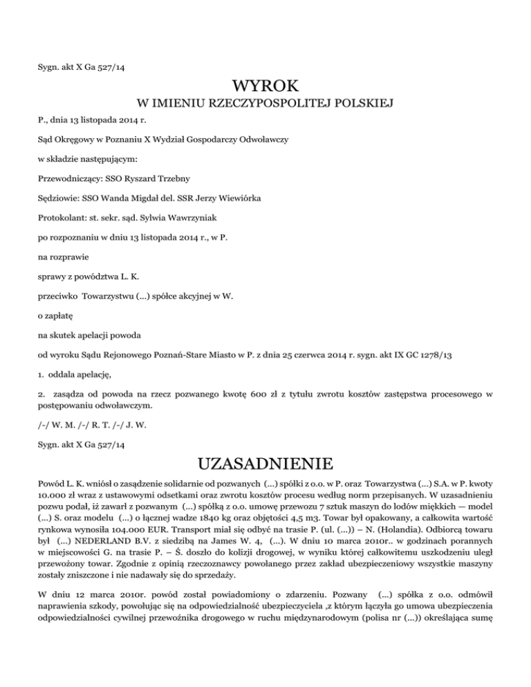 Sygn. akt X Ga 527/14 WYROK W IMIENIU RZECZYPOSPOLITEJ POLSKIEJ P., dnia 13 listopada 2014 r. Sąd Okręgowy w Poznaniu X Wydział Gospodarczy Odwoławczy w składzie następującym: Przewodniczący: SSO Ryszard Trzebny Sędziowie: SSO Wanda Migdał del. SSR Jerzy Wiewiórka Protokolant: st. sekr. sąd. Sylwia Wawrzyniak po rozpoznaniu w dniu 13 listopada 2014 r., w P. na rozprawie sprawy z powództwa L. K. przeciwko Towarzystwu (...) spółce akcyjnej w W. o zapłatę na skutek apelacji powoda od wyroku Sądu Rejonowego Poznań-Stare Miasto w P. z dnia 25 czerwca 2014 r. sygn. akt IX GC 1278/13 1. oddala apelację, 2. zasądza od powoda na rzecz pozwanego kwotę 600 zł z tytułu zwrotu kosztów zastępstwa procesowego w postępowaniu odwoławczym. /-/ W. M. /-/ R. T. /-/ J. W. Sygn. akt X Ga 527/14 UZASADNIENIE Powód L. K. wniósł o zasądzenie solidarnie od pozwanych (...) spółki z o.o. w P. oraz Towarzystwa (...) S.A. w P. kwoty 10.000 zł wraz z ustawowymi odsetkami oraz zwrotu kosztów procesu według norm przepisanych. W uzasadnieniu pozwu podał, iż zawarł z pozwanym (...) spółką z o.o. umowę przewozu 7 sztuk maszyn do lodów miękkich — model (...) S. oraz modelu (...) o łącznej wadze 1840 kg oraz objętości 4,5 m3. Towar był opakowany, a całkowita wartość rynkowa wynosiła 104.000 EUR. Transport miał się odbyć na trasie P. (ul. (...)) – N. (Holandia). Odbiorcą towaru był (...) NEDERLAND B.V. z siedzibą na James W. 4, (...). W dniu 10 marca 2010r.. w godzinach porannych w miejscowości G. na trasie P. – Ś. doszło do kolizji drogowej, w wyniku której całkowitemu uszkodzeniu uległ przewożony towar. Zgodnie z opinią rzeczoznawcy powołanego przez zakład ubezpieczeniowy wszystkie maszyny zostały zniszczone i nie nadawały się do sprzedaży. W dniu 12 marca 2010r. powód został powiadomiony o zdarzeniu. Pozwany (...) spółka z o.o. odmówił naprawienia szkody, powołując się na odpowiedzialność ubezpieczyciela ,z którym łączyła go umowa ubezpieczenia odpowiedzialności cywilnej przewoźnika drogowego w ruchu międzynarodowym (polisa nr (...)) określająca sumę ubezpieczenia na każde zdarzenie na kwotę 200.000 USD oraz umowa ubezpieczenia odpowiedzialności cywilnej przewoźnika drogowego w ruchu krajowym. (polisa numer (...)) ustalająca sumę ubezpieczenia na każde zdarzenie na kwotę 150.000 USD. (...) S.A. w P. przyznał odszkodowanie w wysokości 74.622,45 zł. W uzasadnieniu podał, iż art. 23 ust. 4 Konwencji CMR oraz zapis paragrafu 13 ustęp 7 Ogólnych Warunków Ubezpieczenia Operatora Transportowego wskazuje, że odszkodowanie nie może przekraczać równowartości 8,33 SDR za 1 kg masy brutto (1840 kg x 8,33 x 4,9335 PLN = 75.616,74 PLN). Zgodnie z umową (...) potrącono dodatkowo franszyzę redukcyjną równowartości 300 USD, a roszczenie o tę kwotę przysługuje bezpośrednio do przewoźnika. Powód nie zaakceptował stanowiska pozwanych i pismem z 12 lipca 2010r. wezwał ich do zapłaty brakującej kwoty tj. 352.474,35 zł. W jego ocenie zastosowanie w sprawie ma Konwencja CMR. Zgodnie z nią przewoźnik odpowiada za całkowite lub częściowe zaginięcie towaru lub za jego uszkodzenie, które nastąpiło w czasie między przyjęciem towaru a jego wydaniem, jak również za opóźnienie dostawy. Wyłączenie odpowiedzialności przewoźnika jest możliwe tylko wtedy, gdy zaginięcie, uszkodzenie lub opóźnienie spowodowane zostało winą osoby uprawnionej, wadą własną towaru lub okolicznościami, których przewoźnik nie mógł uniknąć i których następstwom nie mógł zapobiec (art. 17 ust. 2 Konwencji). W realiach niniejszej sprawy nie wystąpiła żadna okoliczność wyłączająca odpowiedzialność. Pismem procesowym doręczonym w dniu 23 października 2013r., pozwany Towarzystwo (...) S.A. w P. wniósł odpowiedź na pozew, żądając oddalenia powództwa. W uzasadnieniu przyznał, że w okresie od 29 stycznia 2010r. do 28 stycznia 2011r. łączyła go z (...) spółką z o.o. dobrowolna umowa ubezpieczenia jego odpowiedzialności cywilnej jako przewoźnika drogowego w ruchu międzynarodowym, potwierdzona polisą nr (...) z dnia 28 stycznia 2010r. Suma ubezpieczenia na każde zdarzenie wynosiła 200.000 USD, natomiast franszyza redukcyjna w każdej szkodzie została ustalona na kwotę 300 USD. Bezspornym jest, iż z tytułu szkody z 11 marca 2010r. wypłacono powodowi odszkodowanie w wysokości 74.622,45 zł. W świetle § 13 ust 7 OWU odszkodowanie za szkodę (zdefiniowaną w § 2 ust 11 pkt 1 w związku z § 4 ust 2 pkt 1 OWU) ustala się w kwocie odpowiadającej wysokości szkody, ale nie więcej niż równowartość 8,33 SDR za kilogram wagi brutto ładunku. Kolejną okolicznością bezsporną jest wartość fakturowa ładunku wynosząca kwotę 104.000 EUR oraz jego waga 1.840 kg brutto wskazana w poz. nr 11 listu CMR. W oparciu o § 13 ust. 14 OWU odszkodowanie wypłacane jest w złotych polskich, jeżeli poszkodowany posiada siedzibę na terytorium RP. Przeliczenia obcej waluty na złote polskie następuje przy zastosowaniu kursu średniego ogłaszanego przez Narodowy Bank Polski w dniu wystawienia polecenia wypłaty odszkodowania. Zgodnie z tabelą kursów średnich nr (...) z 21 maja 2010r., ustalono, że 1 Euro = 4,1428 zł, czyli 104.000 Euro jako wartość fakturowa ładunku = 430.851,20 zł, 1 USD = 3,3143 zł, czyli 300 USD franszyzy redukcyjnej = 994,29 zł, 1 SDR = 4,9335 zł, czyli 1.840 kg wagi brutto ładunku x 8,33 SDR/kg = 75.616,74 zł. Ze względu na fakt, iż wartość fakturowa ładunku przekracza przelicznik 8,33 SDR za kg wagi brutto, to – zgodnie z § 13, ust.7 OWU – ubezpieczyciel odpowiada za szkodę tylko do kwoty 75.616,74 zł, a odszkodowanie – po potraceniu franszyzy redukcyjnej (994,29 zł) zgodnie z § 13, ust. 9 OWU wynosi 74.622,45 zł, którą to kwotę przyznano powodowi. Pozwany podniósł również, iż odpowiedzialność wraz z (...) spółką z o.o. za
