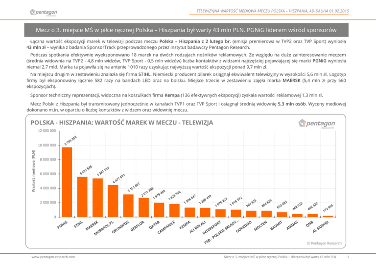 TELEWIZYJNA WARTOŚĆ MEDIOWA MECZU POLSKA – HISZPANIA, AD-DAUHA 01.02.2015 Mecz o 3. miejsce MŚ w piłce ręcznej Polska – Hiszpania był warty 43 mln PLN. PGNiG liderem wśród sponsorów Łączna wartość ekspozycji marek w telewizji podczas meczu Polska – Hiszpania z 2 lutego br. (emisja premierowa w TVP2 oraz TVP Sport) wyniosła 43 mln zł – wynika z badania SponsorTrack przeprowadzonego przez instytut badawczy Pentagon Research. Podczas spotkania efektywnie wyeksponowano 18 marek na dwóch rodzajach nośników reklamowych. Ze względu na duże zainteresowanie meczem (średnia widownia na TVP2 - 4,8 mln widzów, TVP Sport - 0,5 mln widzów) liczba kontaktów z widzami najczęściej pojawiającej się marki PGNiG wyniosła niemal 2,7 mld. Marka ta pojawiła się na antenie 1010 razy uzyskując najwyższą wartość ekspozycji ponad 9,7 mln zł. Na miejscu drugim w zestawieniu znalazła się firma STIHL. Niemiecki producent pilarek osiągnął ekwiwalent telewizyjny w wysokości 5,6 mln zł. Logotyp firmy był eksponowany łącznie 582 razy na bandach LED oraz na boisku. Miejsce trzecie w zestawieniu zajęła marka MAERSK (5,4 mln zł przy 560 ekspozycjach). Sponsor techniczny reprezentacji, widoczna na koszulkach firma Kempa (136 efektywnych ekspozycji) zyskała wartości reklamowej 1,3 mln zł. Mecz Polski z Hiszpanią był transmitowany jednocześnie w kanałach TVP1 oraz TVP Sport i osiągnął średnią widownię 5,3 mln osób. Wyceny mediowej dokonano m.in. w oparciu o liczbę kontaktów z widzem oraz widownię meczu. POLSKA - HISZPANIA: WARTOŚĆ MAREK W MECZU - TELEWIZJA 12 000 000 Wartość mediowa (PLN) 10 000 000 8 000 000 6 000 000 4 000 000 2 000 000 0 © Pentagon Research www.pentagon-research.com Mecz o 3. miejsce MŚ w piłce ręcznej Polska – Hiszpania był warty 43 mln PLN 1 TELEWIZYJNA WARTOŚĆ MEDIOWA MECZU POLSKA – HISZPANIA, AD-DAUHA 01.02.2015 TOP 18 - TELEWIZYJNA WARTOŚĆ MEDIOWA MAREK BRAND LICZBA KONTAKTÓW Z WIDZEM (MLN) LICZBA EFEKTYWNYCH EKSPOZYCJI WARTOŚĆ MEDIOWA (PLN) PGNIG 2674 1010 9 705 258 STIHL 1541 582 5 592 535 MAERSK 1483 560 5 381 133 MURAPOL.PL 1234 466 4 477 872 GRUNDFOS 868 328 3 151 807 GERFLOR 736 278 2 671 348 QATAR 545 206 1 979 488 CAMPANILE 503 190 1 825 742 KEMPA 360 136 1 306 847 ALI BIN ALI 349 132 1 268 410 INTERSPORT 297 112 1 076 227 PSB - POLSKIE SKŁADY BUDOWLANE 106 40 1 018 572 OOREDOO 238 90 864 825 MOLTEN 238 90 864 825 BAUMIT 180 68 653 423 ADIDAS 122 46 442 022 QNB 122 46 442 022 48 18 172 965 11643 4398 42 895 320 AL SIDDIQI SUMA Wybrane przykłady monitoringu SponsorTrack BRANDY EKSPONOWANE NA KOSZULKACH REPREZENTACJI POLSKI BRAND LICZBA KONTAKTÓW Z WIDZEM (MLN) LICZBA EFEKTYWNYCH EKSPOZYCJI WARTOŚĆ MEDIOWA (PLN) PGNIG 815 308 2 959 623 KEMPA 360 136 1 306 847 SUMA 1175 444 4 266 470 www.pentagon-research.com Mecz o 3. miejsce MŚ w piłce ręcznej Polska – Hiszpania był warty 43 mln PLN 2 TELEWIZYJNA WARTOŚĆ MEDIOWA MECZU POLSKA – HISZPANIA, AD-DAUHA 01.02.2015 Standardowe badanie opiera się o monitoring wystąpień poszczególnych marek w polskich stacjach telewizyjnych. Monitorowane są programy sportowe (w tym wiadomości), w których pokazywane są imprezy polskie bądź z udziałem polskich sportowców. Notowane są marki eksponowane na polskich zawodnikach i polskie marki eksponowane na zagranicznych zawodnikach. Bez wyjątków monitorowani są główni sponsorzy imprez organizowanych w Polsce. Wartość mediowa wyliczana jest w oparciu o średnie cpt dla monitorowanych stacji oraz średnią oglądalność programów tv, podczas których eksponowane były marki. Zliczane są tzw. ekspozycje efektywne, a więc takie, które są dobrze widoczne (wyraźne), trwają co najmniej 1 sekundę i nie są fragmentaryczne (min. 80% widoczności). Liczba kontaktów jest sumą iloczynów wystąpień danej marki ze średnią liczbą oglądających program będący przedmiotem monitoringu. Wartość mediowa pokazuje szacunkowy koszt, jaki należałoby ponieść chcąc uzyskać podobne GRP z wykorzystaniem konwencjonalnej reklamy. Dane telemetryczne: Nielsen Audience Measurement Raport został wykonany w ramach stałego badania Pentagon Sponsor Track monitorującego wystąpienia sponsorów podczas wydarzeń sportowych transmitowanych przez polskie stacje telewizyjne. Kontakt: Adam Pawlukiewicz [email protected] Metodologia: Marcin Suszycki [email protected] Pentagon Research ul. Świdnicka 21/23 50-066 Wrocław tel. +48 (71) 774 78 40 fax: +48 (71) 784 45 41 www.pentagon-research.com www.pentagon-research.com Mecz o 3. miejsce MŚ w piłce ręcznej Polska – Hiszpania był warty 43 mln PLN 3