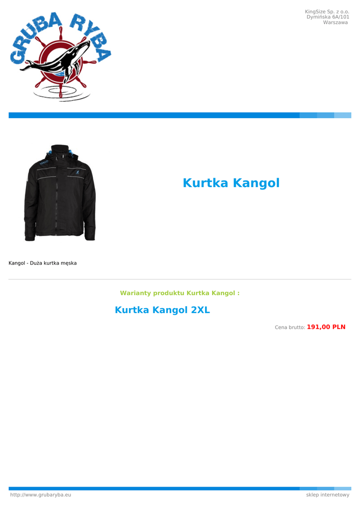 KingSize Sp. z o.o. Dymińska 6A/101 Warszawa Kurtka Kangol Kangol - Duża kurtka męska Warianty produktu Kurtka Kangol : Kurtka Kangol 2XL Cena brutto: http://www.grubaryba.eu 191,00 PLN sklep internetowy