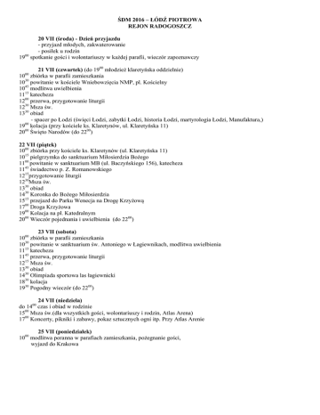 ŚDM 2016 – ŁÓDŹ PIOTROWA REJON RADOGOSZCZ 20 VII (środa) - Dzień przyjazdu - przyjazd młodych, zakwaterowanie - posiłek u rodzin 1900 spotkanie gości i wolontariuszy w każdej parafii, wieczór zapoznawczy 21 VII (czwartek) (do 1900 młodzież klaretyńska oddzielnie) 10 zbiórka w parafii zamieszkania 1030 powitanie w kościele Wniebowzięcia NMP, pl. Kościelny 1045 modlitwa uwielbienia 1115 katecheza 1200 przerwa, przygotowanie liturgii 1230 Msza św. 1330 obiad - spacer po Łodzi (święci Łodzi, zabytki Łodzi, historia Łodzi, martyrologia Łodzi, Manufaktura,) 1900 kolacja (przy kościele ks. Klaretynów, ul. Klaretyńska 11) 2000 Święto Narodów (do 2200) 00 22 VII (piątek) 1000 zbiórka przy kościele ks. Klaretynów (ul. Klaretyńska 11) 1015 pielgrzymka do sanktuarium Miłosierdzia Bożego 1100 powitanie w sanktuarium MB (ul. Baczyńskiego 156), katecheza 1145 świadectwo p. Z. Romanowskiego 1215przygotowanie liturgii 1230Msza św. 1330 obiad 1430 Koronka do Bożego Miłosierdzia 1515 przejazd do Parku Wenecja na Drogę Krzyżową 1700 Droga Krzyżowa 1900 Kolacja na pl. Katedralnym 2000 Wieczór pojednania i uwielbienia (do 2200) 23 VII (sobota) 1000 zbiórka w parafii zamieszkania 1030 powitanie w sanktuarium św. Antoniego w Łagiewnikach, modlitwa uwielbienia 1115 katecheza 1145 przerwa, przygotowanie liturgii 1215 Msza św. 1330 obiad 1430 Olimpiada sportowa las łagiewnicki 1830 kolacja 1930 Pogodny wieczór (do 2200) 24 VII (niedziela) do 1400 czas i obiad w rodzinie 1500 Msza św.(dla wszystkich gości, wolontariuszy i rodzin, Atlas Arena) 1700 Koncerty, pikniki i zabawy, pokaz sztucznych ogni itp. Przy Atlas Arenie 25 VII (poniedziałek) 1000 modlitwa poranna w parafiach zamieszkania, pożegnanie gości, wyjazd do Krakowa