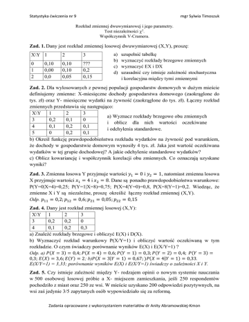 Statystyka ćwiczenia nr 9 mgr Sylwia Timoszuk Rozkład zmiennej dwuwymiarowej i jego parametry. Test niezależności χ2. Współczynnik V-Cramera. Zad. 1. Dany jest rozkład zmiennej losowej dwuwymiarowej (X,Y), proszę: X\Y 1 2 3 0 1 2 0,10 0,10 0,05 ??? 0,2 0,15 0,10 0,00 0,0 a) b) c) d) uzupełnić tabelkę wyznaczyć rozkłady brzegowe zmiennych wyznaczyć EX i DX uzasadnić czy istnieje zależność stochastyczna i korelacyjna między tymi zmiennymi Zad. 2. Dla wylosowanych z pewnej populacji gospodarstw domowych w dużym mieście definiujemy zmienne: X-miesięczne dochody gospodarstwa domowego (zaokrąglone do tys. zł) oraz Y- miesięczne wydatki na żywność (zaokrąglone do tys. zł). Łączny rozkład zmiennych przedstawia się następująco: X\Y 1 2 3 a) Wyznacz rozkłady brzegowe obu zmiennych 3 0,2 0,1 0 i oblicz dla nich wartości oczekiwane 4 0,1 0,2 0,1 i odchylenia standardowe. 5 0 0,2 0,1 b) Określ funkcję prawdopodobieństwa rozkładu wydatków na żywność pod warunkiem, że dochody w gospodarstwie domowym wynosiły 4 tys. zł. Jaka jest wartość oczekiwana wydatków w tej grupie dochodowej? A jakie odchylenie standardowe wydatków? c) Oblicz kowariancję i współczynnik korelacji obu zmiennych. Co oznaczają uzyskane wyniki? Zad. 3. Zmienna losowa Y przyjmuje wartości = 0 i = 1, natomiast zmienna losowa X przyjmuje wartości = 4 i = 8. Dane są ponadto prawdopodobieństwa warunkowe: P(Y=0|X=4)=0,25; P(Y=1|X=8)=0,75; P(X=4|Y=0)=0,8, P(X=8|Y=1)=0,2. Wiedząc, że zmienne X i Y są niezależne, proszę określić łączny rozkład zmiennej (X,Y). Odp. = 0,2; = 0,6; = 0,05; = 0,15 Zad. 4. Dany jest rozkład zmiennej losowej (X,Y): X\Y 1 2 3 3 0,2 0,2 0 4 0,1 0,2 0,3 a) Znaleźć rozkłady brzegowe i obliczyć E(X) i D(X). b) Wyznaczyć rozkład warunkowy P(X/Y=1) i obliczyć wartość oczekiwaną w tym rozkładzie. O czym świadczy porównanie wyników E(X) i E(X/Y=1) ? Odp. a) = 3 = 0,4; = 4 = 0,6; = 1 = 0,3; = 2 = 0,4; =3 = 0,3; = 3,6; = 2; b) = 3| = 1 = 0,67; = 4| = 1 = 0,33. E(X/Y=1) = 3,33; porównanie wyników E(X) i E(X/Y=1) świadczy o zależności X i Y. Zad. 5. Czy istnieje zależność między Y- rodzajem opinii o nowym systemie nauczania w 500 osobowej losowej próbie a X- miejscem zamieszkania, jeśli 250 respondentów pochodziło z miast oraz 250 ze wsi. W mieście uzyskano 200 odpowiedzi pozytywnych, na wsi zaś jedynie 3/5 zapytanych osób wypowiedziało się za reformą. Zadania opracowane z wykorzystaniem materiałów dr Anity Abramowskiej-Kmon Statystyka ćwiczenia nr 9 mgr Sylwia Timoszuk Rozkład zmiennej dwuwymiarowej i jego parametry. Test niezależności χ2. Współczynnik V-Cramera. Zad. 6. Na próbie losowej 1000 respondentów przeprowadzono sondaż opinii społecznej dotyczący skuteczności negocjacji rządowych ze związkami zawodowymi. Na podstawie uzyskanych wyników ustalono siłę zależności stochastycznej, między oceną skuteczności i płcią respondentów w tej próbie. Miarę tej zależności stanowił współczynnik Cramera V = 0,38. Czy zależność tę można uznać za statystycznie istotną, jeśli możliwe odpowiedzi respondentów to: negocjacje były skuteczne, negocjacje były nieskuteczne, nie mam zdania na ten temat? Odp.: = 144,4; , ; = 5,991; odrzucamy Zad. 7. W sondażu na temat przystąpienia Polski do Unii Europejskiej w pewnym województwie dla 200 wylosowanych niezależnie osób uzyskano następujące wyniki w zależności od miejsca zamieszkania respondentów: Akceptacja akcesji Miejsce zamieszkania Tak Nie Ogółem Miasto 80 20 100 Wieś 40 60 100 Razem 120 80 200 Czy akceptacja przystąpienia Polski do Unii Europejskiej zależy od miejsca zamieszkania? Odp.: = 33,3; , = 5,991; odrzucamy Zad. 8. Międzyuczelniane Biuro Śledcze zbadało przebieg studiów 200 wylosowanych absolwentów wyższych uczelni. Wśród zbadanych 30% przyznało, że ściągało podczas egzaminów. Czterdziestu ściągających weszło potem w konflikt z prawem. Stu zbadanych zawsze pisało egzaminy uczciwie i nigdy w przyszłości nie weszło w konflikt z prawem. Czy powyższe informacje upoważniają do twierdzenia, że wśród młodzieży akademickiej występuje zależność między faktem ściągania w trakcie egzaminów i kolizją z prawem w przyszłości? Odp.: = 23,65; , = 3,841; odrzucamy Zad. 9. Na podstawie zaprezentowanych w poniższej tablicy danych o potrzebie posiadania samochodu oraz potrzebie mieszkania a płcią 100 losowo wybranych kobiet i mężczyzn w wieku 20-25 lat oceń: a) Czy zależność ta jest istotna statystycznie przy poziomie istotności 0,05? b) Jaka jest siła tej zależności? Płeć Tak Nie Kobiety 20 20 Mężczyźni 50 10 Odp.: a) = 12,70; , ; = 3,84; odrzucamy; b) = 0,356 Zadania opracowane z wykorzystaniem materiałów dr Anity Abramowskiej-Kmon