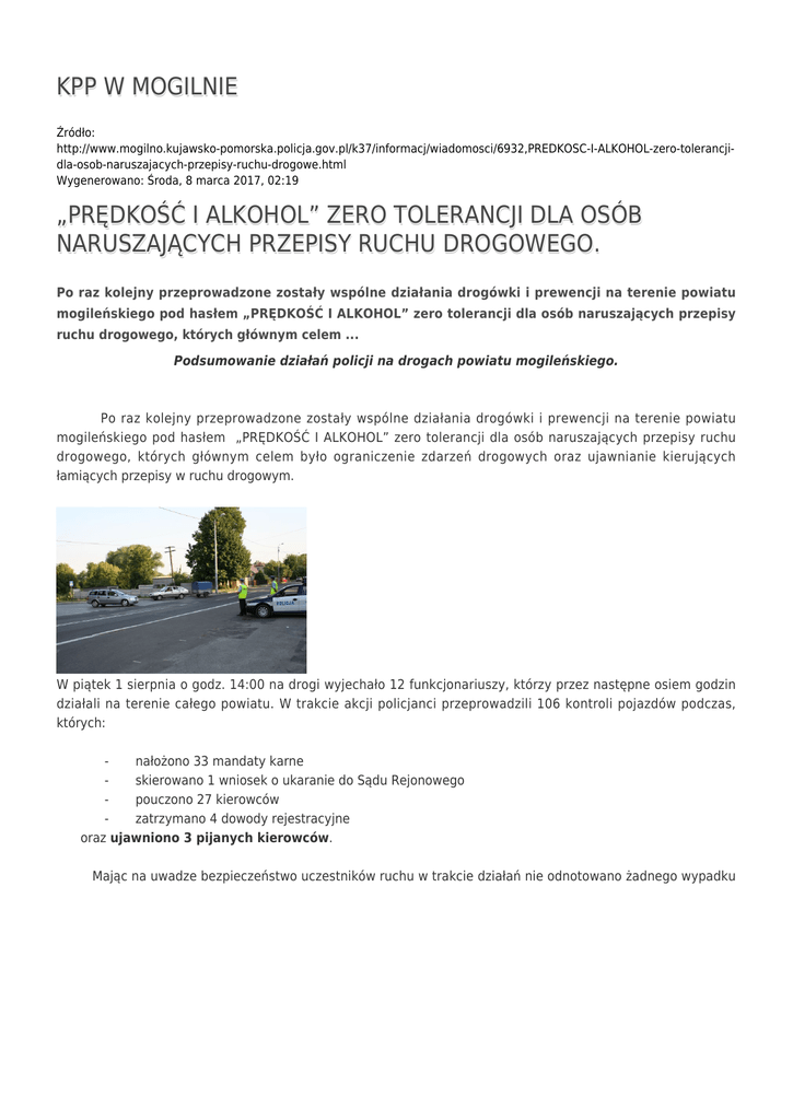 KPP W MOGILNIE Źródło: http://www.mogilno.kujawsko-pomorska.policja.gov.pl/k37/informacj/wiadomosci/6932,PREDKOSC-I-ALKOHOL-zero-tolerancjidla-osob-naruszajacych-przepisy-ruchu-drogowe.html Wygenerowano: Środa, 8 marca 2017, 02:19 „PRĘDKOŚĆ I ALKOHOL” ZERO TOLERANCJI DLA OSÓB NARUSZAJĄCYCH PRZEPISY RUCHU DROGOWEGO. Po raz kolejny przeprowadzone zostały wspólne działania drogówki i prewencji na terenie powiatu mogileńskiego pod hasłem „PRĘDKOŚĆ I ALKOHOL” zero tolerancji dla osób naruszających przepisy ruchu drogowego, których głównym celem ... Podsumowanie działań policji na drogach powiatu mogileńskiego. Po raz kolejny przeprowadzone zostały wspólne działania drogówki i prewencji na terenie powiatu mogileńskiego pod hasłem „PRĘDKOŚĆ I ALKOHOL” zero tolerancji dla osób naruszających przepisy ruchu drogowego, których głównym celem było ograniczenie zdarzeń drogowych oraz ujawnianie kierujących łamiących przepisy w ruchu drogowym. W piątek 1 sierpnia o godz. 14:00 na drogi wyjechało 12 funkcjonariuszy, którzy przez następne osiem godzin działali na terenie całego powiatu. W trakcie akcji policjanci przeprowadzili 106 kontroli pojazdów podczas, których: nałożono 33 mandaty karne skierowano 1 wniosek o ukaranie do Sądu Rejonowego pouczono 27 kierowców zatrzymano 4 dowody rejestracyjne oraz ujawniono 3 pijanych kierowców. Mając na uwadze bezpieczeństwo uczestników ruchu w trakcie działań nie odnotowano żadnego wypadku drogowego – zaistniała jedna kolizja. Powyższe statystyki ukazują nam, że nadal kierowcy nie stosują się do podstawowych przepisów ruchu drogowego, dlatego też takie działania powtarzane będą na terenie naszego powiatu do czasu uzyskania poprawy Waszego bezpieczeństwa. Informację opracował: Referent Sekcji Prewencji sierż.szt. Jarosław Bucholc Autor: mogilno Publikacja: mogilno Ocena: 0/5 (0) Tweetnij