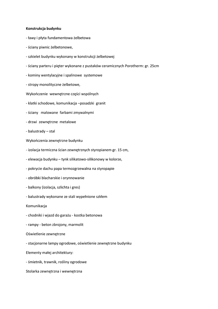 Konstrukcja budynku - ławy i płyta fundamentowa żelbetowa - ściany piwnic żelbetonowe, - szkielet budynku wykonany w konstrukcji żelbetowej - ściany parteru i pięter wykonane z pustaków ceramicznych Porotherm: gr. 25cm - kominy wentylacyjne i spalinowe systemowe - stropy monolityczne żelbetowe, Wykończenie wewnętrzne części wspólnych - klatki schodowe, komunikacja –posadzki granit - ściany malowane farbami zmywalnymi - drzwi zewnętrzne metalowe - balustrady – stal Wykończenia zewnętrzne budynku - izolacja termiczna ścian zewnętrznych styropianem gr. 15 cm, - elewacja budynku – tynk silikatowo-silikonowy w kolorze, - pokrycie dachu papa termozgrzewalna na styropapie - obróbki blacharskie i orynnowanie - balkony (izolacja, szlichta i gres) - balustrady wykonane ze stali wypełnione szkłem Komunikacja - chodniki i wjazd do garażu - kostka betonowa - rampy - beton zbrojony, marmolit Oświetlenie zewnętrzne - stacjonarne lampy ogrodowe, oświetlenie zewnętrzne budynku Elementy małej architektury: - śmietnik, trawnik, rośliny ogrodowe Stolarka zewnętrzna i wewnętrzna - okna – profil PCV, - parapety zewnętrzne - drzwi zewnętrzne aluminiowe z profili aluminiowych ciepłych - brama wjazdowa do garażu segmentowa, ocieplana, otwierana mechanicznie za pomocą napędu elektrycznego, otwierana zdalnie pilotem na podczerwień. Wykończenia wewnętrzne - ściany działowe murowane z cegły ceramicznej Porotherm gr. 8 cm - wykończenie ścian i sufitów tynk gipsowy maszynowy kat III - podłogi zbrojona szlichta cementowa z izolacją dźwiękochłonną - parapety okienne wewnętrzne Stolarka drzwiowa wewnętrzna - drzwi wejściowe do mieszkań – antywłamaniowe, skrzydło pełne Instalacja sanitarna - instalacja centralnego ogrzewania i grzejniki stalowe dwupłytowe - instalacja ciepłej wody - instalacja wody zimnej - instalacja kanalizacji sanitarnej