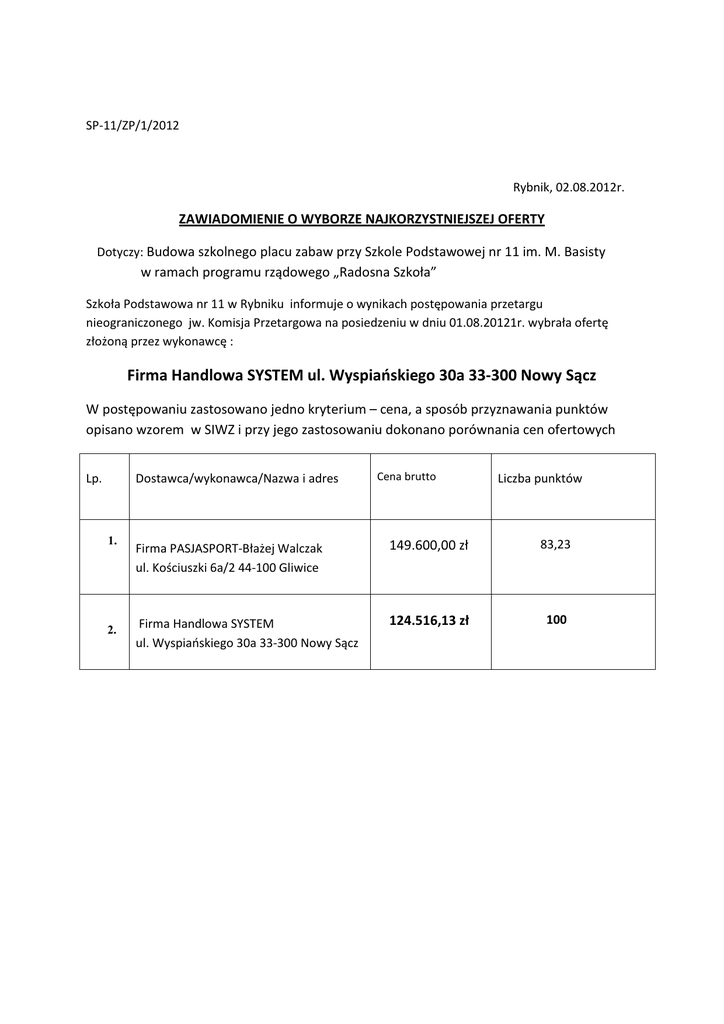 SP-11/ZP/1/2012 Rybnik, 02.08.2012r. ZAWIADOMIENIE O WYBORZE NAJKORZYSTNIEJSZEJ OFERTY Dotyczy: Budowa szkolnego placu zabaw przy Szkole Podstawowej nr 11 im. M. Basisty w ramach programu rządowego „Radosna Szkoła” Szkoła Podstawowa nr 11 w Rybniku informuje o wynikach postępowania przetargu nieograniczonego jw. Komisja Przetargowa na posiedzeniu w dniu 01.08.20121r. wybrała ofertę złożoną przez wykonawcę : Firma Handlowa SYSTEM ul. Wyspiańskiego 30a 33-300 Nowy Sącz W postępowaniu zastosowano jedno kryterium – cena, a sposób przyznawania punktów opisano wzorem w SIWZ i przy jego zastosowaniu dokonano porównania cen ofertowych Lp. Dostawca/wykonawca/Nazwa i adres 1. 2. Cena brutto Liczba punktów Firma PASJASPORT-Błażej Walczak ul. Kościuszki 6a/2 44-100 Gliwice 149.600,00 zł 83,23 Firma Handlowa SYSTEM ul. Wyspiańskiego 30a 33-300 Nowy Sącz 124.516,13 zł 100