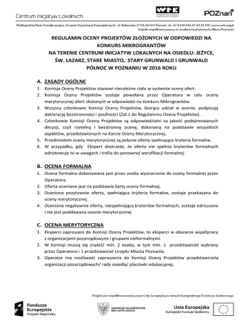REGULAMIN OCENY PROJEKTÓW ZŁOŻONYCH W ODPOWIEDZI NA KONKURS MIKROGRANTÓW NA TERENIE CENTRUM INICJATYW LOKALNYCH NA OSIEDLU: JEŻYCE, ŚW. ŁAZARZ, STARE MIASTO, STARY GRUNWALD I GRUNWALD PÓŁNOC W POZNANIU W 2016 ROKU A. ZASADY OGÓLNE 1. Komisja Oceny Projektów stanowi niezależne ciało w systemie oceny ofert. 2. Komisja Oceny Projektów zostaje powołana przez Operatora w celu oceny merytorycznej ofert złożonych w odpowiedzi na Konkurs Mikrograntów. 3. Wszyscy członkowie Komisji Oceny Projektów, biorący udział w ocenie, podpisują deklarację bezstronności i poufności (Zał.1 do Regulaminu Oceny Projektów). 4. Członkowie Komisji Oceny Projektów są odpowiedzialni za jakośd podejmowanych decyzji, czyli rzetelną i bezstronną ocenę, dokonaną na podstawie wszystkich aspektów, przedstawionych na Karcie Oceny Merytorycznej. 5. Przedmiotem oceny merytorycznej są jedynie oferty spełniające kryteria formalne. 6. W przypadku, gdy Ekspert dostrzeże, że oferta nie spełnia kryteriów formalnych odnotowuje to w uwagach i trafia do ponownej weryfikacji formalnej. B. OCENA FORMALNA 1. Ocena formalna dokonywana jest przez osoby wyznaczone do oceny formalnej przez Operatora. 2. Oferta oceniana jest na podstawie karty oceny formalnej. 3. Oceniona pozytywnie oferta, spełniająca kryteria formalne, zostaje przekazana do oceny merytorycznej. 4. Oceniona negatywnie oferta, niespełniająca kryteriów formalnych, zostaje odrzucona i nie jest poddawana ocenie merytorycznej C. OCENA MERYTORYCZNA 1. Eksperci zaproszeni do Komisji Oceny Projektów, to eksperci w obszarze współpracy z organizacjami pozarządowymi i grupami nieformalnymi. 2. W Komisji muszą się znaleźd min. 2 osoby, w tym min. 1 przedstawiciel wybrany przez Operatora i 1 przedstawiciel Urzędu Miasta Poznania. 3. Operator ma możliwośd zaproszenia do Komisji Oceny Projektów przedstawiciela organizacji pozarządowych/ rady osiedla/ placówki edukacyjnej. TRYB OCENY 1. Na etapie oceny merytorycznej ofert obowiązuje indywidualny tryb oceny przez każdego z ekspertów. 2. Ekspert zobowiązuje się dokonad oceny osobiście, profesjonalnie, z należytą starannością. 3. Ocena ofert dokonywana jest przy wykorzystaniu Karty Oceny Merytorycznej Fiszki Projektowej, której wzór stanowi załącznik nr 3 do Regulaminu Konkursu Mikrograntów. 4. W Karcie Oceny Merytorycznej w kolumnie "Ocena eksperta" ekspert wpisuje, jaką ocenę przyznaje wraz z uzasadnieniem odjęcia/przyznania punktów przy poszczególnych elementach. 5. Karty oceny, bez danych osobowych eksperta oceniającego, będą udostępniane na życzenie potencjalnym realizatorom. 6. Ekspert dokonuje oceny merytorycznej na podstawie treści zawartych w fiszce projektowej. 7. Ekspert może rekomendowad przyznanie mikrograntu w pełnej lub niepełnej kwocie wnioskowanej przez oferenta. a. Jeżeli każdy z Ekspertów zarekomendował inną kwotę dofinansowania dla jednej oferty, decyzję o wysokości przyznanej kwoty podejmuje Operator. 8. Oceniający potwierdza dokonanie oceny podpisem na Karcie Oceny Merytorycznej Fiszki Projektowej we wskazanym miejscu. 9. Każda oferta jest oceniana przez dwóch ekspertów. 10. Ocena koocowa stanowi średnią z dwóch ocen ekspertów. 11. Oceniający potwierdza dokonanie oceny podpisem na Karcie Oceny Merytorycznej we wskazanym miejscu. 12. Operator sporządza protokół w którym wskazuje oferty do dofinansowania wraz z przyznaną kwotą. D. WYNIKI OCENY 1. Operator na podstawie ocen Komisji Oceny Projektów zawartych w protokole przedstawi listę rankingową ofert do dofinansowania. 2. Na liście rankingowej znajdą się wszystkie oferty ocenione merytorycznie i formalnie. 3. W przypadku uzyskania przez oferty równej liczby punktów o kolejności na liście rankingowej decyduje Operator. 4. Lista rankingowa w podziale zawierad będzie następujące informacje: a. numer oferty; b. nazwa oferenta; c. tytuł projektu; d. przyznana kwota mikrograntu. 5. Listy rankingowe ułożone są w 3 obszarach: a. „Oferty pozytywnie ocenione, uzyskane dofinansowanie”, b. „Oferty pozytywnie ocenione, niedofinansowane z powodu braku środków”, c. „Oferty negatywnie ocenione pod względem formalnym”. 6. Po zatwierdzeniu listy rankingowej przez Operatora następuje ogłoszenie wyników konkursu. 7. Lista rankingowa ofert przeznaczonych do dofinansowania zostanie opublikowana na stronie internetowej Operatora www.wrk.org.pl co najmniej 5 dni kalendarzowych przed datą rozpoczęcia realizacji mikrograntów. 8. Nie ma możliwości odwołania od ocen merytorycznych, na podstawie których sporządzona zostaje lista ofert przeznaczonych do dofinansowania. E. KONTAKT Z OFERENTEM 1. Po ogłoszeniu listy rankingowej Operator kontaktuje się z potencjalnymi realizatorami. 2. W przypadku, gdy wnioskowana w ofercie kwota dofinansowania będzie różnid się od przyznanej kwoty mikrograntu, realizator przesyła zmodyfikowaną fiszkę projektową dostosowaną do uwag Komisji Oceny Projektów. 3. Niezłożenie poprawionej fiszki projektowej w terminie 5 dni kalendarzowych oznacza rezygnację z ubiegania się o dofinansowanie realizacji mikrograntu ze środków konkursu. 4. Kwota mikrograntu przyznana przez Operatora jest kwotą ostateczną. 5. W przypadku rezygnacji z podpisania umowy decyzję o rezygnacji należy przekazad niezwłocznie do Operatora w formie pisemnej, nie później niż 5 dni kalendarzowych od dnia otrzymania informacji o przyjęciu projektu do realizacji. 6. W przypadku uwolnienia środków, wynikającego z rezygnacji z realizacji zadania przez oferenta, którego oferta została przeznaczona do dofinansowania, dofinansowanie otrzymuje kolejna oferta, zgodnie z przyznaną punktacją. 7. W przypadku równej liczby punktów dofinansowanie otrzymuje oferta, której przyznana kwota mikrograntu jest bliższa kwocie uwolnionych środków lub decyzją Operatora w przypadku takiej samej kwoty dofinansowania.