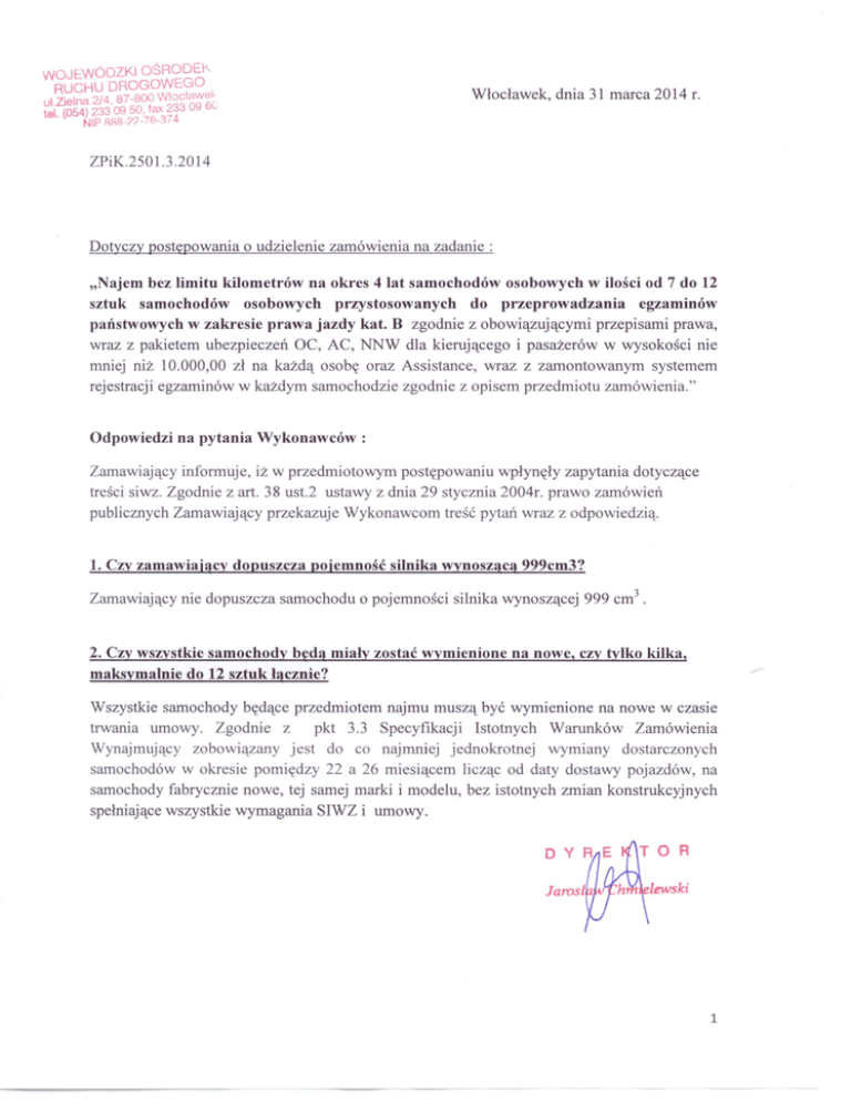 WOJEWÓDZKI OŚRODEI RUCHU DROGOWEGO ul Zielna 2/4. 87 -800 Wloclaw ~ tei (054) 233 09 50. fax 233 09 6(. . Włocławek, dnia 31 marca 2014 r. NIP AA8 ??-76-374 ZPiK.250 1.3.20 14 Dotyczy postępowania o udzielenie zamówienia na zadanie: "Najem bez limitu kilometrów na okres 4 lat samochodów osobowych w ilości od 7 do 12 sztuk samochodów osobowych przystosowanych do przeprowadzania egzaminów państwowych w zakresie prawa jazdy kat. B zgodnie z obowiązującymi przepisami prawa, wraz z pakietem ubezpieczeń OC, AC, NNW dla kierującego i pasażerów w wysokości nie mniej niż 10.000,00 zł na każdą osobę oraz Assistance, wraz z zamontowanym systemem rejestracji egzaminów w każdym samochodzie zgodnie z opisem przedmiotu zamówienia." Odpowiedzi na pytania Wykonawców: Zamawiający informuje iż w przedmiotowym postępowaniu wpłynęły zapytania dotyczące treści siwz. Zgodnie z art. 38 ust.2 ustawy z dnia 29 stycznia 2004r. prawo zamówień publicznych Zamawiający przekazuje Wykonawcom treść pytań wraz z odpowiedzią. 1. Czy zamawiający dopuszcza pojemność silnika wynoszącą 999cm3? Zamawiający nie dopuszcza samochodu o pojemności silnika wynoszącej 999 crrr' _ 2. Czy wszystkie samochody będą miały zostać wymienione na nowe, czy tylko kilka, maksymalnie do 12 sztuk łącznie? Wszystkie samochody będące przedmiotem najmu muszą być wymienione na nowe w czasie trwania umowy. Zgodnie z pkt 3.3 pecyfikacji Istotnych Warunków Zamówienia Wynajmujący zobowiązany jest do co najmniej jednokrotnej wymiany dostarczonych samochodów w okresie pomiędzy 22 a 26 mie iącem licząc od daty dostawy pojazdów, na samochody fabrycznie nowe, tej samej marki i modelu, bez istotnych zmian konstrukcyjnych spełniające wszystkie wymagania SIWZ i umowy. lewski 1