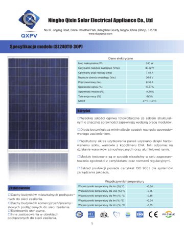 Ningbo Qixin Solar Electrical Appliance Co., Ltd No.37, Jingang Road, Binhai Industrial Park, Xiangshan County, Ningbo, China (Chiny), 315700 www.nbqxsolar.com Specyfikacja modelu (SL240TU-30P) Dane elektryczne Moc maksymalna (W) 240 W Optymalne napięcie zasilające (Vmp) 30,72 V Optymalny prąd roboczy (Imp) 7,81 A Napięcie obwodu otwartego (Voc) 36,6 V Prąd zwarciowy (Isc) 8,36 A Sprawność ogniw (%) 16,77% Sprawność modułu (%) 14,78% Tolerancja mocy (%) 0±3% NOCT 47°C +/-2°C Korzyści ¤Wysokiej jakości ogniwa fotowoltaiczne ze szkłem strukturalnym o znacznej sprawności zapewniają wydajną pracę modułów. ¤Dioda bocznikująca minimalizuje spadek napięcia spowodowanego zacienieniem. ¤Wydłużony okres użytkowania paneli uzyskano dzięki hartowanemu szkłu, warstwie z kopolimeru EVA, folii odpornej na działanie warunków atmosferycznych oraz aluminiowej ramie. ¤Moduły testowane są w sposób niezależny w celu zagwarantowania zgodności z certyfikatami oraz normami regulacyjnymi. ¤Zakład produkcji posiada certyfikat ISO 9001 dla systemów zarządzania jakością. Współczynniki temperatury Współczynniki temperatury dla Isc (%) °C +0,04 Współczynniki temperatury dla Voc (%) °C -0,35 ¤Dachy budynków mieszkalnych podłączo- Współczynniki temperatury dla Pm (%) °C nych do sieci zasilania. Współczynniki temperatury dla Im (%) °C ¤Dachy budynków komercyjnych/przemyWspółczynniki temperatury dla Vm (%) °C słowych podłączonych do sieci zasilania. ¤Elektrownie słoneczne. ¤Inne zastosowania w obiektach podłączonych do sieci zasilania. -0,45 Zastosowanie 1 +0,04 -0,35 Ningbo Qixin Solar Electrical Appliance Co., Ltd No.37, Jingang Road, Binhai Industrial Park, Xiangshan County, Ningbo, China (Chiny), 315700 www.nbqxsolar.com Specyfikacja modelu (SL240TU-30P) Elementy i dane mechaniczne Ogniwo fotowoltaiczne Polikrystaliczne, 156*156 Liczba ogniw (szt.) 6*10 Wymiary modułu (mm) 1640*990*40 Grubość przedniej powłoki szklanej (mm) 3,2 Maksymalne obciążenie mechaniczne 2400-5400 Pa Dopuszczalne obciążenie opadami (grad) 23 m/s; 7,53 g Waga pojedynczej jednostki (kg) 18,6 Rodzaj skrzynki przyłączeniowej Certyfikat TUV Napięcie znamionowe diody boczn. (A) 12 Rodzaj przewodów i złączy Certyfikat TUV Rama (materiał, narożniki itd.) 40# Materiał podłoża (rodzaj, marka) TPT Zakres temperatur -40°C do +85°C Współczynnik wypełnienia (%) 70-76% Standardowe warunki testowe AM 1.5 1000 W/m2 25 +/-2°C Gwarancja i certyfikaty Gwarancja 25 lat ograniczonej gwarancji na wydajność modułów 10 lat ograniczonej gwarancji na wykonanie modułów Certyfikaty IEC 61215, IEC 61730 Opakowanie Opakowanie Pojemnik drewniany 1*20 14 palet / 332 szt. 1 kontener 40-stopowy HQ 28 palet / 840 szt. Rysunek techniczny Kabel – 900 mm Kabel + 900 mm © 2012 Ningbo Qixin Solar Electrical Appliance Co., Ltd. Wszelkie prawa zastrzeżone. Dane przedstawione w niniejszym dokumencie mogą ulec zmianie bez wcześniejszego powiadomienia. 2