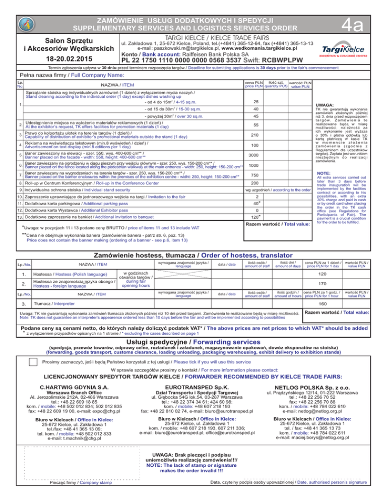 4a ZAMÓWIENIE US£UG DODATKOWYCH I SPEDYCJI SUPPLEMENTARY SERVICES AND LOGISTICS SERVICES ORDER TARGI KIELCE / KIELCE TRADE FAIRS Salon Sprzêtu ul. Zak³adowa 1, 25-672 Kielce, Poland, tel.(+4841) 365-12-64, fax (+4841) 365-13-13 e-mail: [email protected], www.wedkomania.targikielce.pl i Akcesoriów Wêdkarskich Konto / Bank account: Raiffeisen Bank Polska SA 18-20.02.2015 PL 22 1750 1110 0000 0000 0568 3537 Swift: RCBWPLPW Termin zg³oszenia up³ywa w 30 dniu przed terminem rozpoczêcia targów / Deadline for submitting applications is 30 days prior to the fair’s commencement Pe³na nazwa firmy / Full Company Name: Lp. No. 1. iloœæ szt. wartoœæ PLN cena PLN price PLN quantity PCS value PLN NAZWA / ITEM Sprz¹tanie stoiska wg indywidualnych zamówieñ (1 dzieñ) z wy³¹czeniem mycia naczyñ / Stand cleaning according to the individual order (1 day) except dishes washing up - od 4 do 15m2 / 4-15 sq.m. 25 - od 15 do 30m2 / 15-30 sq.m. 40 - powy¿ej 30m2 / over 30 sq.m. 45 Udostêpnienie miejsca na wy³o¿enie materia³ów reklamowych (1 dzieñ) / 2. At the exhibitor’s request, TK offers facilities for promotion materials (1 day) UWAGA: TK nie gwarantuj¹ wykonania zamówieñ z³o¿onych póŸniej ni¿ 3. dnia przed rozpoczêciem t a r g ó w. Z a m ó w i e n i a t e realizowane bêd¹ w miarê mo¿liwoœci; nale¿noœæ za ich wykonanie jest wy¿sza o 30% i p³atna gotówk¹ lub kart¹ p³atnicz¹ w kasie TK w momencie z³o¿enia zamówienia (zgodnie z Regulaminem dla uczestników targów). Zap³ata jest warunkiem niezbêdnym do realizacji zamówienia. 55 3. Prawo do kolporta¿u ulotek na terenie targów (1 dzieñ) / Capability of distribution of exhibitor’s promotional materials outside the stand (1 day) 210 4. Reklama na wyœwietlaczu tekstowym (min.8 wyœwietleñ / dzieñ) / Advertisement on text display (min.8 editions per 1 day) 100 5. Baner zawieszony na elewacji - szer. 550, wys. 400-600 cm** / Banner placed on the facade - width: 550, height: 400-600 cm** 3000 Baner zawieszany na ogrodzeniu w ci¹gu pieszym przy wejœciu g³ównym - szer. 250, wys. 150-200 cm** / 6. Banner placed on the fence located along the pedestrian walkway at the main entrance - width: 250, height: 150-200 cm** 1000 Baner zawieszany na wygrodzeniach na terenie targów - szer. 250, wys. 150-200 cm** / 7. Banner placed on the barrier enclosures within the premises of the exhibition centre - widht: 250, height: 150-200 cm** 750 8. Roll-up w Centrum Konferencyjnym / Roll-up in the Conference Center 200 9. Indywidualna ochrona stoiska / Individual stand security NOTE: wg uzgodnieñ / according to the order 2 10. Zaproszenie uprawniaj¹ce do jednorazowego wejœcia na targi / Invitation to the fair 40* 11. Dodatkowa karta parkingowa / Additional parking pass 12. Dodatkowa karta Wystawca / Additional Exhibitor pass 0 120* 13. Dodatkowe zaproszenie na bankiet / Additional invitation to banquet Razem wartoœæ / Total value: *Uwaga: w pozycjach 11 i 13 podano ceny BRUTTO / price of items 11 and 13 include VAT **Cena nie obejmuje wykonania banera (zamówienie banera - patrz str. 6, poz. 13) All extra services carried out later than 3 days before trade inauguration will be implemented by the facilities contract or according to his possibilities, with an extra 30% charge and paid in cash or by credit card when placing the order in the TK cash office (see Regulations for Participants of Fair). The payment is a crucial condition for the order to be fulfilled. Price does not contain the banner making (ordering of a banner - see p.6, item 13) Zamówienie hostess, t³umacza / Order of hostess, translator data / date iloœæ osób / amount of staff iloœæ dni / amount of days w godzinach otwarcia targów / during fair Hostessa ze znajomoœci¹ jêzyka obcego / opening hours Hostess - foreign language 1. Lp./No. wartoœæ PLN / value PLN 170 wymagana znajomoœæ jêzyka / language NAZWA / ITEM cena PLN za 1 dzieñ / price PLN for 1 day 120 Hostessa / Hostess (Polish language) 2. 3. wymagana znajomoœæ jêzyka / language NAZWA / ITEM Lp./No. data / date iloœæ osób / amount of staff iloœæ godzin / cena PLN za 1 godz. / amount of hours price PLN for 1 hour T³umacz / Interpreter wartoœæ PLN / value PLN 160 Uwaga: TK nie gwarantuj¹ wykonania zamówieñ t³umacza z³o¿onych póŸniej ni¿ 10 dni przed targami. Zamówienia te realizowane bêd¹ w miarê mo¿liwoœci. Note: TK does not guarantee an interpreter’s appearence ordered less than 10 days before the fair and will be implemented according to possibilities Razem wartoœæ / Total value: Podane ceny s¹ cenami netto, do których nale¿y doliczyæ podatek VAT* / The above prices are net prices to which VAT* should be added * z wy³¹czeniem przypadków opisanych na 1 stronie / * excluding the cases described on page 1 Us³ugi spedycyjne / Forwarding services (spedycja, przewóz towarów, odprawy celne, roz³adunek i za³adunek, magazynowanie opakowañ, dowóz eksponatów na stoiska) (forwarding, goods transport, customs clearance, loading unloading, packaging warehousing, exhibit delivery to exhibition stands) Prosimy zaznaczyæ, jeœli bêd¹ Pañstwo korzystali z tej us³ugi / Please tick if you will use this service W sprawie szczegó³ów prosimy o kontakt / For more information please contact: LICENCJONOWANY SPEDYTOR TARGÓW KIELCE / FORWARDER RECOMMENDED BY KIELCE TRADE FAIRS: C.HARTWIG GDYNIA S.A. EUROTRANSPED Sp.K. NETLOG POLSKA Sp. z o.o. Warszawa Branch Office Al. Jerozolimskie 212A, 02-486 Warszawa tel.: +48 22 609 18 85 kom. / mobile: +48 502 012 834; 502 012 835 fax: +48 22 609 19 00, e-mail: [email protected] Dzia³ Transportu i Spedycji Targowej ul. G³êbocka 54G lok.54, 03-287 Warszawa tel.: +48 22 374 34 61; 424 60 98; kom. / mobile: +48 607 218 193 fax: +48 22 810 02 74, e-mail: [email protected] ul. Pr¹dzyñskiego 12/14, 01-222 Warszawa tel.: +48 22 256 70 52 fax: +48 22 256 70 88 kom. / mobile: +48 784 022 610 e-mail: [email protec