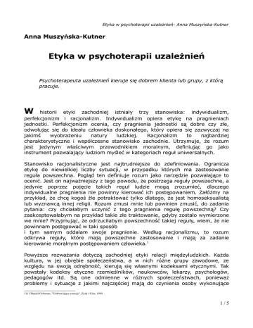 Etyka w psychoterapii uzależnień- Anna Muszyńska-Kutner Anna Muszyńska-Kutner Etyka w psychoterapii uzależnień Psychoterapeuta uzależnień kieruje się dobrem klienta lub grupy, z którą pracuje. W historii etyki zachodniej istniały trzy stanowiska: indywidualizm, perfekcjonizm i racjonalizm. Indywidualizm opiera etykę na pragnieniach jednostki. Perfekcjonizm ocenia, czy pragnienia jednostki są dobre czy złe, odwołując się do ideału człowieka doskonałego, który opiera się zazwyczaj na jakimś wyobrażeniu natury ludzkiej. Racjonalizm to najbardziej charakterystyczne i współczesne stanowisko zachodnie. Utrzymuje, że rozum jest jedynym właściwym przewodnikiem moralnym, definiując go jako instrument pozwalający ludziom myśleć w kategoriach reguł uniwersalnych. Stanowisko racjonalistyczne jest najtrudniejsze do zdefiniowania. Ogranicza etykę do niewielkiej liczby sytuacji, w przypadku których ma zastosowanie reguła powszechna. Pogląd ten definiuje rozum jako narzędzie pozwalające to ocenić. Jest on najważniejszy z tego powodu, że postrzega reguły powszechne, a jedynie poprzez pojęcie takich reguł ludzie mogą zrozumieć, dlaczego indywidualne pragnienia nie powinny kierować ich postępowaniem. Załóżmy na przykład, że chcę kogoś źle potraktować tylko dlatego, że jest homoseksualistą lub wyznawcą innej religii. Rozum zmusi mnie lub powinien zmusić, do zadania pytania: czy chciałabym uczynić z tego pragnienia regułę powszechną? Czy zaakceptowałabym na przykład takie złe traktowanie, gdyby zostało wymierzone we mnie? Przyjmując, że odrzuciłabym powszechność takiej reguły, wiem, że nie powinnam postępować w taki sposób i tym samym oddalam swoje pragnienie. Według racjonalizmu, to rozum odkrywa reguły, które mają powszechne zastosowanie i mają za zadanie kierowanie moralnym postępowaniem człowieka.1 Powyższe rozważania dotyczą zachodniej etyki relacji międzyludzkich. Każda kultura, w jej obrębie społeczeństwa, a w nich różne grupy zawodowe, ze względu na swoją odrębność, kierują się własnymi kodeksami etycznymi. Tak powstały kodeksy etyczne rzemieślników, naukowców, lekarzy, psychologów, pedagogów itd. Są one odmienne w różnych społeczeństwach, ponieważ problemy i sytuacje z jakimi najczęściej mają do czynienia osoby wykonujące 11) J Daniel Goleman, "Uzdrawiające emocje", Zysk i S-ka, 1999 1/5 Etyka w psychoterapii uzależnień- Anna Muszyńska-Kutner określony zawód, są określone ich specyfiką. We współczesnym świecie, z jego różnorodnością i pogłębiającą się dysproporcją w rozwoju poszczególnych obszarów, trudno wyobrazić sobie możliwość posługiwania się uniwersalnym kodeksem etycznym. Nie należy jednak zapominać, że u podstaw każdego szczegółowego kodeksu danej grupy zawodowej powinny leżeć ogólnoludzkie zasady etyczne. Fundamentalna zasada metafizyki moralności, według Immanuela Kanta, sugeruje, żeby postępować "tak jakby zasada, którą się kierujesz, miała mocą twej woli stać się prawem powszechnym". Od niedawna istnieje w Polsce nowa grupa zawodowa - psychoterapeutów uzależnień. Odbyły się już pierwsze egzaminy i zostały przyznane certyfikaty potwierdzające wymagany od psychoterapeuty uzależnień zasób wiedzy i umiejętności do pracy z osobami uzależnionymi oraz członkami ich rodzin. Jakimi zasadami etycznymi powinien kierować się polski psychoterapeuta uzależnień? Czy kodeks etyczny amerykańskiego terapeuty uzależnień uwzględnia specyfikę naszej kultury i naszego kraju? Czy kodeks etyczny polskiego psychologa uwzględnia specyfikę problemów z jakimi styka się polski psychoterapeuta uzależnień? Moja odpowiedź brzmi: nie w pełni (dyskusja nad różnicami nie jest tematem tego artykułu). Uważam, że istnieje potrzeba opracowania rodzimego kodeksu etycznego psychoterapeuty uzależnień. Spróbuję w dużym uproszczeniu sformułować zasady etyczne, którymi w obecnych czasach w Polsce mógłby kierować się psychoterapeuta uzależnień. Zasada 1. Dobro klienta Psychoterapeuta uzależnień kieruje się dobrem klienta lub grupy, z którą pracuje. W przypadku gdy pracuje z klientem, który wchodzi w konflikt z jego pracodawcą, sam sobie określa granice lojalności i odpowiedzialności w stosunku do każdej ze stron konfliktu. W przypadku konfliktu pomiędzy klientem a zespołem terapeutycznym, w pierwszym rzędzie kieruje się dobrem klienta. Podejmuje decyzję o przerwaniu terapii, kiedy ma jasność, że klient przestał z niej korzystać. W przypadku odesłania do innego specjalisty, kieruje się dobrem klienta do momentu przejęcia go przez specjalistę lub rozwiązania kontraktu za obopólną zgodą. W przypadku gdy klient nie wyraża zgody na przejście, rozważa negatywne skutki jakie może wywołać kontynuowanie przez niego dalszego leczenia. Dokłada wszelkich starań, aby zabezpieczyć odpowiedni standard pomieszczeń do pracy klinicznej, aby on i jego klienci mieli poczucie bezpieczeństwa i intymności w terapii. Nie wchodzi w relację terapeutyczną z członkami swojej rodziny (bliższej lub dalszej), przyjaciółmi czy innymi osobami, których dobro może ucierpieć w tego typu relacji. Podejmuje się prowadzenia terapii wszystkich klientów, nie dyskryminując nikogo ze względu na rasę, kolor skóry, religię, wiek, płeć, orientację seksualną, narodowość czy sytuację ekonomiczną. Usługi terapeutyczne obejmujące poradę, diagnozę lub leczenie serwuje wyłącznie w kontekście relacji terapeutycznej z klientem, nigdy w 2/5 Etyka w psychoterapii uzależnień- Anna Muszyńska-Kutner trakcie publicznych wystąpień, w gazetach, radiu czy telewizji. Zasada 2. Poufność Psychoterapeuta uzależnień przestrzega poufności uzyskanych w trakcie terapii informacji. Nie mogą one być przekazane innym osobom lub instytucjom poza określonymi przypadkami: (1) gdy istnieje bezpośrednie 