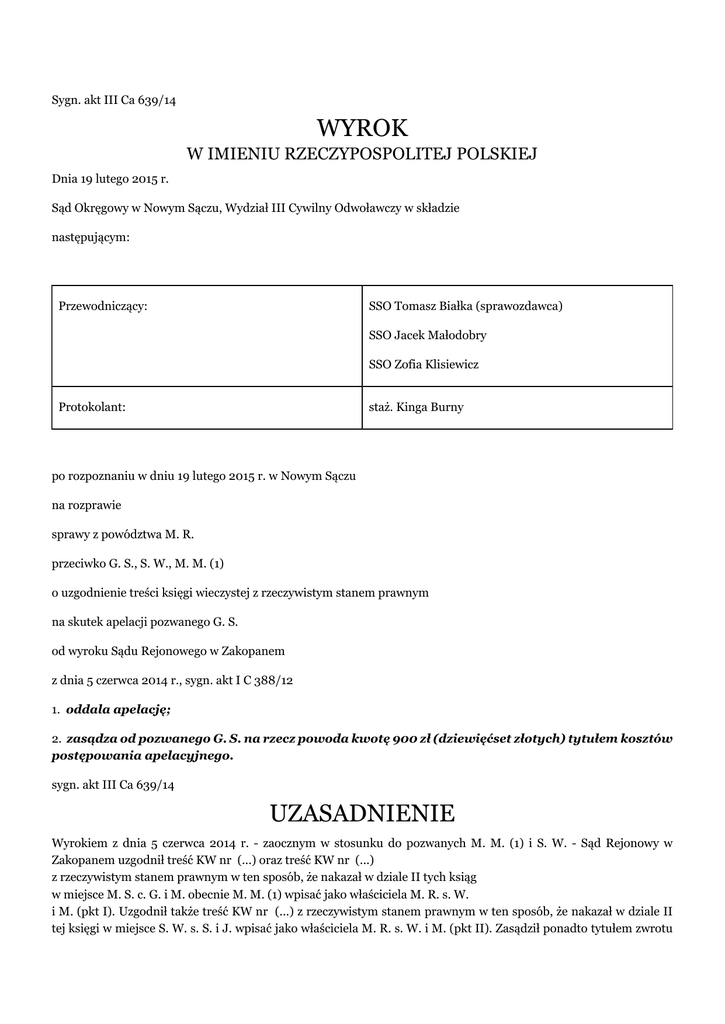 Sygn. akt III Ca 639/14 WYROK W IMIENIU RZECZYPOSPOLITEJ POLSKIEJ Dnia 19 lutego 2015 r. Sąd Okręgowy w Nowym Sączu, Wydział III Cywilny Odwoławczy w składzie następującym: Przewodniczący: SSO Tomasz Białka (sprawozdawca) SSO Jacek Małodobry SSO Zofia Klisiewicz Protokolant: staż. Kinga Burny po rozpoznaniu w dniu 19 lutego 2015 r. w Nowym Sączu na rozprawie sprawy z powództwa M. R. przeciwko G. S., S. W., M. M. (1) o uzgodnienie treści księgi wieczystej z rzeczywistym stanem prawnym na skutek apelacji pozwanego G. S. od wyroku Sądu Rejonowego w Zakopanem z dnia 5 czerwca 2014 r., sygn. akt I C 388/12 1. oddala apelację; 2. zasądza od pozwanego G. S. na rzecz powoda kwotę 900 zł (dziewięćset złotych) tytułem kosztów postępowania apelacyjnego. sygn. akt III Ca 639/14 UZASADNIENIE Wyrokiem z dnia 5 czerwca 2014 r. - zaocznym w stosunku do pozwanych M. M. (1) i S. W. - Sąd Rejonowy w Zakopanem uzgodnił treść KW nr (...) oraz treść KW nr (...) z rzeczywistym stanem prawnym w ten sposób, że nakazał w dziale II tych ksiąg w miejsce M. S. c. G. i M. obecnie M. M. (1) wpisać jako właściciela M. R. s. W. i M. (pkt I). Uzgodnił także treść KW nr (...) z rzeczywistym stanem prawnym w ten sposób, że nakazał w dziale II tej księgi w miejsce S. W. s. S. i J. wpisać jako właściciela M. R. s. W. i M. (pkt II). Zasądził ponadto tytułem zwrotu kosztów procesu od pozwanych G. S. i M. M. (1) solidarnie na rzecz powoda M. R. kwotę 8.660 zł (pkt III), a od pozwanych G. S. i S. W. solidarnie na rzecz powoda M. R. kwotę 2.047 zł (pkt IV). Jak ustalił Sąd Rejonowy, działka ewid. nr (...) położona była w W. i objęta była KW nr (...), w której jako jej jedyny właściciel ujawniony był pozwany S. W.. Działka ewid. nr (...), położona była w Z. i objęta była KW nr (...). Natomiast działki ewid. nr(...) i(...) znajdowały się w Z. i objęte były KW nr (...). Jako jedyny właściciel w obu ww. księgach figurowała pozwana M. S. (obecnie M. M. (1)) – córka pozwanego G. S.. Wyżej opisane nieruchomości wcześniej stanowiły własność J. S. (ojca pozwanego), który od 21 lipca 1993 r. wpisany był jako właściciel dz. ewid. nr (...) w KW nr (...). Od dnia 21 lipca 1993 r. był także wpisany jako właściciel dz. ewid. nr (...) w KW nr (...). Natomiast jako właściciel działki ewid. nr (...) wpisany był do KW nr (...) od 30 grudnia 1982 r., a jako właściciel dz. ewid. nr (...) od dnia 11 grudnia 1992 r. Postanowieniem z dnia 27 stycznia 1994 r. sygn. akt I Ns 12/94 Sąd Rejonowy w Zakopanem stwierdził, że spadek po J. S. nabyły po połowie jego dzieci – G. S. oraz M. L.. Postanowieniem z dnia 14 kwietnia 1994 r. sygn. akt I Ns 193/94 Sąd ten dokonał działu spadku w wyniku, którego przyznał na wyłączną własność pozwanego G. S. działkę ewid. nr (...), zaś na wyłączną własność M. L. przyznał działki ewid. nr nr (...) i (...), a we współwłasności po połowie pozostawił spadkobiercom dz. ewid. nr (...). Postanowienia te nigdy nie zostały jednak ujawnione w odpowiednich księgach wieczystych. W dniu 28 kwietnia 1994 r. małoletni wówczas M. R. działając przez swoją matkę złożył wniosek o zmianę w/ w postanowienia spadkowego z dnia 27 stycznia 1994 r., do którego to wniosku dołączył oryginał własnoręcznego testamentu spadkodawcy. W trakcie trwania tego postępowania (sygn. akt I Ns 293/94) w dniu 26 maja 1994 r. doszło do sporządzenia umowy na mocy, której G. S. i M. L. sprzedali J. G. przedmiotowe działki, jako spadkobiercy wpisanego w KW właściciela nieruchomości. W księgach wieczystych ujawniono nabycie przez niego własności nieruchomości. W trakcie toczących się przed Sądem Rejonowym w Zakopanem pod sygn. I Ns 293/94 oraz przed Sądem Okręgowym w Nowym Sączu pod sygn. I C 236/10 postępowań M. L. przyznała, że pochodzące ze spadku nieruchomości zostały fikcyjnie sprzedane najbliższej rodzinie żony G. S., a ona sama była zmuszana przez pozwanego do udziału w czynności sprzedaży z J. G.. Postanowieniem z dnia 20 października 1999 r., sygn. I Ns 293/94 Sąd Rejonowy w Zakopanem zmienił własne postanowienie z dnia 27 stycznia 1994 r. w ten sposób, że stwierdził, iż spadek po J. S. na podstawie testamentu własnoręcznego nabył w całości M. R.. Na mocy umowy z dnia 24 stycznia 2003 r. J. G. sprzedał G. S. całą nieruchomość obj. KW nr (...) oraz całe nieruchomości obj. KW nr (...) i (...) za cenę 5.000 zł. Kupujący został wpisany w ww. księgach jako właściciel. Nabywając te nieruchomości pozwany pozostawał w złej wierze. W dniu 3 czerwca 2003 r. G. S. sprzedał S. W. działkę ewid. nr (...) za cenę 3.000 zł, a następnie w dniu 30 czerwca 2004 r. sprzedał pozostałe nieruchomości swojej córce M. S. za cenę 2.000 zl. Pomimo kolejnych umów przenoszących własność spornych nieruchomości to G. S. korzystał z nich. Wyrokiem z dnia 3 czerwca 2009 r. sygn. akt I C 620/04 Sąd Okręgowy w N. uchylił wyrok zaoczny z dnia 6 kwietnia 2005 r. wydany w stosunku do pozwanej M. G. – S. i oddalił powództwo M. R., w którym domagał się zobowiązania pozwanej M. S. do złożenia oświadczenia woli przenoszącego na jego rzecz własność działek ewid. nr (...) i (...) oraz działki ewid nr (...) i pozwanego S. W. do złożenia oświadczenia woli przenoszącego na powoda własność działki ewid. nr. (...) oraz ustalenia nieważności wszystkich ww. umów sprzedaży przedmiotowych nieruchomości. Sąd Apelacyjny w Krakowie wyrokiem z dnia 4 listopada 2009 r., sygn. akt I ACa 862/09 uchylił ww. wyrok Sądu Okręgowego w zakresie w jakim oddalał powództwo o ustalenie nieważności umów sprzedaży przedmiotowych nieruchomości z dnia 3 czerwca 2003 r. oraz 30 czerwca 2004 r., i w tym zakresie przekazał sprawę do ponownego rozpoznania. Po ponownym rozpoznaniu sprawy Sąd Okręgowy w Nowym Sączu, wyrokiem z dnia 31 marca 2011 r. syg