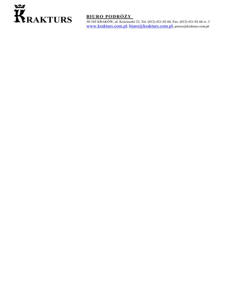 RAKTURS BIURO PODRÓśY 30-105 KRAKÓW, ul. Kościuszki 22, Tel. (012) 421-92-66, Fax. (012) 421-92-66 w. 3 www.krakturs.com.pl; [email protected]; [email protected] 1 DZIEŃ piątek 2 DZIEŃ sobota 3 DZIEŃ niedziela 4 DZIEŃ poniedziałek 5 DZIEŃ wtorek 6 DZIEŃ środa 7 DZIEŃ czwartek 8 DZIEŃ piątek 9 DZIEŃ sobota Wyjazd według rozkładu jazdy. Z Krakowa o godz.7:00 – parking przed Domem Turysty. Przejazd przez Czechy i Austrię do Włoch. Nocleg w hotelu w Tarvisio. Śniadanie . Przejazd do Padwy – nawiedzenie Bazyliki św. Antoniego z grobem Świętego – Msza św. Zwiedzanie miasta: Capella degli Scrovegni z freskami Giotta, Uniwersytet (jeden z najstarszych w Europie), spacer po Starym Mieście. Przejazd w okolice Rimini. Zakwaterowanie w hotelu. Wczesna obiadokolacja, czas wolny –wypoczynek nad morzem. Nocleg. Śniadanie. Przejazd do Loreto – nawiedzenie Sanktuarium Matki BoŜej Loretańskiej z relikwią Santa Casa (domek z Nazaretu). Msza św. Następnie odwiedzimy Lanciano znane z Cudu Eucharystycznego .Obiadokolacja i nocleg w okolicach San Giovanni Rotondo. Po śniadaniu pobyt w Sanktuarium Ojca Pio oraz przejazd na Monte San Angelo, nawiedzenie Sanktuarium św. Michała Archanioła – Msza św. Powrót do hotelu. Obiadokolacja i nocleg. Śniadanie. Przejazd na Monte Cassino – zwiedzanie Opactwa Benedyktyńskiego. Msza św. (polowa) i chwila zadumy na Cmentarzu śołnierzy Polskich. Następnie przejazd w okolice Rzymu – zakwaterowanie w hotelu, obiadokolacja i nocleg. Śniadanie. Przejazd do Watykanu – udział w audiencji Generalnej na Placu św. Piotra (przy pobycie PapieŜa w Rzymie). Następnie zwiedzanie Bazyliki św. Piotra oraz modlitwa przy grobie Jana Pawła II. Wczesnym popołudniem Place i Fontanny Rzymu: Piazza Navona, Panteon, Fontanna di Trevi ze słynnymi hiszpańskimi schodami (Piazza di Spagna). Następnie nawiedzenie Bazyliki Jana na Lateranie i Święte Schody. Powrót do hotelu na obiadokolacje i nocleg. Śniadanie. Zwiedzanie Bazyliki Pawła za Murami. Następnie Rzym Antyczny : Plac Wenecki, Kapitol, Forum Romanum, Koloseum, Kolumna i Forum Trajana. Przejazd do AsyŜu – rodzinnego miasta św. Franciszka. Zakwaterowanie i obiadokolacja w hotelu w okolicach AsyŜu. Śniadanie. Zwiedzanie AsyŜu :Bazylika św. Franciszka ( Msza św.), Bazylika św. Klary, Bazylika Matki Boskiej Anielskiej z Porcjunkulą, Ogród RóŜany. Po południu wyjazd w kierunku Polski. Powrót do Krakowa w godzinach popołudniowych. Cena ok. 1395zł Cena zawiera: • Transport komfortowym autokarem ( klimatyzacja, WC, video, cafe-barek) • 7 noclegów w hotelach **/*** we Włoszech ( pokoje 2- 3osob. z łazienkami) • WyŜywienie : 7 śniadań kontynentalnych i 6 obiadokolacji • Opiekę pilota na całej trasie • Ubezpieczenie KL i NNW ( Signal Iduna) Cena nie zawiera : napoi do obiadokolacji, wstępów do zwiedzanych obiektów, biletów na metro po Rzymie, lokalnych przewodników- na ten cel naleŜy posiadać około 50 euro Teraminy wyjazdów do uzgodnienia