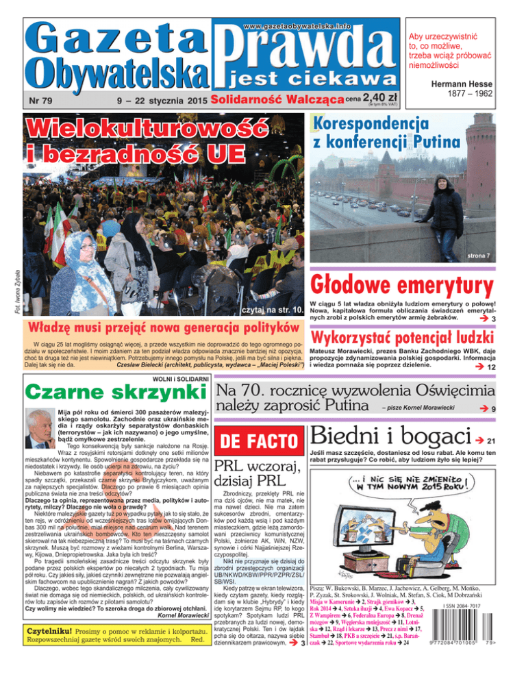 www.gazetaobywatelska.info Aby urzeczywistnić to, co możliwe, trzeba wciąż próbować niemożliwości Nr 79 9 – 22 stycznia 2015 Solidarność Walcząca cena 2,40 zł Hermann Hesse 1877 – 1962 (w tym 8% VAT) Wielokulturowość i bezradność UE Korespondencja z konferencji Putina strona 7 Fot. Iwona Zybała Głodowe emerytury czytaj na str. 10. Władzę musi przejąć nowa generacja polityków W ciągu 5 lat władza obniżyła ludziom emerytury o połowę! Nowa, kapitałowa formuła obliczania świadczeń emerytalnych zrobi z polskich emerytów armię żebraków. 3 Wykorzystać potencjał ludzki W ciągu 25 lat mogliśmy osiągnąć więcej, a przede wszystkim nie doprowadzić do tego ogromnego podziału w społeczeństwie. I moim zdaniem za ten podział władza odpowiada znacznie bardziej niż opozycja, Mateusz Morawiecki, prezes Banku Zachodniego WBK, daje choć ta druga też nie jest niewiniątkiem. Potrzebujemy innego pomysłu na Polskę, jeśli ma być silna i piękna. propozycje zdynamizowania polskiej gospodarki. Informacja Czesław Bielecki (architekt, publicysta, wydawca – „Maciej Poleski”) i wiedza pomnaża się poprzez dzielenie. Dalej tak się nie da. 12 WOLNI i SOLIDARNI Czarne skrzynki Mija pół roku od śmierci 300 pasażerów malezyjskiego samolotu. Zachodnie oraz ukraińskie media i rządy oskarżyły separatystów donbaskich (terrorystów – jak ich nazywano) o jego umyślne, bądź omyłkowe zestrzelenie. Tego konsekwencją były sankcje nałożone na Rosję. Wraz z rosyjskimi retorsjami dotknęły one setki milionów mieszkańców kontynentu. Spowolnienie gospodarcze przekłada się na niedostatek i krzywdy. Ile osób ucierpi na zdrowiu, na życiu? Niebawem po katastrofie separatyści kontrolujący teren, na który spadły szczątki, przekazali czarne skrzynki Brytyjczykom, uważanym za najlepszych specjalistów. Dlaczego po prawie 6 miesiącach opinia publiczna świata nie zna treści odczytów? Dlaczego ta opinia, reprezentowana przez media, polityków i autorytety, milczy? Dlaczego nie woła o prawdę? Niektóre malezyjskie gazety tuż po wypadku pytały jak to się stało, że ten rejs, w odróżnieniu od wcześniejszych tras lotów omijających Donbas 300 mil na południe, miał miejsce nad centrum walk. Nad terenem zestrzeliwania ukraińskich bombowców. Kto ten nieszczęsny samolot skierował na tak niebezpieczną trasę? To musi być na taśmach czarnych skrzynek. Muszą być rozmowy z wieżami kontrolnymi Berlina, Warszawy, Kijowa, Dniepropietrowska. Jaka była ich treść? Po tragedii smoleńskiej zasadnicze treści odczytu skrzynek były podane przez polskich ekspertów po niecałych 2 tygodniach. Tu mija pół roku. Czy jakieś siły, jakieś czynniki zewnętrzne nie pozwalają angielskim fachowcom na upublicznienie nagrań? Z jakich powodów? Dlaczego, wobec tego skandalicznego milczenia, cały cywilizowany świat nie domaga się od niemieckich, polskich, od ukraińskich kontrolerów lotu zapisów ich rozmów z pilotami samolotu? Czy wolimy nie wiedzieć? To szeroka droga do zbiorowej otchłani. Kornel Morawiecki Na 70. rocznicę wyzwolenia Oświęcimia należy zaprosić Putina 9 – pisze Kornel Morawiecki DE FACTO PRL wczoraj, dzisiaj PRL Zbrodniczy, przeklęty PRL nie ma dziś ojców, nie ma matek, nie ma nawet dzieci. Nie ma zatem sukcesorów zbrodni, cmentarzyków pod każdą wsią i pod każdym miasteczkiem, gdzie leżą zamordowani przeciwnicy komunistycznej Polski, żołnierze AK, WiN, NZW, synowie i córki Najjaśniejszej Rzeczypospolitej. Nikt nie przyznaje się dzisiaj do zbrodni przestępczych organizacji UB/NKWD/KBW/PPR/PZPR/ZSL/ SB/WSI. Kiedy patrzę w ekran telewizora, kiedy czytam gazety, kiedy rozglądam się w klubie „Hybrydy” i kiedy idę korytarzem Sejmu RP, to kogo spotykam? Spotykam ludzi PRL przebranych za ludzi nowej, demoCzytelniku! Prosimy o pomoc w reklamie i kolportażu. kratycznej Polski. Ten i ów łajdak pcha się do ołtarza, nazywa siebie Rozpowszechniaj gazetę wśród swoich znajomych. Red. dziennikarzem prawicowym, 3 Biedni i bogaci 21 Jeśli masz szczęście, dostaniesz od losu rabat. Ale komu ten rabat przysługuje? Co robić, aby ludziom żyło się lepiej? Piszą: W. Bukowski, B. Marzec, J. Jachowicz, A. Gelberg, M. Mońko, P. Zyzak, St. Srokowski, J. Wolniak, M. Stefan, S. Ciok, M Dobrzański Misja w Kamerunie 2, Strajk górników 3, I SSN 2084- 7017 Rok 2014 4, Sztuka iluzji 4, Ewa Kopacz 5, Z Wampirem 6, Federalna Europa 8, Drenaż mózgów 9, Węgierska mniejszość 11, Lotniska 12, Rząd i lekarze 13, Precz z nimi 17, Stambuł 18, PKB a szczęście 21, ś.p. Barań9 772084 701005 czak 22, Sportowe wydarzenia roku 24 7 9> 2 Opinie i Akcenty Nr 79, 9 – 22 I 2015 Misja w Kamerunie T o nie przypadek, że tragedia setki rozstrzelanych dzieci w Pakistanie zajmowała polskie media mniej niż śmierć dwojga 40-latków z Rakowisk zasztyletowanych przez ich nastoletniego syna i jego dziewczynę. Nie przypadkiem co rok w dniu śmierci Lady Diany pod pałacem Buckingham ludzie składają kwiaty, a przez media przelewają się historie o „królowej naszych serc”. Dziesiąta rocznica tsunami, które w 2004 r. zabiło 300 tys. ludzi u wybrzeży Oceanu Indyjskiego, zasługuje ledwie na kilkunastosekundową wzmiankę w mediach – Robert Siewiorek. iedy Donald Tusk podwyższył Polakom wiek emerytalny do 67. roku życia – Angela Merkel – umożliwiła swoim obywatelom przechodzenie na emerytury w wieku 63 lat. Niemcy mogli sobie pozwolić na obniżenie wieku emerytalnego co najmniej z dwóch powodów. Po pierwsze: z roku na rok transfer pieniędzy z Polski do Niemiec jest coraz większy. Przepompownia zysków trwa w najlepsze, bowiem niemieckie firmy w dużej części opanowały strategiczne gałęzie polskiego przemysłu, sektora finansowego i komunalnego. Po drugie: spora grupa Polaków wyjeżdża do Niemiec, by pracować tam za pół-darmo. Mówimy tutaj o około 300-500 tys. osób, które co ro