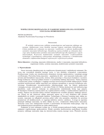 WSPÓŁCZESNE ROZWIĄZANIA W ZAKRESIE MODELOWANIA SYSTEMÓW NAUCZANIA HYBRYDOWEGO PIOTR GŁOWICKI Akademia Wychowania Fizycznego we Wrocławiu Streszczenie W artykule zamieszczono refleksje terminologiczne nad pojĊciem zdalnego nauczania, zdefiniowano coraz bardziej znaczące pojĊcie nauczania hybrydowego. Celem artykułu jest wskazanie na znaczenie i moĪliwoĞci w zakresie modleowania systemów nauczania hybrydowego. Zasadniczą czĊĞcią artykułu są wskazania dotyczące sfery modelowania systemów nauczania hybrydowego dla organizacji w ujĊciu uniwersalnym. W procesie modelowania systemów nauczania z wykorzystaniem technologii e-learningowej wykorzystano metodologiĊ systemową w formułowaniu elementów i definiowaniu kategorii wejĞciowych i wyjĞciowych systemu. Słowa kluczowe: e-learning, nauczanie elektroniczne, media w nauczaniu, nauczanie hybrydowe, organizacja wiedzy, systemy nauczania, modelowanie systemów nauczania 1. Wprowadzenie Nasze otoczenie charakteryzuje si współczesne dynamicznymi i radykalnymi zmianami. Dotycz one wszystkich dziedzin naszego ycia, w tym dziedzin zwizanych z nauczaniem. Przekazywanie wiedzy jest nieodzownym elementem rozwoju społeczestwa, warunkuje postp cywilizacyjny. Pierwotn form nauczania – popularn do dzi – jest nauczanie tradycyjne, realizowane pod kierunkiem nauczyciela, mistrza, który pozostaje w fizycznym kontakcie z uczniem. Postp techniczny wkroczył jednak równie w t dziedzin ludzkiej aktywnoci. Naley dostrzec i wykorzysta szanse wynikajce z cigłego rozwoju nowoczesnych technik edukacyjnych. Dziki szerokim moliwociom zdalne nauczanie jest istotnym narzdziem w procesie kształcenia ustawicznego. Kształtowanie si społeczestwa informacyjnego stało si faktem społecznym i strategi rozwoju wielu pastw, w tym take Polski [1]. Mona dyskutowa nad trafnoci tego okrelenia; cz autorów wskazuje na jednoznacznie niedoskonał form tego pojcia. W literaturze wiatowej czciej mówi si o społeczestwie wiedzy i o społeczestwie opartym na wiedzy. Poprzez ten pryzmat naley równie interpretowa wszelkie przejawy zdalnego nauczania. Dzieje si tak, poniewa zdalne nauczanie opiera si w swej strukturze (jak równie standardach) na wiedzy i potencjale ludzkim. Technologia w Distance Learning (ang. zdalne nauczanie, nauczanie na odległo ) powinna pełni tylko rol narzdzia, natomiast nie powinna przejmowa ról dydaktycznych, co sugeruj niektórzy autorzy i praktycy. Z uwagi na ogromny potencjał zdalnego nauczania, na który składa si m.in.: zwikszenie efektywnoci nauczania, skrócenie czasu oraz zmniejszenie kosztów w porównaniu do nauczania tradycyjnego, staje si ono konkurencyjnym narzdziem na rynku edukacyjnym. Podanie za tymi zmianami wydaje si, w wietle przeprowadzonych bada, strategicznym zadaniem współczesnego społeczestwa. Dziki szerokim moliwociom modyfikacji wszelkie przejawy zdalnego nauczania staj si nierozerwaln czci naszego ycia. Płynno procesu 72 Piotr Głowicki Współczesne rozwiązania w zakresie modelowania systemów nauczania hybrydowego wypierania nauczania tradycyjnego poprzez nauczanie zdalne jest na tyle dua, e nie zawsze zdajemy sobie spraw ze skali tego zjawiska. Dopiero po głbszej analizie szeregu faktów jestemy w stanie czciowo oceni zachodzce zmiany. Współczesne szkoły i uczelnie, jak adne inne przedtem, posiadaj szczególne warunki rozwoju. Czy zdalne nauczanie okae si wielk szans, czy zagroeniem dla współczesnych placówek dydaktycznych, dowiemy si niebawem. To, jak pedagodzy i uczniowie wykorzystaj dobrodziejstwa techniki oraz nowoczesne koncepcje nauczania, przesdzi o sukcesie bd klsce edukacyjnej kolejnych pokole. Celem niniejszego artykułu jest wskazanie na znaczenie i istot modelowania systemów nauczania hybrydowego. W dalszej czci zostan wyjanione główne terminy dotyczce celu artykułu. 2. Zdalne nauczanie – wyjaĞnienie terminu, charakterystyka Jak mona stwierdzi , obszar zdalnego nauczania jest do szeroki i zrónicowany. Obejmuje popularne narzdzia, współczesne media, jak i enigmatycznie brzmice pojcia. W zwizku z szybko rozwijajcym si rynkiem edukacyjnym, mnogoci definicji i okrele niełatwo jest precyzyjnie okreli , czym jest zdalne nauczanie. We współczesnej literaturze funkcjonuje wiele definicji zdalnego nauczania (ang. Distance Learning) oraz jego pochodnych. Cz z nich oddaje w pełni znaczenie tego pojcia, cz dezinformuje. Za Kubiakiem [2] mona stwierdzi , i istnieje wiele definicji edukacji na odległo , gdy wielu badaczy i osób zajmujcych si t problematyk rozumie kształcenie na odległo w róny sposób. Aby ucili to, co rozumiemy pod pojciem kształcenia na odległo , w pierwszej kolejnoci naley wyjani , co rozumiemy pod pojciem kształcenia. Bednarek [3] uwaa, e „w kadej szkole podstawow form realizacji edukacji jest proces nauczania – uczenia si, inaczej okrelany jako proces kształcenia lub proces dydaktyczno-wychowawczy”. Pod tym pojciem rozumie si najczciej system powizanej ze sob działalnoci nauczycieli i uczniów (std nauczanie i uczenie si), w toku której nauczyciel, take rodzic, opiekun, innymi słowy kady wychowawca, bd przekazuje uczniom (wychowankom) wiedz, bd te kieruje ich prac, stwarzajc im warunki do samodzielnego zdobywania wiedzy, rozwijania osobowoci i kształtowania postaw”. Borje Holmberg, jeden z pionierów tego sposobu nauczania, tak rozumiał edukacj na odległo : „Okrelenie edukacja na odległo zawiera w sobie róne formy i poziomy kształcenia, które nie wymagaj natychmiastowego nadzoru ani bezporedniej obecnoci nauczycieli prowadzcych zajcia”[4]. Tym niemniej kształcenie odbywa si w sposób planowy pod nadzorem edukacyjnej organizacji. W tej definicji zawarte s podstawowe cechy DL, tj.: kształcenie odbywa si pod nadzorem edukacyjnej organizacji, oraz kształcenie nie wymaga bezporedniego nadzoru ani obecnoci nauczyciela. Cho angielskie „learn” oznacza uczy si, a nie naucza , okrelenie to powszechnie stosowane jest w kont