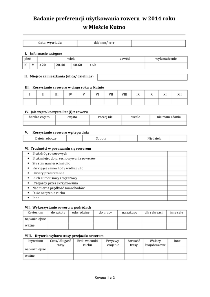 Badanie preferencji użytkowania roweru w 2014 roku w Mieście Kutno data wywiadu I. Informacje wstępne płeć K M < 20 dd/ mm/ rrrr wiek 20-40 zawód 40-60 wykształcenie >60 II. Miejsce zamieszkania (ulica/ dzielnica) III. Korzystanie z roweru w ciągu roku w Kutnie I II III IV V VI IV. Jak często korzysta Pan(i) z roweru bardzo często często V. raczej nie VIII IX wcale X XI XII nie mam zdania Korzystanie z roweru wg typu dnia Dzień roboczy VI. VII Sobota Niedziela Trudności w poruszaniu się rowerem Brak dróg rowerowych Brak miejsc do przechowywania rowerów Zły stan nawierzchni ulic Parkujące samochody wzdłuż ulic Bariery przestrzenne Ruch autobusowy i ciężarowy Przejazdy przez skrzyżowania Nadmierna prędkość samochodów Duże natężenie ruchu Inne VII. Wykorzystanie roweru w podróżach Kryterium do szkoły odwiedziny do pracy na zakupy dla rekreacji inne cele najważniejsze ważne VIII. Kryteria wyboru trasy przejazdu rowerem kryterium Czas/ długość Brd i warunki Przyzwytrasy ruchu czajenie najważniejsze ważne Strona 1 z 2 Łatwość trasy Walory krajobrazowe Inne IX. Kryteria wyboru roweru jako środka komunikacji/rekreacji Nazwa kryterium najważniejsze Ważne /wybór wielokrotny/ Niezależność od komunikacji zbiorowej i sam. osobowych Niski koszt przejazdu Czas przejazdu konkurencyjny w stosunku do komunikacji zbiorowej Odległości miedzy miejscami początku i końca podróży Możliwość podróżowania bez konieczności dojścia do i z parkingu Bezpieczeństwo i warunki ruchu oraz parkowania Warunki atmosferyczne Samopoczucie w danym dniu Charakter czynności wykonywanej po zakończeniu podróży Chęć relaksu Chęć treningu sportowego Inne X. Ilość dróg rowerowych w Mieście Kutno bardzo dużo wystarczająco mało bardzo źle nie mam zdania XI. Oznakowanie dróg rowerowych w Mieście Kutno bardzo dobrze dobrze źle bardzo źle nie mam zdania XII. Stan techniczny dróg rowerowych w Mieście Kutno bardzo dobry dobry zły bardzo zły nie mam zdania XIII. Dojazd rowerem do centrum Kutna bardzo dobry dobry Bardzo zły nie mam zdania XIV. Lp. zły Odbyte podróże Ulica/miejsce Początek podróży Ulica/miejsce Koniec podróży Godzina początku podróży Godzina Środek końca lokomocji podróży 1 – rower 2 – sam.osob. 3 – autobus 4 – pieszo 5 - motocykl 6 – inne 1 2 3 4 D – dom; P – praca; N- szkoła (nauka); Z – zakupy; R- rekreacja; NZD – nie związane z domem; Strona 2 z 2 Motywacja podróży 1. D – P 2. P – D 3. D – N 4. N – D 5. D – Z 6. Z – D 7. D – R 8. R – D 9. D - D 10. NZD