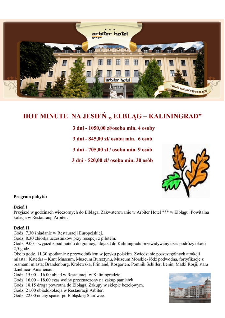HOT MINUTE NA JESIEŃ „ ELBLĄG – KALININGRAD” 3 dni - 1050,00 zł/osoba min. 4 osoby 3 dni - 845,00 zł/ osoba min. 6 osób 3 dni - 705,00 zł / osoba min. 9 osób 3 dni - 520,00 zł/ osoba min. 30 osób Program pobytu: Dzień I Przyjazd w godzinach wieczornych do Elbląga. Zakwaterowanie w Arbiter Hotel *** w Elblągu. Powitalna kolacja w Restauracji Arbiter. Dzień II Godz. 7.30 śniadanie w Restauracji Europejskiej. Godz. 8.30 zbiórka uczestników przy recepcji z pilotem. Godz. 9.00 – wyjazd z pod hotelu do granicy, dojazd do Kaliningradu przewidywany czas podróży około 2,5 godz. Około godz. 11.30 spotkanie z przewodnikiem w języku polskim. Zwiedzanie poszczególnych atrakcji miasta: Katedra – Kant Museum, Muzeum Bursztynu, Muzeum Morskie- łódź podwodna, fortyfikacje z bramami miasta: Brandenburg, Królewska, Frinland, Rosgarten. Pomnik Schiller, Lenin, Matki Rosji, stara dzielnica- Amalienau. Godz. 15.00 – 16.00 obiad w Restauracji w Kaliningradzie. Godz. 16.00 – 18.00 czas wolny przeznaczony na zakup pamiątek. Godz. 18.15 droga powrotna do Elbląga. Zakupy w sklepie bezcłowym. Godz. 21.00 obiadokolacja w Restauracji Arbiter. Godz. 22.00 nocny spacer po Elbląskiej Starówce. Dzień III Śniadanie w hotelowej restauracji. Wymeldowanie uczestników do godz. 12.00. Cena pakietu zawiera: • • • • • • • • 2 noclegi ze śniadaniem w pokoju dwuosobowym 2 obiadokolacje w Restauracji Arbiter Opiekę pilota na trasie wycieczki Elbląg- Kaliningrad-Elbląg Przejazd autokarem trasa Elbląg- Kaliningrad- Elbląg Bilety wstępu do zwiedzanych obiektów Przewodnik w języku polskim Obiad w Kaliningradzie Ubezpieczenie NNW i KL Cena nie zawiera: • • wizy ubezpieczenia na teren Federacji Rosyjskiej (obowiązkowe) Dodatkowo proponujemy: • Wiza + ubezpieczenie – 100 Euro/ osoba Paszport musi być ważny min. 6 miesięcy przed przejazdem do Federacji Rosyjskiej. Zapraszamy serdecznie! Arbiter Hotel Sp. z o.o. ul. Plac Słowiański 2, 82-300 Elbląg, tel:55/ 230-61-36, 55/230-61-58 kom. 500-055-051 www.arbiterhotel.pl