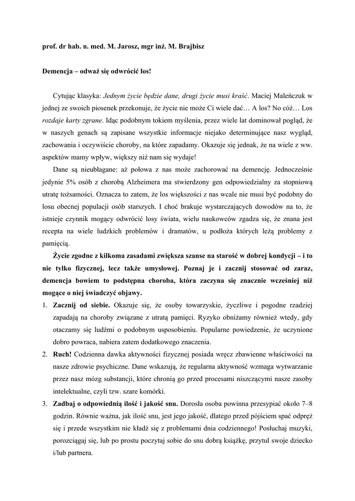 prof. dr hab. n. med. M. Jarosz, mgr inż. M. Brajbisz Demencja – odważ się odwrócić los! Cytując klasyka: Jednym życie będzie dane, drugi życie musi kraść. Maciej Maleńczuk w jednej ze swoich piosenek przekonuje, że życie nie może Ci wiele dać… A los? No cóż… Los rozdaje karty zgrane. Idąc podobnym tokiem myślenia, przez wiele lat dominował pogląd, że w naszych genach są zapisane wszystkie informacje niejako determinujące nasz wygląd, zachowania i oczywiście choroby, na które zapadamy. Okazuje się jednak, że na wiele z ww. aspektów mamy wpływ, większy niż nam się wydaje! Dane są nieubłagane: aż połowa z nas może zachorować na demencję. Jednocześnie jedynie 5% osób z chorobą Alzheimera ma stwierdzony gen odpowiedzialny za stopniową utratę tożsamości. Oznacza to zatem, że los większości z nas wcale nie musi być podobny do losu obecnej populacji osób starszych. I choć brakuje wystarczających dowodów na to, że istnieje czynnik mogący odwrócić losy świata, wielu naukowców zgadza się, że znana jest recepta na wiele ludzkich problemów i dramatów, u podłoża których leżą problemy z pamięcią. Życie zgodne z kilkoma zasadami zwiększa szanse na starość w dobrej kondycji – i to nie tylko fizycznej, lecz także umysłowej. Poznaj je i zacznij stosować od zaraz, demencja bowiem to podstępna choroba, która zaczyna się znacznie wcześniej niż mogące o niej świadczyć objawy. 1. Zacznij od siebie. Okazuje się, że osoby towarzyskie, życzliwe i pogodne rzadziej zapadają na choroby związane z utratą pamięci. Ryzyko obniżamy również wtedy, gdy otaczamy się ludźmi o podobnym usposobieniu. Popularne powiedzenie, że uczynione dobro powraca, nabiera zatem dodatkowego znaczenia. 2. Ruch! Codzienna dawka aktywności fizycznej posiada wręcz zbawienne właściwości na nasze zdrowie psychiczne. Dane wskazują, że regularna aktywność wzmaga wytwarzanie przez nasz mózg substancji, które chronią go przed procesami niszczącymi nasze zasoby intelektualne, czyli tzw. szare komórki. 3. Zadbaj o odpowiednią ilość i jakość snu. Dorosła osoba powinna przesypiać około 7–8 godzin. Równie ważna, jak ilość snu, jest jego jakość, dlatego przed pójściem spać odpręż się i przede wszystkim nie kładź się z problemami dnia codziennego! Posłuchaj muzyki, porozciągaj się, lub po prostu poczytaj sobie do snu dobrą książkę, przytul swoje dziecko i/lub partnera. 4. Zadbaj o dietę. Najzdrowszy typ diety dla naszych szarych komórek to dieta śródziemnomorska. Dla prawidłowego funkcjonowania naszego mózgu potrzebujemy wielu składników, które znajdują się w żywności. Jaka to żywność? Przede wszystkim warzywa, owoce, pełnoziarniste produkty zbożowe, ryby, oleje roślinne oraz orzechy i pestki nasion. Jak zawsze diabeł tkwi w szczegółach, więc równie ważne co jemy, jest to w jakich ilościach i proporcjach. Są one przedstawione w piramidzie zdrowego żywienia i aktywności fizycznej. 5. Ogranicz używki. Nie pal papierosów, uważaj na alkohol oraz cukry proste obecne we wszelkiego rodzaju słodyczach, ale również w owocach! Duża ilość tych produktów w diecie wpływa co najmniej niekorzystnie na naszą koncentrację, pamięć, a wiele danych wskazuje również, że nawet na mniej pogodne podejście do życia. 6. Znajdź złoty środek w postaci umiaru! Wiele składników nie działa lepiej w większych ilościach. Nadmiar – zamiast pomóc, może wręcz zaszkodzić. Nie stosuj zatem suplementów diety bez wskazań lekarza. Pamiętaj również, że podstawowym źródłem substancji odżywczych powinna być żywność! 7. Dmuchaj na zimne! Aluminium nie posiada żadnej znaczącej funkcji w naszym organizmie, zatem ogranicz jego źródła. Związki aluminium możesz znaleźć w paście do zębów oraz w niektórych proszkach do pieczenia. Z tego metalu często mogą być również wykonane garnki i sztućce. Twórz środowisko, w którym chciałbyś, aby rozwijały się i żyły Twoje dzieci! Często mówimy, że co nas nie zabije, to nas wzmocni. Zasada działa oczywiście do czasu lekarskiej diagnozy, w przypadku bowiem demencji staje się ona po prostu wyrokiem. Jest to jedna z tych chorób, na którą nie znamy obecnie lekarstwa. Jedynym sposobem powstrzymania jej fali jest odpowiednio wcześnie wprowadzona interwencja. Oczywiście im wcześniej, tym lepiej, a najlepiej od wczesnego dzieciństwa. Dbając o siebie, pamiętaj, że chronisz również swoje dzieci i wnuki przed tą grupą chorób. W ten sposób kształtujesz nawyki żywieniowe, ale również otoczenie, które – jak już wiemy – ma ogromny wpływ na kierunek, w jakim się starzejemy. Stań oko w oko z demencją Wiele elementów naszego życia (stojących w opozycji do głoszonych zaleceń) należy do cichych i podstępnych zabójców. Latami potrafią powoli niszczyć nasze komórki nerwowe i zamiast zaśpiewać wraz z Kabaretem Starszych Panów: wesołe jest życie staruszka, zaśpiewasz za Maleńczukiem: Jesteś tu dziś i jak grochy lejesz łzy. Ale pamiętaj – tak nie musi być. Masz wpływ na to, w jaki sposób się starzejesz – rzuć rękawicę losowi i przestrzegaj kilku zaleceń wskazanych w tym artykule. Najlepiej zacznij już dziś! Jeżeli chcesz dowiedzieć się więcej, wkrótce opublikujemy wywiad, w którym prof. M. Jarosz przedstawi jeszcze więcej ciekawych faktów z zakresu możliwości prewencji demencji.