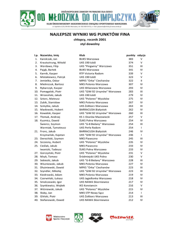 NAJLEPSZE WYNIKI WG PUNKTÓW FINA chłopcy, rocznik 2001 styl dowolny l.p. 1. 2. 3. 4. 5. 6. 7. 8. 9. 10. 11. 12. 13. 14. 15. 16. 17. 18. 21. 23. 24. 25. 27. 28. 29. 30. 31. 32. 33. 34. 35. 36. 37. 38. 39. 40. Nazwisko, Imię Karolczak, Jan Krautsztrung, Witold Wardawa, Filip Pająk, Bartek Karnik, Kacper Mistakiewicz, Patryk Jemielita, Oskar Mielniczuk, Bartosz Rybarczyk, Kacper Pomagalski, Piotr Wrzesiński, Jakub Sztorc, Mateusz Zubik, Stanisław Szmytke, Jakub Masłowski, Hubert Kowalski, Kacper Tłomak, Andrzej Kuzmicz, Dawid Świercz, Szymon Warmiak, Tymoteusz Fronc, Jakub Krzymański, Kajetan Dereziński, Szymon Szczesny, Hubert Cieślak, Jakub Iwanicki, Tadeusz Gorczyński, Piotr Mzyk, Tomasz Sobiecki, Jakub Wiszniewski, Jakub Dłużniewski, Dawid Szyndler, Mikołaj Kiedrowski, Adam Czerwiński, Łukasz Smolczewski, Igor Szynkiewicz, Wojtek Wiśniewski, Jakub Słaby, Jan Gliński, Piotr Stefanowski, Dawid Klub BUKS Warszawa UKS 190 Łódź UKS "Pingwiny" Warszawa BUKS Warszawa RTP Victoria Radom UKS 190 Łódź MPKS "Orka" Ciechanów MKS Polonia Warszawa UKS Wilanowia Warszawa UKS "GIM 92 Ursynów" Warszawa UKS 190 Łódź UKS "Polonez" Wyszków MKS Polonia Warszawa UKS Żoliborz Warszawa BARRACUDA Białystok UKS "GIM 92 Ursynów" Warszawa KS 1 Ożarów Mazowiecki ŚUKS Polna Warszawa UKS "G-8 Bielany" Warszawa UKS Perła Radom BARRACUDA Białystok UKS "GIM 92 Ursynów" Warszawa MKS Piaseczno UKS "Polonez" Wyszków MKS Piaseczno ŚUKS Polna Warszawa UKS "Polonez" Wyszków Śródmiejski UKS Polna UKS "G-8 Bielany" Warszawa MKS Polonia Warszawa MPKS "Orka" Ciechanów UKS "GIM 92 Ursynów" Warszawa MKS Polonia Warszawa UKS Jagiellonka Warszawa UKS NAWA Skierniewice IKS Konstancin UKS "Polonez" Wyszków MKS STP Nowy Sącz UKS Żoliborz Warszawa UKS NAWA Skierniewice punkty edycja 383 V 374 V 351 III 341 IV 339 V 323 V 322 II 307 IV 293 IV 283 III 279 IV 275 IV 267 IV 263 III 262 IV 260 III 257 V 254 IV 254 III 254 I 246 IV 246 I 245 III 235 IV 233 IV 233 IV 231 V 230 V 228 III 227 IV 223 III 223 III 219 IV 218 IV 217 IV 216 V 215 IV 214 I 213 III 212 IV NAJLEPSZE WYNIKI WG PUNKTÓW FINA chłopcy, rocznik 2001 styl dowolny l.p. Nazwisko, Imię 41. Cieśla, Jan Daczkowski, Patryk 43. Hendrych, Dawid 44. Szadrowski, Jakub 45. Dziki, Maciej Nowak, Aleksander Pawlak, Rafał 48. Tarnowski, Aleks 49. Grzelak, Kuba Rohulin, Bogdan Wardak, Michał 52. Piekarski, Eryk Rejniak, Mateusz Szul, Jan 55. Sałaj, Arkadiusz 56. Miziak, Adam Perzankowski, Maciej 58. Polaszyk, Radosław 59. Niedźwiedzki, Albert Pardej, Maciej 61. Płomiński, Piotr 62. Borowski, Kajetan Mikołajczak- Kuśmirek, Michał 64. Chojnacki, Krystian Kowalczyk, Jakub 66. Maj, Damian Oślizło, Piotr 68. Ściseł, Olaf 69. Krasnodębski, Andrzej 70. Przybyłkowski, Aleksander 71. Michalak, Jacek Nowak, Maurycy 73. Krzyżowski, Szymon 74. Rykiel, Grzegorz 75. Dubiel, Cezary Matusiak, Adrian Żurowski, Jakub 78. Łapiński, Filip Orlik, Oskar 80. Stefanek, Adam Klub UKS "GIM 92 Ursynów" Warszawa UKS "Pingwiny" Warszawa UKP Jedynka Elbląg UKS "GIM 92 Ursynów" Warszawa UKS "G-8 Bielany" Warszawa UKS NAWA Skierniewice UKS "Pingwiny" Warszawa UKS NAWA Skierniewice Legia Warszawa UKS "G-8 Bielany" Warszawa UKS "GIM 92 Ursynów" Warszawa UKS "G-8 Bielany" Warszawa MPKS "Orka" Ciechanów UKS "GIM 92 Ursynów" Warszawa UKS "GIM 92 Ursynów" Warszawa MKS Polonia Warszawa UKS NAWA Skierniewice UKS "G-8 Bielany" Warszawa UKS "GIM 92 Ursynów" Warszawa UKS Victoria Józefów UKS "GIM 92 Ursynów" Warszawa UKS "GIM 92 Ursynów" Warszawa UKS "Polonez" Wyszków UKS OLIMPIC Warka MPKS "Orka" Ciechanów UKS Pirania Targówek UKS "Pingwiny" Warszawa UKS Kapry Armexim Pruszków UKS Żoliborz Warszawa MKS Polonia Warszawa UKS Kapry Armexim Pruszków UKS 307 Warszawa BUKS Warszawa BUKS Warszawa MKS Piaseczno UKS Posejdon Pułtusk UKS Perła Radom MKS Polonia Warszawa MKS Polonia Warszawa UKS Victoria Józefów punkty edycja 211 III 211 I 210 I 209 III 207 III 207 IV 207 II 206 IV 202 III 202 III 202 II 201 III 201 II 201 II 199 II 195 IV 195 IV 193 III 192 I 192 II 191 II 188 III 188 IV 187 V 187 I 186 IV 186 III 185 IV 184 III 183 IV 182 IV 182 III 181 IV 180 II 177 III 177 III 177 II 176 I 176 IV 175 III NAJLEPSZE WYNIKI WG PUNKTÓW FINA chłopcy, rocznik 2001 styl dowolny l.p. Nazwisko, Imię 81. Kuźniak, Mateusz Żubrowski, Cezary 83. Orzeł, Kacper 84. Wójcik, Igor 85. Nowak, Maksymilian 86. Kasprzak, Mateusz Pyrek, Krystian 88. Brzeskiewicz, Adam Krzyrzowski, Szymon Potocki, Mikołaj 91. Gadziński, Jakub 92. Chomentowski, Aleksy Nakonieczny, Mateusz 94. Godlewski, Dominik Śpiewak, Krzysztof 96. Grabiec, Patryk Nivette, Karol Rowiński, Aleksander 99. Zagrzejewski, Tomasz 100. Celej, Szymon 101. Jóźwiak, Maksymilian 102. Dyńka, Bartosz 103. Wojtyński, Adam 104. Joniec, Jędrzej 105. Dąbrowski, Konrad 106. Bednarek, Damian 107. Rykała, Maciej 108. Czarnecki, Krzysztof Nieznański, Kacper 110. Paciorek, Franciszek 111. Ambroziak, Wojciech 112. Niedzielski, Bartosz 113. Szmidt, Hubert 114. Cieślak, Sebastian 115. Ptytkowski, Igor 116. Przybylski, Patryk 117. Gołowkow, Mateusz Potera, Mateusz 119. Wodzyński, Wiktor Klub UKS Żoliborz Warszawa MKS Polonia Warszawa UKS "GIM 92 Ursynów" Warszawa UKS "G-8 Bielany" Warszawa UKS 307 Warszawa RTP Victoria Radom UKS "GIM 92 Ursynów" Warszawa BUKS Warszawa BUKS Warszawa UKS Żoliborz Warszawa UKS Żoliborz Warszawa MKS Piaseczno MKS Piaseczno UKP Jedynka Elbląg UKS Ostrobramska Warszawa MUKP Warszawianka Wodny Park UKS Ostrobramska Warszawa MUKP Warszawianka Wodny Park UKS Manta Warszawa Włochy UKS Victoria Józefów UKS Kapry Armexim Pruszków UKS Ósemka Siedlce UKS Ostrobramska Warszawa MUKP Warszawianka Wodny Park UKS Żoliborz Warszawa Śródmiejski UKS Polna Warszawa UKS Manta Warszawa Włochy MUKP Warszawianka Wodny Park UKS "Pingwiny" Warszawa IKS Konstancin UKS "Pingwiny" Warszawa UKS "GIM 92 Ursynów" Warszawa UKS Ósemka Siedlce UKS OLIMPIC Warka IKS Konstancin UKS OLIMPIC Wark