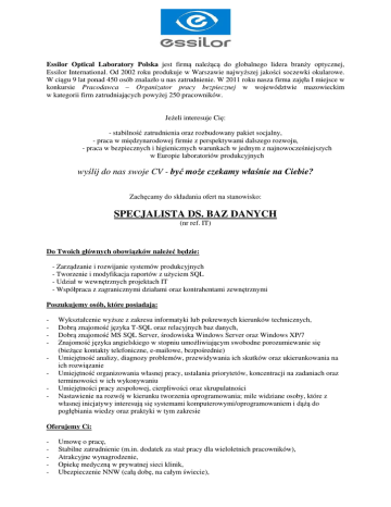 Essilor Optical Laboratory Polska jest firmą należącą do globalnego lidera branży optycznej, Essilor International. Od 2002 roku produkuje w Warszawie najwyższej jakości soczewki okularowe. W ciągu 9 lat ponad 450 osób znalazło u nas zatrudnienie. W 2011 roku nasza firma zajęła I miejsce w konkursie Pracodawca – Organizator pracy bezpiecznej w województwie mazowieckim w kategorii firm zatrudniających powyżej 250 pracowników. Jeżeli interesuje Cię: - stabilność zatrudnienia oraz rozbudowany pakiet socjalny, - praca w międzynarodowej firmie z perspektywami dalszego rozwoju, - praca w bezpiecznych i higienicznych warunkach w jednym z najnowocześniejszych w Europie laboratoriów produkcyjnych wyślij do nas swoje CV - być może czekamy właśnie na Ciebie? Zachęcamy do składania ofert na stanowisko: SPECJALISTA DS. BAZ DANYCH (nr ref. IT) Do Twoich głównych obowiązków należeć będzie: - Zarządzanie i rozwijanie systemów produkcyjnych - Tworzenie i modyfikacja raportów z użyciem SQL - Udział w wewnętrznych projektach IT - Współpraca z zagranicznymi działami oraz kontrahentami zewnętrznymi Poszukujemy osób, które posiadają: - Wykształcenie wyższe z zakresu informatyki lub pokrewnych kierunków technicznych, Dobrą znajomość języka T-SQL oraz relacyjnych baz danych, Dobrą znajomość MS SQL Server, środowiska Windows Server oraz Windows XP/7 Znajomość języka angielskiego w stopniu umożliwiającym swobodne porozumiewanie się (bieżące kontakty telefoniczne, e-mailowe, bezpośrednie) Umiejętność analizy, diagnozy problemów, przewidywania ich skutków oraz ukierunkowania na ich rozwiązanie Umiejętność organizowania własnej pracy, ustalania priorytetów, koncentracji na zadaniach oraz terminowości w ich wykonywaniu Umiejętności pracy zespołowej, cierpliwości oraz skrupulatności Nastawienie na rozwój w kierunku tworzenia oprogramowania; mile widziane osoby, które z własnej inicjatywy interesują się systemami komputerowymi/oprogramowaniem i dążą do pogłębiania wiedzy oraz praktyki w tym zakresie Oferujemy Ci: - Umowę o pracę, Stabilne zatrudnienie (m.in. dodatek za staż pracy dla wieloletnich pracowników), Atrakcyjne wynagrodzenie, Opiekę medyczną w prywatnej sieci klinik, Ubezpieczenie NNW (całą dobę, na całym świecie), - Możliwość uczestnictwa w Planie Oszczędnościowym Grupy Essilor (dofinansowanie do akcji pracowniczych), Pakiet socjalny (basen, kino, paczki świąteczne,…) Raz do roku darmową parę najlepszych soczewek. Na Twoje CV i list motywacyjny z zaznaczonym na kopercie lub w temacie wiadomości numerem referencyjnym IT czekamy pod adresem: Essilor Optical Laboratory Polska Sp. z o.o. Dział Personalny ul. Annopol 3, 03-236 Warszawa [email protected] Prosimy o dopisanie klauzuli: „Wyrażam zgodę na przetwarzanie moich danych osobowych zawartych w ofercie pracy dla potrzeb niezbędnych do realizacji procesu rekrutacji (zgodnie z Ustawą z dnia 29.08.1997r. o Ochronie Danych Osobowych Dz.U. Nr 02.101.926).”