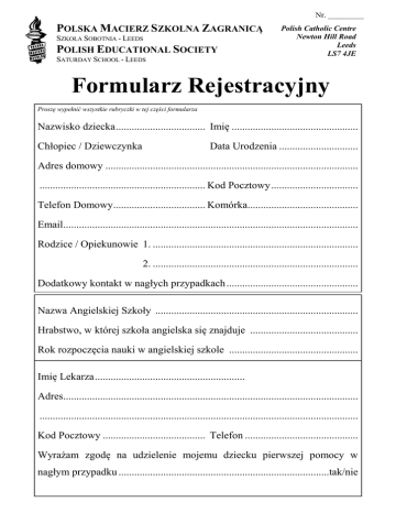 Nr. _________ POLSKA MACIERZ SZKOLNA ZAGRANICĄ SZKOŁA SOBOTNIA - LEEDS POLISH EDUCATIONAL SOCIETY SATURDAY SCHOOL - LEEDS Polish Catholic Centre Newton Hill Road Leeds LS7 4JE Formularz Rejestracyjny Proszę wypełnić wszystkie rubryczki w tej części formularza Nazwisko dziecka .................................. Imię ................................................ Chłopiec / Dziewczynka Data Urodzenia .............................. Adres domowy ................................................................................................ ............................................................... Kod Pocztowy ................................. Telefon Domowy ................................... Komórka.......................................... Email................................................................................................................ Rodzice / Opiekunowie 1. .............................................................................. 2. .............................................................................. Dodatkowy kontakt w nagłych przypadkach .................................................. Nazwa Angielskiej Szkoły ............................................................................. Hrabstwo, w której szkoła angielska się znajduje ......................................... Rok rozpoczęcia nauki w angielskiej szkole ................................................. Imię Lekarza ......................................................... Adres................................................................................................................ ......................................................................................................................... Kod Pocztowy ....................................... Telefon ........................................... Wyrażam zgodę na udzielenie mojemu dziecku pierwszej pomocy w nagłym przypadku ................................................................................tak/nie Czy dziecko ma jakiekolwiek alergię czy nawracającą się chorobę? .tak/nie Jeśli tak, proszę podać, jaką ............................................................................ ......................................................................................................................... Czy dziecko przyjmuje regularnie jakieś leki? ....................................tak/nie Jeśli tak, proszę podać, jakie ........................................................................... ......................................................................................................................... Czy dziecko ma jakiekolwiek wymagania dietetyczne? .....................tak/nie Jeśli tak, proszę podać, jakie ........................................................................... ......................................................................................................................... Czy dziecko ma rodzeństwo, które uczęszcza do naszej szkoły? ........tak/nie Jeśli tak, proszę podać imiona ......................................................................... Wyrażam zgodę, aby moje dziecko mogło pójść na spacer podczas zajęć szkolnych, pod opieką nauczycieli.......................................................tak/nie Wyrażam zgodę na grupowe / klasowe fotografie...............................tak/nie Nauczyciel dziecka pozwoli wyłącznie rodzicom dziecka na odebranie go ze szkoły. W sytuacji, kiedy ktokolwiek inny będzie musiał odebrać dziecko ze szkoły, nauczyciel musi być wcześniej o tym poinformowany. Tylko dla dzieci powyżej 12 lat: Wyrażam zgodę ażeby moje dziecko wracało do domu samo .........................................................................tak/nie Inne informacje o dziecku, o których powinien wiedzieć nauczyciel. ......................................................................................................................... ......................................................................................................................... Podpis rodziców ...................................................Data ...................................
