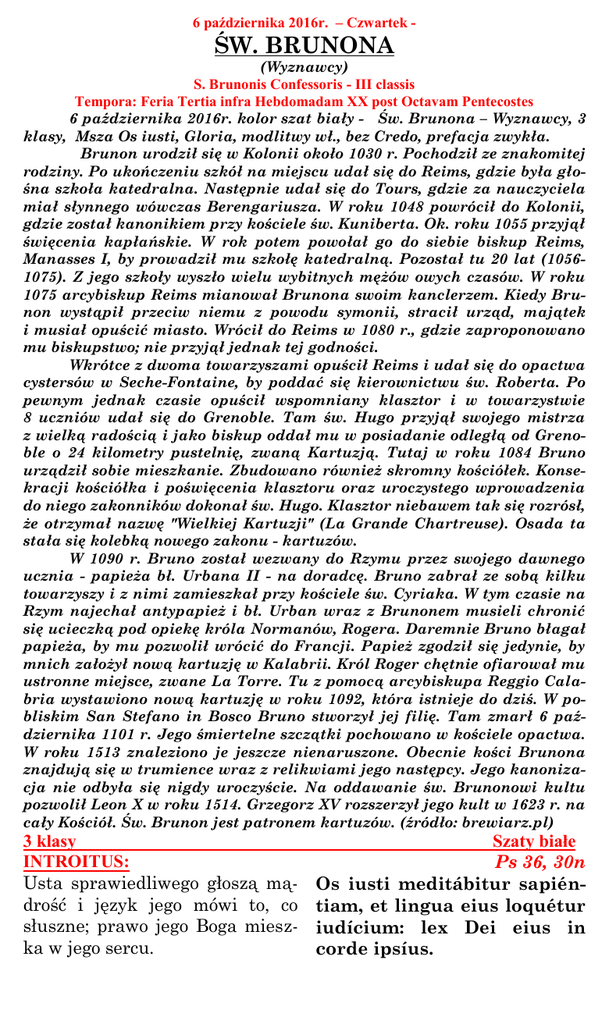 6 października 2016r. – Czwartek - ŚW. BRUNONA (Wyznawcy) S. Brunonis Confessoris - III classis Tempora: Feria Tertia infra Hebdomadam XX post Octavam Pentecostes 6 października 2016r. kolor szat biały - Św. Brunona – Wyznawcy, 3 klasy, Msza Os iusti, Gloria, modlitwy wł., bez Credo, prefacja zwykła. Brunon urodził się w Kolonii około 1030 r. Pochodził ze znakomitej rodziny. Po ukończeniu szkół na miejscu udał się do Reims, gdzie była głośna szkoła katedralna. Następnie udał się do Tours, gdzie za nauczyciela miał słynnego wówczas Berengariusza. W roku 1048 powrócił do Kolonii, gdzie został kanonikiem przy kościele św. Kuniberta. Ok. roku 1055 przyjął święcenia kapłańskie. W rok potem powołał go do siebie biskup Reims, Manasses I, by prowadził mu szkołę katedralną. Pozostał tu 20 lat (10561075). Z jego szkoły wyszło wielu wybitnych mężów owych czasów. W roku 1075 arcybiskup Reims mianował Brunona swoim kanclerzem. Kiedy Brunon wystąpił przeciw niemu z powodu symonii, stracił urząd, majątek i musiał opuścić miasto. Wrócił do Reims w 1080 r., gdzie zaproponowano mu biskupstwo; nie przyjął jednak tej godności. Wkrótce z dwoma towarzyszami opuścił Reims i udał się do opactwa cystersów w Seche-Fontaine, by poddać się kierownictwu św. Roberta. Po pewnym jednak czasie opuścił wspomniany klasztor i w towarzystwie 8 uczniów udał się do Grenoble. Tam św. Hugo przyjął swojego mistrza z wielką radością i jako biskup oddał mu w posiadanie odległą od Grenoble o 24 kilometry pustelnię, zwaną Kartuzją. Tutaj w roku 1084 Bruno urządził sobie mieszkanie. Zbudowano również skromny kościółek. Konsekracji kościółka i poświęcenia klasztoru oraz uroczystego wprowadzenia do niego zakonników dokonał św. Hugo. Klasztor niebawem tak się rozrósł, że otrzymał nazwę "Wielkiej Kartuzji" (La Grande Chartreuse). Osada ta stała się kolebką nowego zakonu - kartuzów. W 1090 r. Bruno został wezwany do Rzymu przez swojego dawnego ucznia - papieża bł. Urbana II - na doradcę. Bruno zabrał ze sobą kilku towarzyszy i z nimi zamieszkał przy kościele św. Cyriaka. W tym czasie na Rzym najechał antypapież i bł. Urban wraz z Brunonem musieli chronić się ucieczką pod opiekę króla Normanów, Rogera. Daremnie Bruno błagał papieża, by mu pozwolił wrócić do Francji. Papież zgodził się jedynie, by mnich założył nową kartuzję w Kalabrii. Król Roger chętnie ofiarował mu ustronne miejsce, zwane La Torre. Tu z pomocą arcybiskupa Reggio Calabria wystawiono nową kartuzję w roku 1092, która istnieje do dziś. W pobliskim San Stefano in Bosco Bruno stworzył jej filię. Tam zmarł 6 października 1101 r. Jego śmiertelne szczątki pochowano w kościele opactwa. W roku 1513 znaleziono je jeszcze nienaruszone. Obecnie kości Brunona znajdują się w trumience wraz z relikwiami jego następcy. Jego kanonizacja nie odbyła się nigdy uroczyście. Na oddawanie św. Brunonowi kultu pozwolił Leon X w roku 1514. Grzegorz XV rozszerzył jego kult w 1623 r. na cały Kościół. Św. Brunon jest patronem kartuzów. (źródło: brewiarz.pl) 3 klasy INTROITUS: Usta sprawiedliwego głoszą mądrość i język jego mówi to, co słuszne; prawo jego Boga mieszka w jego sercu. Szaty białe Ps 36, 30n Os iusti meditábitur sapiéntiam, et lingua eius loquétur iudícium: lex Dei eius in corde ipsíus. Ps 36,1 Ps. Wielkim głosem wołam do Noli æmulári in malignántiPana, wielkim głosem Pana za- bus: neque zeláveris faciéntes iniquitátem. V. Glória klinam. V. Chwała Ojcu. Patri. ORATIO: Prosimy Cię, Panie, niech nas Sancti Brunónis Confessóris wspomaga wstawiennictwo św. tui, quaesumus, Dómine, inBrunona, Twojego Wyznawcy, tercessiónibus adiuvémur: abyśmy, obraziwszy Twój maje- ut, qui maiestátem tuam stat ciężkimi grzechami, przez gráviter delinquéndo offénjego zasługi i modlitwy otrzymali dimus, eius méritis et préciprzebaczenie swoich win. Przez bus, nostrórum delictórum Pana. véniam consequámur. Per Dominum. LECTIO: Syr 31,8-11 Błogosławiony bogacz, którego Beátus vir, qui invéntus est znaleziono bez winy, który nie sine mácula, et qui post augonił za złotem. Któż to jest? rum non ábiit, nec sperávit Wychwalać go będziemy, uczynił in pecúnia et thesáuris. Quis bowiem rzeczy podziw wzbudza- est hic, et laudábimus eum? jące między swoim ludem. Któż fecit enim mirabília in vita poddany pod tym względem pró- sua. Qui probátus est in illo, bie został doskonały? Poczytane et perféctus est, erit illi mu to będzie za chlubę. Kto glória ætérna: qui potuit mógł zgrzeszyć, a nie zgrzeszył, tránsgredi, et non est transuczynić źle, a nie uczynił? Dobra gréssus: fácere mala, et non jego zostaną utwierdzone, fecit: ídeo stabilíta sunt bona a zgromadzenie opowiadać bę- illíus in Dómino, et eleedzie jego dobrodziejstwa. mósynis illíus enarrábit omnis ecclésia sanctórum. GRADUALE: Ps 91,13-14.3 Sprawiedliwy zakwitnie jak Iustus ut palma florébit: sipalma, rozrośnie się jak cedr na cut cedrus Líbani multiLibanie w domu Pańskim. V. By plicábitur in domo Dómini. głosić z rana Twoje miłosierdzie, V. Annuntiándum mane mia wierność Twoją nocami. sericórdiam tuam, et veritátem tuam per noctem. ALLELUJA: J 1,12 Alleluja, alleluja. V. Błogosła- Allelúia, allelúia. V. Beátus wiony człowiek, który zniesie vir, qui suffert tentatiónem: pokusę, bo utwierdziwszy się quóniam, cum probátus otrzyma wieniec żywota. Allelu- fúerit, accípiet corónam ja. vitæ. Allelúia. Łk 12,35-40 In illo témpore: Dixit Iesus discípulis suis: Sint lumbi vestri præcíncti, et lucernæ ardéntes in mánibus vestris, et vos símiles homínibus exspectántibus dóminum suum, quando revertátur a núptiis: ut, cum vénerit et pulsáverit, conféstim apériant ei. Beáti servi illi, quos, cum vénerit dóminus, invénerit vigilántes: amen, dic
