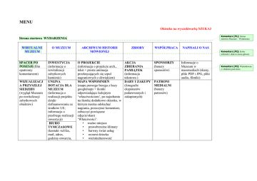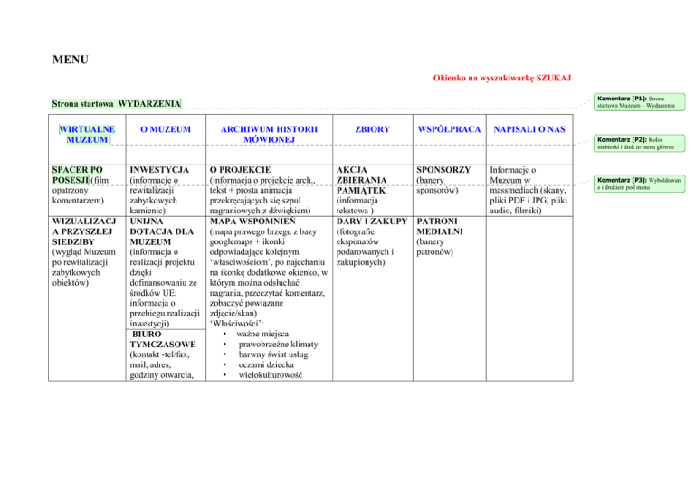MENU Okienko na wyszukiwarkę SZUKAJ Komentarz [P1]: Strona startowa Muzeum – Wydarzenia Strona startowa WYDARZENIA WIRTUALNE MUZEUM SPACER PO POSESJI (film opatrzony komentarzem) WIZUALIZACJ A PRZYSZŁEJ SIEDZIBY (wygląd Muzeum po rewitalizacji zabytkowych obiektów) O MUZEUM INWESTYCJA (informacje o rewitalizacji zabytkowych kamienic) UNIJNA DOTACJA DLA MUZEUM (informacja o realizacji projektu dzięki dofinansowaniu ze środków UE; informacja o przebiegu realizacji inwestycji) BIURO TYMCZASOWE (kontakt -tel/fax, mail, adres, godziny otwarcia, ARCHIWUM HISTORII MÓWIONEJ ZBIORY O PROJEKCIE (informacja o projekcie arch., tekst + prosta animacja przekręcających się szpul nagraniowych z dźwiękiem) MAPA WSPOMNIEŃ (mapa prawego brzegu z bazy googlemaps + ikonki odpowiadające kolejnym ‘własciwościom’, po najechaniu na ikonkę dodatkowe okienko, w którym moŜna odsłuchać nagrania, przeczytać komentarz, zobaczyć powiązane zdjęcie/skan) ‘Właściwości’: • waŜne miejsca • prawobrzeŜne klimaty • barwny świat usług • oczami dziecka • wielokulturowość AKCJA ZBIERANIA PAMIĄTEK (informacja tekstowa ) DARY I ZAKUPY (fotografie eksponatów podarowanych i zakupionych) WSPÓŁPRACA NAPISALI O NAS Komentarz [P2]: Kolor niebieski i druk to menu główne SPONSORZY (banery sponsorów) PATRONI MEDIALNI (banery patronów) Informacje o Muzeum w massmediach (skany, pliki PDF i JPG, pliki audio, filmiki) Komentarz [P3]: Wyboldowan e i drukiem pod menu EKSPONATY (wirtualny eksponat czyli najciekawsze eksponatyruchome zdjęcia z opisem) zespół, foto) WYDARZENIA (informacje o wystawach, imprezach, spotkaniach, panelach dyskusyjnych + foto) WYSTAWY (tekst o wystawie, foto, czas eksponowania, nagranie mp3) EDUKACJA (lekcje muzealne, warsztaty, konkursy, foto, moŜliwość pobrania plików PDF, JPG ) KALENDARIUM (forma kalendarza lub w formie albumu foto(kaŜde wydarzenie – fotka+info) PROJEKTY NAUKOWE/ BADAWCZE (konferencje – treść+ foto) PODCASTY • w wirze historii PODZIEL SIĘ HISTORIĄ (miejsce na kontakt, z kim się skontaktować jeśli chce się nagrać relację albo zna się kogo, kto mógłby taka relację podarować Muzeum) LISTA DARCZYNCÓW (alfabetyczna lista darczyńców) PARTNERZY (linki i ich loga) WOLONTARIA T (informacja o moŜliwości wolontariatu w Muzeum) PRZYJACIELE MUZEUM (linki organizacji z którymi współpracujemy) (moŜliwość umieszczania podkastów , tekst i foto) WYDAWNICTW A (okład ka +spis treści) Logotyp Programu Operacyjnego Infrastruktura i Środowisko Logo miasta lub herb Logo Muzeum Historycznego m.st Warszawy Flaga UE z odwołaniem słownym do Europejskiego Funduszu Rozwoju Regipnalnego Informacja o współfinansowaniu projektu ze środków Unii Europejskiej Dodatkowe ikonki lub loga Facebook, You tube, itp. Kontakt /Mapa strony/