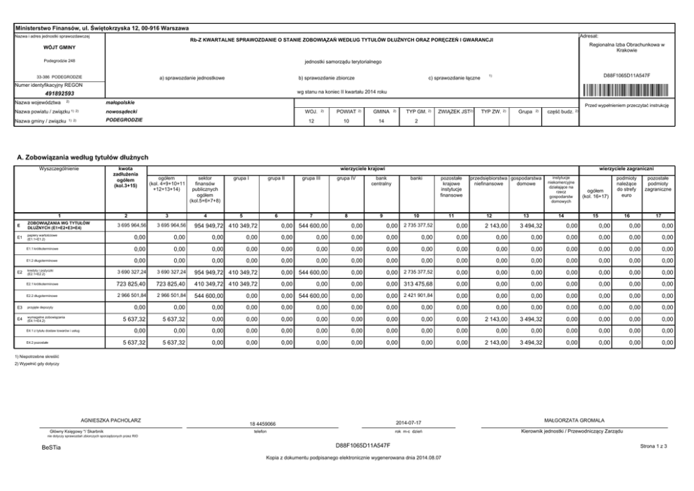Ministerstwo Finansów, ul. Świętokrzyska 12, 00-916 Warszawa Nazwa i adres jednostki sprawozdawczej Adresat: Rb-Z KWARTALNE SPRAWOZDANIE O STANIE ZOBOWIĄZAŃ WEDŁUG TYTUŁÓW DŁUŻNYCH ORAZ PORĘCZEŃ I GWARANCJI Regionalna Izba Obrachunkowa w Krakowie WÓJT GMINY Podegrodzie 248 jednostki samorządu terytorialnego 33-386 PODEGRODZIE a) sprawozdanie jednostkowe b) sprawozdanie zbiorcze c) sprawozdanie łączne D88F1065D11A547F 1) Numer identyfikacyjny REGON wg stanu na koniec II kwartału 2014 roku 491892593 Nazwa województwa 2) Nazwa powiatu / związku 1) Nazwa gminy / związku małopolskie 2) Przed wypełnieniem przeczytać instrukcję nowosądecki WOJ. PODEGRODZIE 1) 2) 2) POWIAT 12 10 grupa III grupa IV 2) GMINA 2) 14 TYP GM. 2) ZWIĄZEK JST2) TYP ZW. 2) Grupa 2) część budz. 2) 2 A. Zobowiązania według tytułów dłużnych Wyszczególnienie kwota zadłużenia ogółem (kol.3+15) 1 2 E ZOBOWIĄZANIA WG TYTUŁÓW DŁUŻNYCH (E1+E2+E3+E4) E1 E2 wierzyciele krajowi ogółem (kol. 4+9+10+11 +12+13+14) sektor finansów publicznych ogółem (kol.5+6+7+8) grupa I 3 4 5 grupa II 6 7 8 3 695 964,56 0,00 544 600,00 0,00 papiery wartościowe (E1.1+E1.2) 0,00 0,00 0,00 0,00 0,00 0,00 0,00 E1.1 krótkoterminowe 0,00 0,00 0,00 0,00 0,00 0,00 E1.2 długoterminowe 0,00 0,00 0,00 0,00 0,00 0,00 kredyty i pożyczki (E2.1+E2.2) 3 690 327,24 3 690 327,24 954 949,72 410 349,72 0,00 544 600,00 E2.1 krótkoterminowe 723 825,40 723 825,40 410 349,72 410 349,72 0,00 0,00 E2.2 długoterminowe 2 966 501,84 2 966 501,84 544 600,00 0,00 0,00 0,00 0,00 0,00 0,00 0,00 5 637,32 5 637,32 0,00 0,00 0,00 0,00 0,00 0,00 5 637,32 5 637,32 0,00 0,00 E3 przyjęte depozyty E4 wymagalne zobowiązania (E4.1+E4.2) E4.1 z tytułu dostaw towarów i usług E4.2 pozostałe banki 9 3 695 964,56 954 949,72 410 349,72 wierzyciele zagraniczni bank centralny pozostałe krajowe instytucje finansowe 10 11 przedsiębiorstwa gospodarstwa niefinansowe domowe 12 13 instytucje niekomercyjne działające na rzecz gospodarstw domowych 14 ogółem (kol. 16+17) podmioty należące do strefy euro pozostałe podmioty zagraniczne 15 16 17 0,00 2 735 377,52 0,00 2 143,00 3 494,32 0,00 0,00 0,00 0,00 0,00 0,00 0,00 0,00 0,00 0,00 0,00 0,00 0,00 0,00 0,00 0,00 0,00 0,00 0,00 0,00 0,00 0,00 0,00 0,00 0,00 0,00 0,00 0,00 0,00 0,00 0,00 0,00 0,00 0,00 0,00 2 735 377,52 0,00 0,00 0,00 0,00 0,00 0,00 0,00 0,00 0,00 313 475,68 0,00 0,00 0,00 0,00 0,00 0,00 0,00 544 600,00 0,00 0,00 2 421 901,84 0,00 0,00 0,00 0,00 0,00 0,00 0,00 0,00 0,00 0,00 0,00 0,00 0,00 0,00 0,00 0,00 0,00 0,00 0,00 0,00 0,00 0,00 0,00 0,00 2 143,00 3 494,32 0,00 0,00 0,00 0,00 0,00 0,00 0,00 0,00 0,00 0,00 0,00 0,00 0,00 0,00 0,00 0,00 0,00 0,00 0,00 0,00 0,00 0,00 2 143,00 3 494,32 0,00 0,00 0,00 0,00 1) Niepotrzebne skreślić 2) Wypełnić gdy dotyczy AGNIESZKA PACHOLARZ Główny Księgowy */ Skarbnik 2014-07-17 18 4459066 telefon rok m-c dzień MAŁGORZATA GROMALA Kierownik jednostki / Przewodniczący Zarządu nie dotyczy sprawozdań zbiorczych sporządzonych przez RIO BeSTia D88F1065D11A547F Kopia z dokumentu podpisanego elektronicznie wygenerowana dnia 2014.08.07 Strona 1 z 3 B. Poręczenia i gwarancje Wyszczególnienie kwota zadłużenia ogółem (kol. 3+8) 1 wierzyciele podmioty sektora finansów publicznych (kol.4+5+6+7) 2 grupa I 3 F1 wartość nominalna niewymagalnych (potencjalnych) zobowiązań z tytułu udzielonych poręczeń i gwarancji na koniec okresu sprawozdawczego F2 wartość nominalna wymagalnych zobowiązań z tytułu udzielonych poręczeń i gwarancji na koniec okresu sprawozdawczego F3 wartość poręczeń i gwarancji udzielonych w okresie sprawozdawczym grupa II 4 grupa III 5 grupa IV 6 pozostałe podmioty 7 8 65 000,00 0,00 0,00 0,00 0,00 0,00 65 000,00 0,00 0,00 0,00 0,00 0,00 0,00 0,00 0,00 0,00 0,00 0,00 0,00 0,00 0,00 C. Uzupełniające dane o niektórych zobowiązaniach jednostki samorządu terytorialnego C1. Kredyty i pożyczki oraz wyemitowane papiery wartościowe na realizację programów, projektów lub zadań finansowanych z udziałem środków, o których mowa w art. 5 ust. 1 pkt 2 ustawy Lp. Wyszczególnienie z budżetu państwa ogółem 1 2 3 w tym: w tym: z innych źródeł ogółem długoterminowe 1 Ogółem kredyty i pożyczki oraz wyemitowane papiery wartościowe w tym: 2 na współfinansowanie (udział własny) długoterminowe 4 5 410 349,72 0,00 X X 6 80 000,00 80 000,00 0,00 0,00 C2. Dodatkowe dane uzupełniające Plan Wykonanie Wyszczególnienie 1 2 1. Wykup papierów wartościowych, spłata kredytów i pożyczek zaciągniętych na spłatę przejętych zobowiązań SPZOZ w okresie sprawozdawczym 2. Przejęte zadłużenie SPZOZ na koniec okresu sprawozdawczego 3. Wykup obligacji nominowanych w walutach obcych wyemitowanych na zagraniczne rynki przed dniem 1 stycznia 2010 r. w okresie sprawozdawczym 4. Zobowiązania związku współtworzonego przez jednostkę samorządu terytorialnego w okresie sprawozdawczym 3 0,00 0,00 X 0,00 0,00 0,00 0,00 0,00 D. Dane o krótkoterminowych zobowiązaniach wynikających z umów nienazwanych związanych z finansowaniem usług, dostaw, robót budowlanych Kwota zobowiązania ogółem Wyszczególnienie 1 2 A. krótkoterminowe zobowiązania przejęte przez instytucje finansowe 0,00 B. krótkoterminowe zobowiązania zrestrukturyzowane 0,00 E. Zobowiązania z tytułu odsetek jednostek posiadających osobowość prawną z wyłączeniem jednostek samorządu terytorialnego Wyszczególnienie kwota zobowiązań ogółem (kol. 3+4) 1 2 Wartość odsetek 0,00 AGNIESZKA PACHOLARZ Główny Księgowy */ Skarbnik nie dotyczy sprawozdań zbiorczych sporządzonych przez RIO BeSTia odsetki naliczone od zobowiązań niewymagalnych odsetki naliczone od zobowiązań wymagalnych 3 4 0,00 0,00 18 4459066 2014-07-17 telefon rok m-c dzień D88F1065D11A547F Kopia z dokumentu podpisanego elektronicznie wygenerowana dnia 2014.08.07 MAŁGORZATA GROMALA Kierownik jednostki / Przewodniczący Zarządu Strona 2 z 3 Wyjaśnienia 