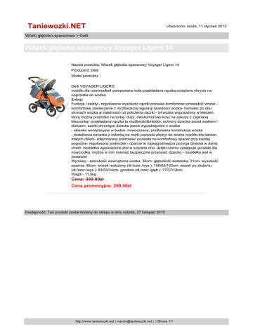 Taniewozki.NET Utworzono: środa, 11 styczeń 2012 Wózki głęboko-spacerowe > Delti Wózek głęboko-spacerowy Voyager Ligero 14 Nazwa produktu: Wózek głęboko-spacerowy Voyager Ligero 14 Producent: Delti Model produktu: Delti VOYAGER LIGERO nosidło dla noworodka4 pompowane koła;przekładana rączka;ocieplane okrycie na nogi;torba do wozka. Funkcje i zalety:- regulowana wysokość rączki pozwala komfortowo prowadzić wozek komfortowe zawieszenie z możliwością regulacji twardości wozka- hamulec po obu stronach wozka w zależności od położenia rączki - tył wozka wyposażony w kieszeń, ktorą można przerobić na torbę- duży, dwukomorowy kosz na zakupy z zapinaną kieszonką- przekładana rączka to możliwość· ochrony dziecka przed wiatrem i słońcem- szelki chroniące dziecko przed wypadnięciem z wozka - okienko wentylacyjne w budce- nowoczesna, profilowana konstrukcja wozka - dodatkowa barierka z osłonką na nożki pozwala włożyć do wozka nosidło dla bardzo małych dzieci- zdejmowany pokrowiec pozwala na komfortowy spacer przy każdej pogodzie- regulowany podnożek i oparcie to najwygodniejsza pozycja dziecka w danej chwili- nosidełko wyposażone jest w sztywne dno, dzięki czemu zastępuje gondolę dla noworodka, można w nim rownież bezpiecznie przenosić dziecko - nosidełko jest w zestawie! Wymiary:- szerokość wewnętrzna wozka: 36cm- głębokość siedziska: 21cm- wysokość oparcia: 46cm- wozek rozłożony (dł./szer./wys.): 106/65/102cm- wozek po złożeniu (dł./szer./wys.): 83/53/34cm- gondola (dł./szer./głęb.): 77/37/18cm Waga:- 11,5kg Cena: 399.00zł Cena promocyjna: 299.00zł Dostępność: Ten produkt został dodany do sklepu w dniu sobota, 27 listopad 2010 http://www.taniewozki.net | [email protected] | | Strona 1/1