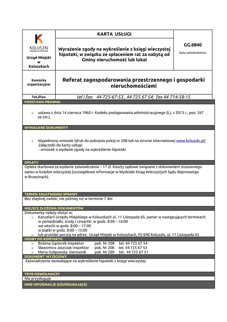 KARTA USŁUGI Urząd Miejski w Koluszkach Wyrażenie zgody na wykreślenie z księgi wieczystej hipoteki, w związku ze spłaceniem rat za nabytą od Gminy nieruchomość lub lokal Komórka organizacyjna: Data zatwierdzenia: Referat zagospodarowania przestrzennego i gospodarki nieruchomościami Tel./Fax: PODSTAWA PRAWNA • GG.6840 tel i fax: 44 725-67-53 , 44 725 67 54; fax 44 714-58-15 ustawa z dnia 14 czerwca 1960 r. Kodeks postępowania administracyjnego (t.j. z 2013 r., poz. 267 ze zm.), WYMAGANE DOKUMENTY • Wypełniony wniosek (druk do pobrania pokój nr 208 lub na stronie internetowej www.koluszki.pl) Załączniki do karty usługi: - wniosek o wydanie zgody na wykreślenie hipoteki OPŁATY Opłata skarbowa za wydanie zaświadczenia – 17 zł. Koszty sądowe związane z dokonaniem stosownego wpisu w księdze wieczystej (szczegółowe informacje w Wydziale Ksiąg Wieczystych Sądu Rejonowego w Brzezinach). TERMIN ZAŁATWIENIA SPRAWY Bez zbędnej zwłoki, nie później niż w terminie 7 dni MIEJSCE ZŁOŻENIA DOKUMENTÓW Dokumenty należy złożyć w: • Kancelarii Urzędu Miejskiego w Koluszkach ul. 11 Listopada 65, parter w następujących terminach: w poniedziałki, środy i czwartki w godz. 8:00 – 16:00 we wtorki w godz. 8:00 – 17:00 w piątki w godz. 8:00 – 15:00 • lub przesłać pocztą na adres: Urząd Miejski w Koluszkach, 95-040 Koluszki, ul. 11 Listopada 65 OSOBY DO KONTAKTU • • • Bożena Gąsiorek inspektor Sławomira Jaszczak inspektor Maria Gołgowska kierownik pok. Nr 208 pok. Nr 208 pok. Nr 209 tel. 44 725 67 54 tel. 44 725 67 53 tel. 44 725 67 51 DOKUMENT WYJŚCIOWY Zaświadczenie zezwalające na wykreślenie hipoteki z księgi wieczystej TRYB ODWOŁAWCZY Nie przysługuje INNE INFORMACJE (UZUPEŁNIAJĄCE) Brak Koluszki, dnia ….......................... …................................................... (imię i nazwisko) ….................................................. (adres) ….................................................. (nr telefonu) Urząd Miejski w Koluszkach ul. 11 Listopada 65 95-040 Koluszki WNIOSEK na wykreślenie z księgi wieczystej, hipoteki w związku ze spłaceniem rat za nabytą od Gminy nieruchomość lub lokal mieszkalny W związku ze spłaceniem wszystkich rat: 1) za nabytą działkę położoną …......................…....................................................................... 2) za lokal mieszkalny nr …..... położony ….............................................................................., proszę o wyrażenie zgody na wykreślenie hipoteki. Załącznik: - dowód wpłaty opłaty skarbowej ….................................................. (podpis)