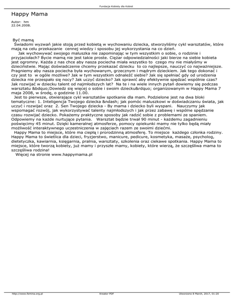 Fundacja Kobiety dla Kobiet Happy Mama Autor: hm 22.04.2008. Być mamą Świadomi wyzwań jakie stoją przed kobietą w wychowaniu dziecka, stworzyliśmy cykl warsztatów, które mają na celu przekazanie cennej wiedzy i sposobu jej wykorzystania na co dzień. Jak wychowywać swojego maluszka nie zapominając w tym wszystkim o sobie, o rodzinie i przyjaciołach? Bycie mamą nie jest takie proste. Ciężar odpowiedzialności jaki bierze na siebie kobieta jest ogromny. Każda z nas chce aby nasza pociecha miała wszystko to czego my nie miałyśmy w dzieciństwie. Mając doświadczenie chcemy przekazać dziecku to co najlepsze, nauczyć co najważniejsze. Pragniemy aby nasza pociecha była wychowanym, grzecznym i mądrym dzieckiem. Jak tego dokonać i czy jest to w ogóle możliwe? Jak w tym wszystkim odnaleźć siebie? Jak się spełniać gdy od urodzenia dziecka nie przespało się nocy? Jak uczyć dziecko? Jak sprawić aby efektywnie spędzać wspólnie czas? Jak rozwijać w dziecku talent od najmłodszych lat? Na te i na wiele innych pytań dowiemy się podczas warsztatu „Dowiedz się więcej o sobie i swoim dziecku” organizowanym w Happy Mama 7 maja 2008, w środę, o godzinie 11.00. Jest to pierwsze, otwierające cykl warsztatów spotkanie dla mam. Podzielone jest na dwa bloki tematyczne: 1. Inteligencja Twojego dziecka – jak pomóc maluszkowi w doświadczaniu świata, jak uczyć i rozwijać oraz 2. Sen Twojego dziecka - By mama i dziecko byli wyspani. Nauczymy jak wspomagać rozwój, jak wykorzystywać talenty najmłodszych i jak przez zabawę i wspólne spędzanie czasu rozwijać dziecko. Pokażemy praktyczne sposoby jak radzić sobie z problemami ze spaniem. Odpowiemy na każde nurtujące pytania. Warsztat będzie trwał 90 minut - każdemu zagadnieniu poświęcimy 45 minut. Dzięki kameralnej atmosferze, pomocy opiekunki mamy nie tylko będą miały możliwość interaktywnego uczestniczenia w zajęciach razem ze swoimi dziećmi. Happy Mama to miejsce, które ma ciepłą i prorodzinną atmosferę. To miejsce każdego członka rodziny. Happy Mama to świetlica dla dzieci, fryzjerstwo, manicure, pedicure, kosmetyka, masaże, psycholog, dietetyczka, kawiarnia, księgarnia, pralnia, warsztaty, szkolenia oraz ciekawe spotkania. Happy Mama to miejsce, które tworzą kobiety, już mamy i przyszłe mamy, kobiety, które wierzą, że szczęśliwa mama to szczęśliwa rodzina! Więcej na stronie www.happymama.pl http://www.femina.org.pl Kreator PDF Utworzono 8 March, 2017, 01:20