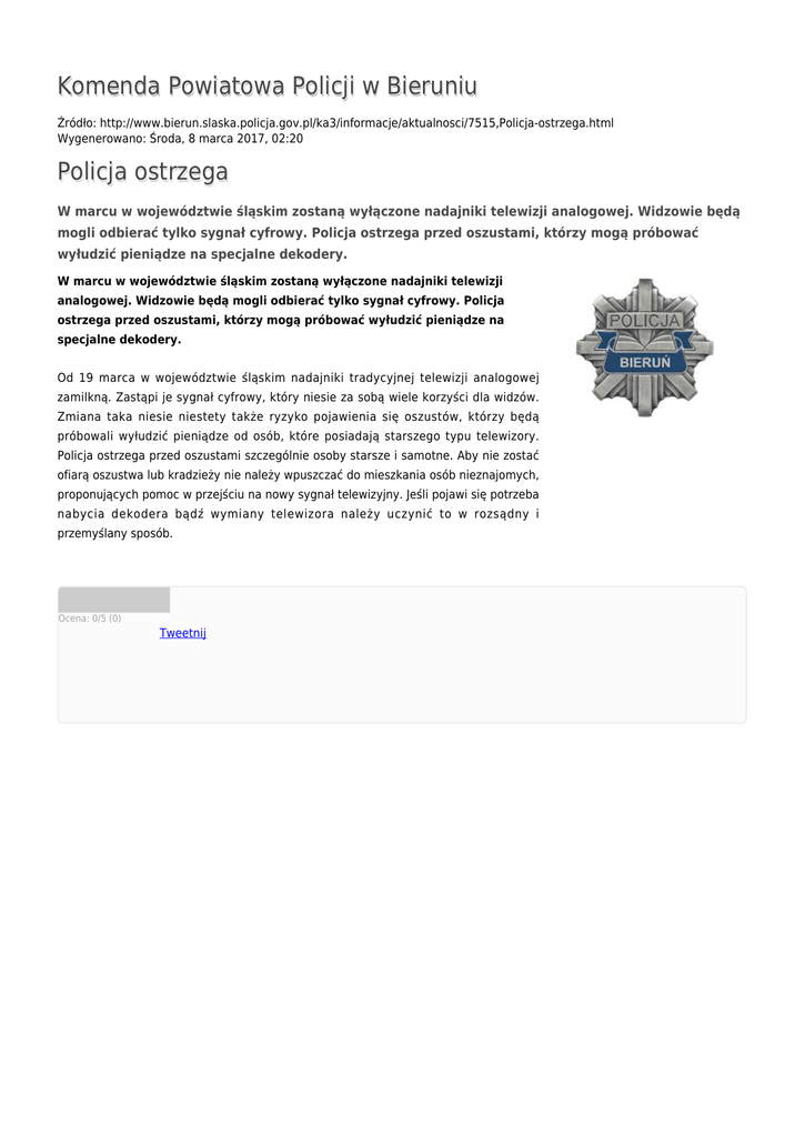 Komenda Powiatowa Policji w Bieruniu Źródło: http://www.bierun.slaska.policja.gov.pl/ka3/informacje/aktualnosci/7515,Policja-ostrzega.html Wygenerowano: Środa, 8 marca 2017, 02:20 Policja ostrzega W marcu w województwie śląskim zostaną wyłączone nadajniki telewizji analogowej. Widzowie będą mogli odbierać tylko sygnał cyfrowy. Policja ostrzega przed oszustami, którzy mogą próbować wyłudzić pieniądze na specjalne dekodery. W marcu w województwie śląskim zostaną wyłączone nadajniki telewizji analogowej. Widzowie będą mogli odbierać tylko sygnał cyfrowy. Policja ostrzega przed oszustami, którzy mogą próbować wyłudzić pieniądze na specjalne dekodery. Od 19 marca w województwie śląskim nadajniki tradycyjnej telewizji analogowej zamilkną. Zastąpi je sygnał cyfrowy, który niesie za sobą wiele korzyści dla widzów. Zmiana taka niesie niestety także ryzyko pojawienia się oszustów, którzy będą próbowali wyłudzić pieniądze od osób, które posiadają starszego typu telewizory. Policja ostrzega przed oszustami szczególnie osoby starsze i samotne. Aby nie zostać ofiarą oszustwa lub kradzieży nie należy wpuszczać do mieszkania osób nieznajomych, proponujących pomoc w przejściu na nowy sygnał telewizyjny. Jeśli pojawi się potrzeba nabycia dekodera bądź wymiany telewizora należy uczynić to w rozsądny i przemyślany sposób. Ocena: 0/5 (0) Tweetnij