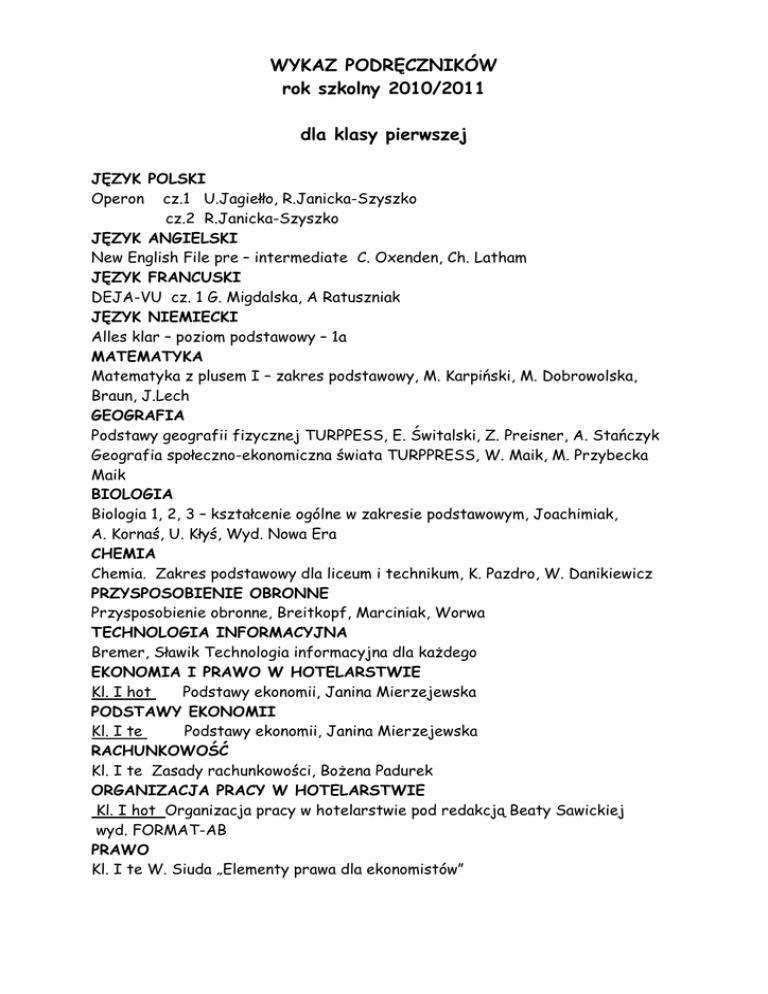 WYKAZ PODRĘCZNIKÓW rok szkolny 2010/2011 dla klasy pierwszej JĘZYK POLSKI Operon cz.1 U.Jagiełło, R.Janicka-Szyszko cz.2 R.Janicka-Szyszko JĘZYK ANGIELSKI New English File pre – intermediate C. Oxenden, Ch. Latham JĘZYK FRANCUSKI DEJA-VU cz. 1 G. Migdalska, A Ratuszniak JĘZYK NIEMIECKI Alles klar – poziom podstawowy – 1a MATEMATYKA Matematyka z plusem I – zakres podstawowy, M. Karpiński, M. Dobrowolska, Braun, J.Lech GEOGRAFIA Podstawy geografii fizycznej TURPPESS, E. Świtalski, Z. Preisner, A. Stańczyk Geografia społeczno-ekonomiczna świata TURPPRESS, W. Maik, M. Przybecka Maik BIOLOGIA Biologia 1, 2, 3 – kształcenie ogólne w zakresie podstawowym, Joachimiak, A. Kornaś, U. Kłyś, Wyd. Nowa Era CHEMIA Chemia. Zakres podstawowy dla liceum i technikum, K. Pazdro, W. Danikiewicz PRZYSPOSOBIENIE OBRONNE Przysposobienie obronne, Breitkopf, Marciniak, Worwa TECHNOLOGIA INFORMACYJNA Bremer, Sławik Technologia informacyjna dla kaŜdego EKONOMIA I PRAWO W HOTELARSTWIE Podstawy ekonomii, Janina Mierzejewska Kl. I hot PODSTAWY EKONOMII Kl. I te Podstawy ekonomii, Janina Mierzejewska RACHUNKOWOŚĆ Kl. I te Zasady rachunkowości, BoŜena Padurek ORGANIZACJA PRACY W HOTELARSTWIE Kl. I hot Organizacja pracy w hotelarstwie pod redakcją Beaty Sawickiej wyd. FORMAT-AB PRAWO Kl. I te W. Siuda „Elementy prawa dla ekonomistów” WYKAZ PODRĘCZNIKÓW rok szkolny 2010/2011 dla klasy drugiej JĘZYK POLSKI Operon cz.3 D.Dominik-Stawicka, E.Czarnota cz.4 K.Budna JĘZYK ANGIELSKI New English File pre – intermediate C. Oxenden, Ch. Latham JĘZYK FRANCUSKI DEJA VO cz.1 JĘZYK NIEMIECKI Allesklar 1b – poziom podstawowy HISTORIA Historia I “Od czasów najdawniejszych do średniowiecza” M. Gładysz, Ł. Skupny MATEMATYKA Matematyka z plusem I i II – zakres podstawowy, M. Dobrowolska, M. Karpiński, J. Lech FIZYKA Podręcznik: Fizyka i astronomia dla kaŜdego pod redakcją Barbary Sagnowskiej, wyd. ZamKor Zbiór zadań: Agnieszka BoŜek, Katarzyna Nessing Zadania z fizyki dla kaŜdego, wyd. ZamKor BIOLOGIA Biologia 3- kształcenie ogólne w zakresie podstawowym, Joachimiak, Kornaś, Kłyś Wyd. Nowa Era PRZYSPOSOBIENIE OBRONNE Przysposobienie obronne, Breitkopf, Marciniak, Worwa ORGANIZACJA PRACY W HOTELARSTWIE Kl. II hot „Organizacja pracy w hotelarstwie” pod redakcją Beaty Sawickiej wyd. FORMAT-AB EKONOMIKA Kl. II te „Ekonomika i organizacja przedsiębiorstw” , S. Dębski RACHUNKOWOŚĆ Kl. II te Rachunkowość przedsiębiorstw cz.1 B. Padurek JĘZYK OBCY ZAWODOWY Język angielski Kl. II hot D. Nowakowska, J. Dolińska-Romanowicz „ How can I help you?” Język niemiecki Kl. II hot Wobei kann ich helfen? Beata Krzysztofik EKONOMIA I PRAWO W HOTELARSTWIE Kl. II hot Zasady rachunkowości B. Padurek PODSTAWY EKONOMII Kl. II te J. Mierzejewska Podstawy ekonomii U. Łatka Technologia i towaroznawstwo PRAWO Kl. II te W. Siuda „Elementy prawa dla ekonomistów” WYKAZ PODRĘCZNIKÓW rok szkolny 2010/2011 dla klasy trzeciej JĘZYK POLSKI Operon cz.5 E. Dunaj, B. Zagórska HISTORIA M. Gładysz Historia II JĘZYK ANGIELSKI New English File – intermediate C. Oxenden, Ch. Latham JĘZYK FRANCUSKI DEJA-VU cz. 2 Migdalska JĘZYK NIEMIECKI Alles klar 2a – poziom podstawowy / kontynuacja 1b JĘZYK ANGIELSKI ZAWODOWY Kl. III hot D. Nowakowska, J. Dolińska-Romanowicz „ How can I help you?” MATEMATYKA Matematyka z plusem cz. II i cz. III , M. Dobrowolska, M. Karpiński, J. Lech MARKETING USŁUG HOTELARSKICH Kl. III hot Marketing, M. Pietraszewski J. Piasta „Marketing w hotelarstwie” ORGANIZACJA PRACY W HOTELARSTWIE Kl. III hot „Organizacja i technika pracy w hotelarstwie” S. Oparka EKONOMIKA „Ekonomika i organizacja przedsiębiorstw” , S. Dębski Kl. III te JĘZYK NIEMIECKI ZAWODOWY Kl. III hot Wobei kann ich helfen? Beata Krzysztofik RACHUNKOWOŚĆ Kl. III te Rachunkowość przedsiębiorstw cz.II B. Padurek PRAWO Kl. III te W. Siuda „Elementy prawa dla ekonomistów” EKONOMIA I PRAWO W HOTELARSTWIE Kl. III hot „Prawo w hotelarstwie” – praca zbiorowa WYKAZ PODRĘCZNIKÓW rok szkolny 2010/2011 dla klasy czwartej JĘZYK POLSKI Operon cz.5 E. Dunaj, B. Zagórska JĘZYK ANGIELSKI Repetytorium z języka angielskiego Rosińska, Mendela wyd. Macmillan Kl. IV a hot Oxford Excellence for matura, New English File – intermediate C. Oxenden, Ch. Latham – Koenig, Oxford JĘZYK FRANCUSKI DEJA-VU cz. 2 Migdalska JĘZYK NIEMIECKI kontynuacja podręcznika z kl, III JĘZYK NIEMIECKI ZAWODOWY Kl. IV hot Wobei kann ich helfen? Beata Krzysztofik JĘZYK ANGIELSKI ZAWODOWY Kl. IV hot D. Nowakowska, J. Dolińska-Romanowicz „ How can I help you?” JĘZYK ANGIELSKI ZAWODOWY Kl. IV te „Market Leader” Pre - Intermediate MATEMATYKA Matematyka z plusem cz. III, M. Dobrowolska, M. Karpiński, J. Lech WIEDZA O SPOŁECZEŃSTWIE Wiedza o społeczeństwie zakres podstawowy, Z. Smutek, J. Maleska, B. Surmacz, OPERON ORGANIZACJA I TECHNIKA PRACY Kl. IV hot „Organizacja i technika pracy w hotelarstwie” S. Oparka EKONOMIKA PRZEDSIĘBIORSTW Kl. IV te „Ekonomika i organizacja przedsiębiorstw” , S. Dębski RACHUNKOWOŚĆ klasa IV te Rachunkowość przedsiębiorstw cz.III i IV B. Padurek