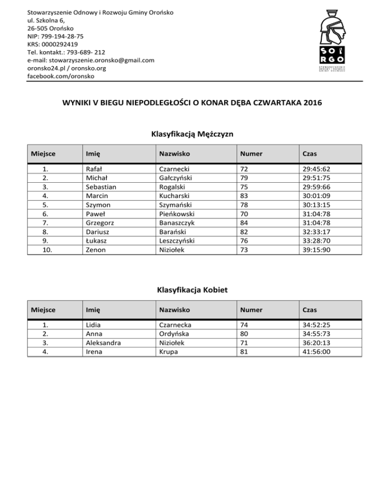 Stowarzyszenie Odnowy i Rozwoju Gminy Orońsko ul. Szkolna 6, 26-505 Orońsko NIP: 799-194-28-75 KRS: 0000292419 Tel. kontakt.: 793-689- 212 e-mail: [email protected] oronsko24.pl / oronsko.org facebook.com/oronsko WYNIKI V BIEGU NIEPODLEGŁOŚCI O KONAR DĘBA CZWARTAKA 2016 Klasyfikacją Mężczyzn Miejsce 1. 2. 3. 4. 5. 6. 7. 8. 9. 10. Imię Nazwisko Numer Czas Rafał Michał Sebastian Marcin Szymon Paweł Grzegorz Dariusz Łukasz Zenon Czarnecki Gałczyński Rogalski Kucharski Szymański Pieńkowski Banaszczyk Barański Leszczyński Niziołek 72 79 75 83 78 70 84 82 76 73 29:45:62 29:51:75 29:59:66 30:01:09 30:13:15 31:04:78 31:04:78 32:33:17 33:28:70 39:15:90 Klasyfikacja Kobiet Miejsce 1. 2. 3. 4. Imię Nazwisko Numer Czas Lidia Anna Aleksandra Irena Czarnecka Ordyńska Niziołek Krupa 74 80 71 81 34:52:25 34:55:73 36:20:13 41:56:00