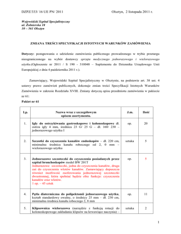 DZPZ/333/ 16 UE PN/ 2011 Olsztyn, 2 listopada 2011 r. Wojewódzki Szpital Specjalistyczny ul. śołnierska 18 10 – 561 Olsztyn ZMIANA TREŚCI SPECYFIKACJI ISTOTNYCH WARUNKÓW ZAMÓWIENIA Dotyczy: postępowania o udzielenie zamówienia publicznego prowadzonego w trybie przetargu nieograniczonego na wybór dostawcy sprzętu medycznego jednorazowego i wielorazowego uŜytku.(Ogłoszenie nr 2011 / S 190 - 310048 – Suplementu do Dziennika Urzędowego Unii Europejskiej z dnia 4 października 2011 r.). Zamawiający, Wojewódzki Szpital Specjalistyczny w Olsztynie, na podstawie art. 38 ust. 4 ustawy prawo zamówień publicznych, dokonuje zmian treści Specyfikacji Istotnych Warunków Zamówienia w zakresie Rozdziału XVIII. Zmiany dotyczą opisu przedmiotu zamówienia w pakiecie nr 61: Pakiet nr 61 Lp. Nazwa wraz z szczegółowym opisem asortymentu. J.m. Ilość 1. Igły do ostrzykiwania gastroskopowe i kolonoskopowe dł. ostrza igły 4 mm, średnica 23 G/ 25 G – dł. 160/ 230 – jednorazowego uŜytku I op. 20 2. Szczotki do czyszczenia kanałów endoskopów – dł. 220 cm, minimalna średnica kanału roboczego od 2, 0 mm – wielorazowego uŜytku sztuka 5 3. Jednorazowe szczoteczki do czyszczenia posiadanych przez szpital bronchoskopów model BW 201T Jednorazowe szczoteczki, jedna do czyszczenia kanałów, druga zaś do czyszczenia wlotów kanałów. Zamawiający dopuszcza równieŜ moŜliwość zaoferowania jednorazowej szczoteczki dwustronnej, która spełniać będzie obie funkcje: czyszczenia kanałów oraz wlotów. 1 op. – 45 sztuk op. 5 4. Pętla diatermiczna do polipektomii jednorazowego uŜytku, kształt standardowy owalny, o średnicy 25 mm – dł. 230 cm, minimalna średnica kanału roboczego 2, 8 mm op. 11 5. Klipsownica wielorazowa (narzędzie z funkcją rotacji do kolonoskopowego zakładania klipsów na krwawiące naczynia) – sztuka 2 1 DZPZ/333/ 16 UE PN/ 2011 Olsztyn, 2 listopada 2011 r. dł. 230 cm, minimalna średnica kanału roboczego 2, 8 mm 6. Klipsy jednorazowe do klipsownicy standardowe (kąt rozwarcia 135 stopni) dł. ramion klipsa 7, 5 mm końcówka w kształcie stoŜka ułatwiająca załoŜenie klipsa (klipsy pakowane pojedynczo w kartridŜach kompatybilne z klipsownicą) op. 6 7. Zaworki biopsyjne jednorazowe do endoskopów typu: gasto i kolo. op. 6 8. Zaworki biopsyjne jednorazowego uŜytku do posiadanego przez szpital bronchoskopu OLYMPUS Model Maj 210 op. 4 9. Zaworki biopsyjne jednorazowe uŜytku do posiadanego przez szpital bronchoskopu OLYMPUS Model Maj 210 op. 2 10. Balon lateksowy, niesterylny, typu 2 FOR ULTRASONIC ENDOSCOPE MH 303/ do posiadanego przez szpital ultrasonografu Olympus, -1 op. – 20 sztuk op. 3 11. Klipsy jednorazowe do klipsownicy standardowe (kąt rozwarcia 90 stopni) dł. ramion klipsa 9,00 mm końcówka w kształcie stoŜka ułatwiająca załoŜenie klipsa (klipsy pakowane pojedynczo w kartridŜach kompatybilne z klipsownicą) op. 4 12. Pętle odłączalne do podwiązywania polipów z pętlą nylonową śr.30 mm ,dł. narzędzi 230 cm 1 op.a 5 szt. op. 4 Dyrektor Wojewódzkiego Szpitala Specjalistycznego w Olsztynie Irena Kierzkowska ( Podpis osoby uprawnionej ) 2