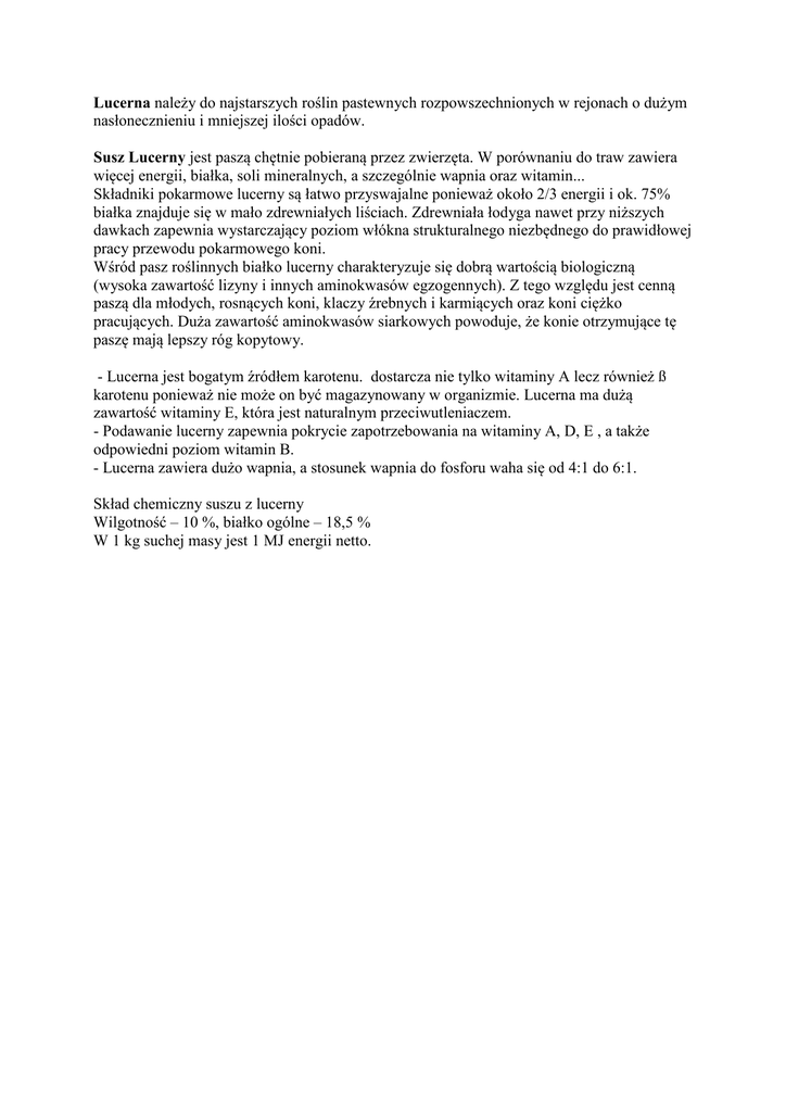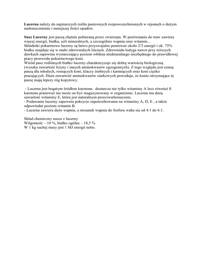 Lucerna należy do najstarszych roślin pastewnych rozpowszechnionych w rejonach o dużym nasłonecznieniu i mniejszej ilości opadów. Susz Lucerny jest paszą chętnie pobieraną przez zwierzęta. W porównaniu do traw zawiera więcej energii, białka, soli mineralnych, a szczególnie wapnia oraz witamin... Składniki pokarmowe lucerny są łatwo przyswajalne ponieważ około 2/3 energii i ok. 75% białka znajduje się w mało zdrewniałych liściach. Zdrewniała łodyga nawet przy niższych dawkach zapewnia wystarczający poziom włókna strukturalnego niezbędnego do prawidłowej pracy przewodu pokarmowego koni. Wśród pasz roślinnych białko lucerny charakteryzuje się dobrą wartością biologiczną (wysoka zawartość lizyny i innych aminokwasów egzogennych). Z tego względu jest cenną paszą dla młodych, rosnących koni, klaczy źrebnych i karmiących oraz koni ciężko pracujących. Duża zawartość aminokwasów siarkowych powoduje, że konie otrzymujące tę paszę mają lepszy róg kopytowy. - Lucerna jest bogatym źródłem karotenu. dostarcza nie tylko witaminy A lecz również ß karotenu ponieważ nie może on być magazynowany w organizmie. Lucerna ma dużą zawartość witaminy E, która jest naturalnym przeciwutleniaczem. - Podawanie lucerny zapewnia pokrycie zapotrzebowania na witaminy A, D, E , a także odpowiedni poziom witamin B. - Lucerna zawiera dużo wapnia, a stosunek wapnia do fosforu waha się od 4:1 do 6:1. Skład chemiczny suszu z lucerny Wilgotność – 10 %, białko ogólne – 18,5 % W 1 kg suchej masy jest 1 MJ energii netto.