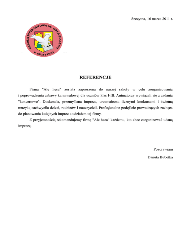 Szczytna, 16 marca 2011 r. REFERENCJE Firma "Ale heca" została zaproszona do naszej szkoły w celu zorganizowania i poprowadzenia zabawy karnawałowej dla uczniów klas I-III. Animatorzy wywiązali się z zadania "koncertowo". Doskonała, przemyślana impreza, urozmaicona licznymi konkursami i świetną muzyką zachwyciła dzieci, rodziców i nauczycieli. Profesjonalne podejście prowadzących zachęca do planowania kolejnych imprez z udziałem tej firmy. Z przyjemnością rekomendujemy firmę "Ale heca" każdemu, kto chce zorganizować udaną imprezę. Pozdrawiam Danuta Bubółka