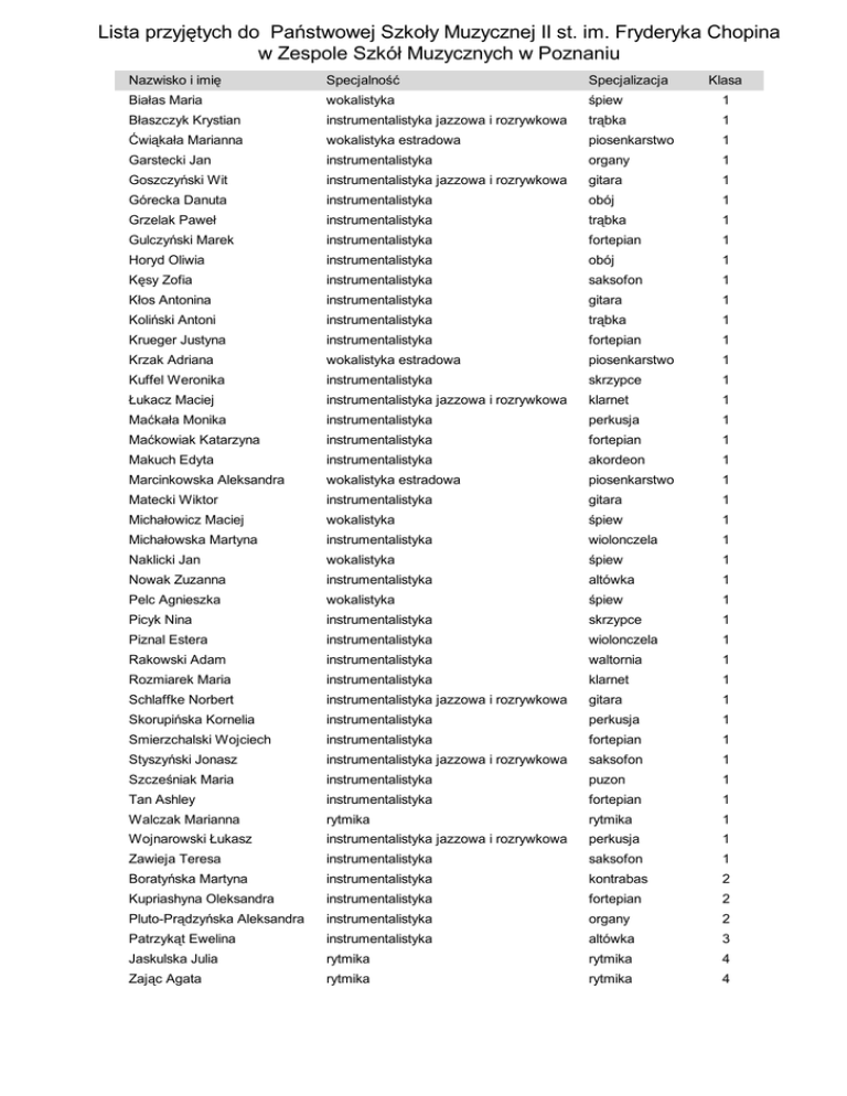 Lista przyjętych do Państwowej Szkoły Muzycznej II st. im. Fryderyka Chopina w Zespole Szkół Muzycznych w Poznaniu Nazwisko i imię Specjalność Specjalizacja Klasa Białas Maria wokalistyka śpiew 1 Błaszczyk Krystian instrumentalistyka jazzowa i rozrywkowa trąbka 1 Ćwiąkała Marianna wokalistyka estradowa piosenkarstwo 1 Garstecki Jan instrumentalistyka organy 1 Goszczyński Wit instrumentalistyka jazzowa i rozrywkowa gitara 1 Górecka Danuta instrumentalistyka obój 1 Grzelak Paweł instrumentalistyka trąbka 1 Gulczyński Marek instrumentalistyka fortepian 1 Horyd Oliwia instrumentalistyka obój 1 Kęsy Zofia instrumentalistyka saksofon 1 Kłos Antonina instrumentalistyka gitara 1 Koliński Antoni instrumentalistyka trąbka 1 Krueger Justyna instrumentalistyka fortepian 1 Krzak Adriana wokalistyka estradowa piosenkarstwo 1 Kuffel Weronika instrumentalistyka skrzypce 1 Łukacz Maciej instrumentalistyka jazzowa i rozrywkowa klarnet 1 Maćkała Monika instrumentalistyka perkusja 1 Maćkowiak Katarzyna instrumentalistyka fortepian 1 Makuch Edyta instrumentalistyka akordeon 1 Marcinkowska Aleksandra wokalistyka estradowa piosenkarstwo 1 Matecki Wiktor instrumentalistyka gitara 1 Michałowicz Maciej wokalistyka śpiew 1 Michałowska Martyna instrumentalistyka wiolonczela 1 Naklicki Jan wokalistyka śpiew 1 Nowak Zuzanna instrumentalistyka altówka 1 Pelc Agnieszka wokalistyka śpiew 1 Picyk Nina instrumentalistyka skrzypce 1 Piznal Estera instrumentalistyka wiolonczela 1 Rakowski Adam instrumentalistyka waltornia 1 Rozmiarek Maria instrumentalistyka klarnet 1 Schlaffke Norbert instrumentalistyka jazzowa i rozrywkowa gitara 1 Skorupińska Kornelia instrumentalistyka perkusja 1 Smierzchalski Wojciech instrumentalistyka fortepian 1 Styszyński Jonasz instrumentalistyka jazzowa i rozrywkowa saksofon 1 Szcześniak Maria instrumentalistyka puzon 1 Tan Ashley instrumentalistyka fortepian 1 Walczak Marianna rytmika rytmika 1 Wojnarowski Łukasz instrumentalistyka jazzowa i rozrywkowa perkusja 1 Zawieja Teresa instrumentalistyka saksofon 1 Boratyńska Martyna instrumentalistyka kontrabas 2 Kupriashyna Oleksandra instrumentalistyka fortepian 2 Pluto-Prądzyńska Aleksandra instrumentalistyka organy 2 Patrzykąt Ewelina instrumentalistyka altówka 3 Jaskulska Julia rytmika rytmika 4 Zając Agata rytmika rytmika 4