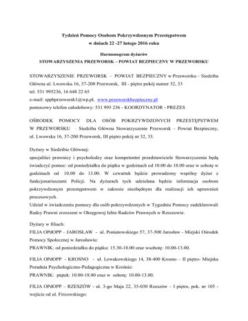 Tydzień Pomocy Osobom Pokrzywdzonym Przestępstwem w dniach 22 -27 lutego 2016 roku Harmonogram dyżurów STOWARZYSZENIA PRZEWORSK – POWIAT BEZPIECZNY W PRZEWORSKU STOWARZYSZENIE PRZEWORSK – POWIAT BEZPIECZNY w Przeworsku – Siedziba Główna ul. Lwowska 16, 37-200 Przeworsk, III - piętro pokój numer 32, 33 tel. 531 995236, 16 648 22 65 e-mail: [email protected], www.przeworskbezpieczny.pl pomocowy telefon całodobowy: 531 995 236 - KOORDYNATOR - PREZES OŚRODEK POMOCY DLA OSÓB POKRZYWDZONYCH PRZESTĘPSTWEM W PRZEWORSKU - Siedziba Główna Stowarzyszenie Przeworsk – Powiat Bezpieczny, ul. Lwowska 16, 37-200 Przeworsk, III piętro pokój nr 32, 33. Dyżury w Siedzibie Głównej: specjaliści prawnicy i psycholodzy oraz kompetentni przedstawiciele Stowarzyszenia będą świadczyć pomoc: od poniedziałku do piątku w godzinach od 10.00 do 18.00 oraz w sobotę w godzinach od 10.00 do 13.00. W czwartek będzie prowadzony wspólny dyżur z funkcjonariuszami Policji. Na dyżurach tych udzielana będzie informacja osobom pokrzywdzonym przestępstwem w zakresie niezbędnym dla realizacji ich uprawnień procesowych. Udział w świadczeniu pomocy dla osób pokrzywdzonych w Tygodniu Pomocy zadeklarowali Radcy Prawni zrzeszeni w Okręgowej Izbie Radców Prawnych w Rzeszowie. Dyżury w filiach: FILIA OPdOPP – JAROSŁAW - ul. Poniatowskiego 57, 37-500 Jarosław - Miejski Ośrodek Pomocy Społecznej w Jarosławiu: PRAWNIK: od poniedziałku do piątku: 15.30-18.00 oraz wsobotę: 10.00-13.00. FILIA OPdOPP - KROSNO - ul. Lewakowskiego 14, 38-400 Krosno – II piętro- Miejska Poradnia Psychologiczno-Pedagogiczna w Krośnie: PRAWNIK: piątek: 10.00-18.00 oraz w sobotę: 10.00-13.00. FILIA OPdOPP – RZESZÓW - ul. 3-go Maja 22, 35-030 Rzeszów – I piętro, pok. nr 105 wejście od ul. Fircowskiego: PRAWNIK: poniedziałek i wtorek: 8.00-16.00, środa: 10.00-18.00, czwartek: 14.00 – 18.00 oraz w sobotę: 10.00-13.00, PSYCHOLOG: środa: 10.00-16.00. FILIA OPdOPP – STALOWA WOLA - ul. 1-sierpnia 26, 37-450 Stalowa Wola, I piętro - ZSP Nr 2 im. Tadeusza Kościuszki „Budowlanka”, wejście od strony torów kolejowych: PRAWNICY: poniedziałek: 8.00-18.00 wtorek: 10.00 – 17.00 oraz w sobotę: 8.00-13.00. S-I.9452.5.2016.EK str. 2 z 2