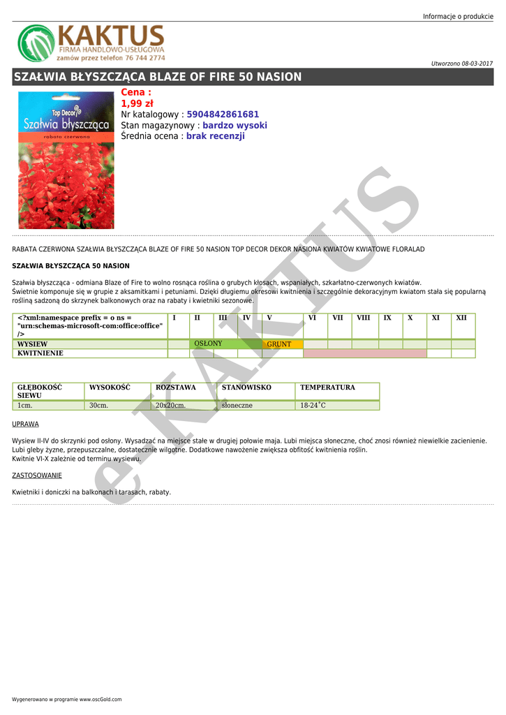 Informacje o produkcie Utworzono 08-03-2017 SZAŁWIA BŁYSZCZĄCA BLAZE OF FIRE 50 NASION Cena : 1,99 zł AK TU S Nr katalogowy : 5904842861681 Stan magazynowy : bardzo wysoki Średnia ocena : brak recenzji RABATA CZERWONA SZAŁWIA BŁYSZCZĄCA BLAZE OF FIRE 50 NASION TOP DECOR DEKOR NASIONA KWIATÓW KWIATOWE FLORALAD SZAŁWIA BŁYSZCZĄCA 50 NASION Szałwia błyszcząca - odmiana Blaze of Fire to wolno rosnąca roślina o grubych kłosach, wspaniałych, szkarłatno-czerwonych kwiatów. Świetnie komponuje się w grupie z aksamitkami i petuniami. Dzięki długiemu okresowi kwitnienia i szczególnie dekoracyjnym kwiatom stała się popularną rośliną sadzoną do skrzynek balkonowych oraz na rabaty i kwietniki sezonowe. <?xml:namespace prefix = o ns = "urn:schemas-microsoft-com:office:office" /> WYSIEW KWITNIENIE WYSOKOŚĆ 30cm. II III IV OSŁONY V VI VII VIII IX X XI XII GRUNT ROZSTAWA STANOWISKO TEMPERATURA 20x20cm. słoneczne 18-24˚C eK GŁĘBOKOŚĆ SIEWU 1cm. I UPRAWA Wysiew II-IV do skrzynki pod osłony. Wysadzać na miejsce stałe w drugiej połowie maja. Lubi miejsca słoneczne, choć znosi również niewielkie zacienienie. Lubi gleby żyzne, przepuszczalne, dostatecznie wilgotne. Dodatkowe nawożenie zwiększa obfitość kwitnienia roślin. Kwitnie VI-X zależnie od terminu wysiewu. ZASTOSOWANIE Kwietniki i doniczki na balkonach i tarasach, rabaty. Wygenerowano w programie www.oscGold.com