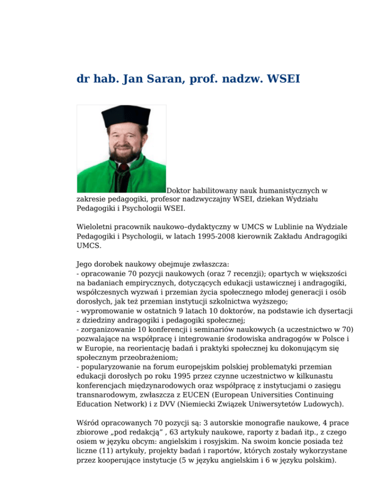 dr hab. Jan Saran, prof. nadzw. WSEI Doktor habilitowany nauk humanistycznych w zakresie pedagogiki, profesor nadzwyczajny WSEI, dziekan Wydziału Pedagogiki i Psychologii WSEI. Wieloletni pracownik naukowo–dydaktyczny w UMCS w Lublinie na Wydziale Pedagogiki i Psychologii, w latach 1995-2008 kierownik Zakładu Andragogiki UMCS. Jego dorobek naukowy obejmuje zwłaszcza: - opracowanie 70 pozycji naukowych (oraz 7 recenzji); opartych w większości na badaniach empirycznych, dotyczących edukacji ustawicznej i andragogiki, współczesnych wyzwań i przemian życia społecznego młodej generacji i osób dorosłych, jak też przemian instytucji szkolnictwa wyższego; - wypromowanie w ostatnich 9 latach 10 doktorów, na podstawie ich dysertacji z dziedziny andragogiki i pedagogiki społecznej; - zorganizowanie 10 konferencji i seminariów naukowych (a uczestnictwo w 70) pozwalające na współpracę i integrowanie środowiska andragogów w Polsce i w Europie, na reorientację badań i praktyki społecznej ku dokonującym się społecznym przeobrażeniom; - popularyzowanie na forum europejskim polskiej problematyki przemian edukacji dorosłych po roku 1995 przez czynne uczestnictwo w kilkunastu konferencjach międzynarodowych oraz współpracę z instytucjami o zasięgu transnarodowym, zwłaszcza z EUCEN (European Universities Continuing Education Network) i z DVV (Niemiecki Związek Uniwersytetów Ludowych). Wśród opracowanych 70 pozycji są: 3 autorskie monografie naukowe, 4 prace zbiorowe „pod redakcją” , 63 artykuły naukowe, raporty z badań itp., z czego osiem w języku obcym: angielskim i rosyjskim. Na swoim koncie posiada też liczne (11) artykuły, projekty badań i raportów, których zostały wykorzystane przez kooperujące instytucje (5 w języku angielskim i 6 w języku polskim).