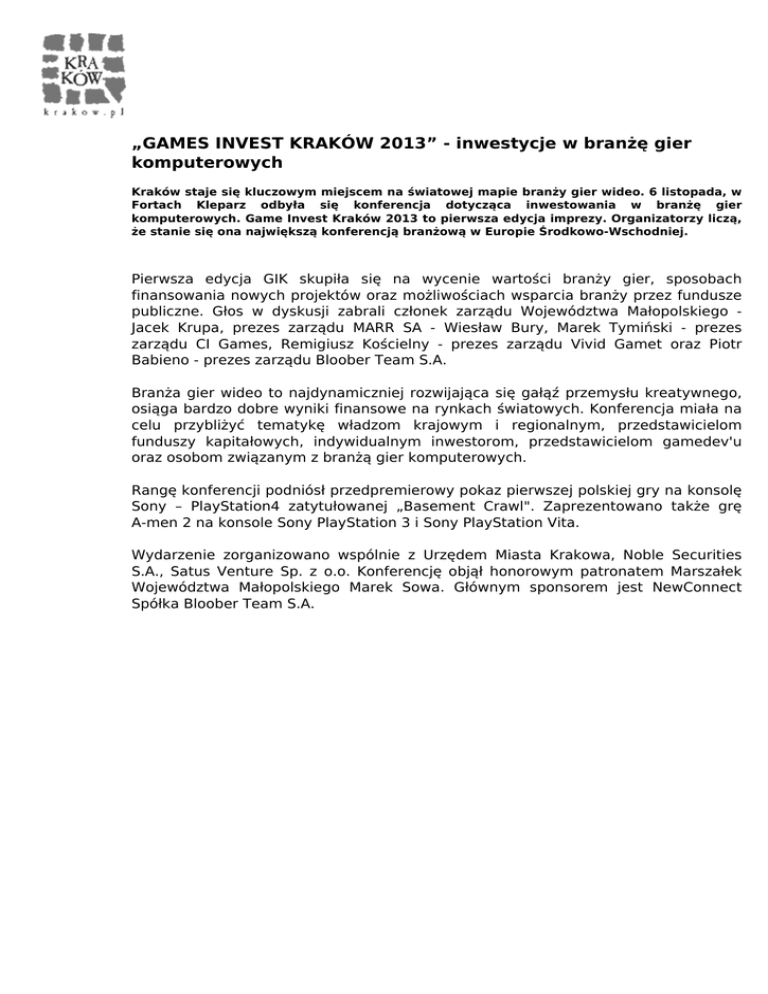 „GAMES INVEST KRAKÓW 2013” - inwestycje w branżę gier komputerowych Kraków staje się kluczowym miejscem na światowej mapie branży gier wideo. 6 listopada, w Fortach Kleparz odbyła się konferencja dotycząca inwestowania w branżę gier komputerowych. Game Invest Kraków 2013 to pierwsza edycja imprezy. Organizatorzy liczą, że stanie się ona największą konferencją branżową w Europie Środkowo-Wschodniej. Pierwsza edycja GIK skupiła się na wycenie wartości branży gier, sposobach finansowania nowych projektów oraz możliwościach wsparcia branży przez fundusze publiczne. Głos w dyskusji zabrali członek zarządu Województwa Małopolskiego Jacek Krupa, prezes zarządu MARR SA - Wiesław Bury, Marek Tymiński - prezes zarządu CI Games, Remigiusz Kościelny - prezes zarządu Vivid Gamet oraz Piotr Babieno - prezes zarządu Bloober Team S.A. Branża gier wideo to najdynamiczniej rozwijająca się gałąź przemysłu kreatywnego, osiąga bardzo dobre wyniki finansowe na rynkach światowych. Konferencja miała na celu przybliżyć tematykę władzom krajowym i regionalnym, przedstawicielom funduszy kapitałowych, indywidualnym inwestorom, przedstawicielom gamedev'u oraz osobom związanym z branżą gier komputerowych. Rangę konferencji podniósł przedpremierowy pokaz pierwszej polskiej gry na konsolę Sony – PlayStation4 zatytułowanej „Basement Crawl". Zaprezentowano także grę A-men 2 na konsole Sony PlayStation 3 i Sony PlayStation Vita. Wydarzenie zorganizowano wspólnie z Urzędem Miasta Krakowa, Noble Securities S.A., Satus Venture Sp. z o.o. Konferencję objął honorowym patronatem Marszałek Województwa Małopolskiego Marek Sowa. Głównym sponsorem jest NewConnect Spółka Bloober Team S.A. Powered by TCPDF (www.tcpdf.org)