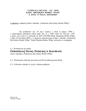 UCHWAŁA NR XLII/ 314 /2010 RADY MIEJSKIEJ BORKU WLKP. Z DNIA 27 MAJA 2010 ROKU w sprawie: nadania tytułu i odznaki „Zasłużony dla Gminy Borek Wlkp.” Na podstawie art. 18 ust.1 ustawy z dnia 8 marca 1990 r. o samorządzie gminnym (tekst jedn. Dz. U. z 2001 roku Nr 142 poz. 1591 z późn. zm.) oraz § 3 uchwały nr XIX/130/2004 Rady Miejskiej Borku Wlkp. z dnia 22 kwietnia 2004 r. w sprawie ustanowienia tytułu i odznaki „Zasłużony dla Gminy Borek Wlkp.” Rada Miejska Borku Wlkp. uchwala, co następuje: § 1. Postanawia się nadać Ochotniczej Straży Pożarnej w Karolewie tytuł i odznakę „Zasłużony dla Gminy Borek Wlkp.” § 2. Wykonanie uchwały powierza się Przewodniczącemu Rady. § 3. Uchwała wchodzi w życie z dniem podjęcia. Opracowała: Wiesława Wójcik Borek Wlkp. dnia 2010-05-17 Opinia uzasadniająca nadanie odznaki "Zasłużony dla Gminy Borek Wlkp." W roku 1935 została wprowadzona w życie ustawa rządowa o ochronie przeciwpożarowej, dlatego pierwsze wzmianki na temat powstania OSP Karolew to okres międzywojenny - rok 1935. Właściciel Karolewa - Karol Graeve powołał do życia Straż Pożarną w Karolewie. Z przesłanek wynika, że w 1935 roku w składzie pierwszego Zarządu Straży Pożarnej w Karolewie przewodzili kowale: Józef Tadeusz oraz maszynista lokomobili Józef Goździewicz, naczelnikiem był również kowal Antoni Kuliński. Straż w Karolewie na wyposażeniu posiadała konną ręczną sikawkę, którą do pożarów najczęściej wyjeżdżali Franciszek Olbrzymek, Michał Mołczyński fuszpani hrabiny. Pierwsze wyposażenie to tylko podręczny sprzęt gaśniczy, umundurowanie, z którym poszczególni członkowie przybywali na alarm. Sprzęt ten przechowywany był w powozowni na terenie obecnej Spółdzielni Mieszkaniowej. Członkami byli również Józef Gruchalski, Jan Ostojski, Marian Drożan, Franciszek Mołczyński. W okresie wojennym gdy Franciszek i Michał Mołczyńscy poszli na wojnę to sikawką do pożaru wyjeżdżał Leon Andrzejczak. W tym okresie paliły się stogi na Rodunku oraz w Siedmiorogowie. Po wojnie w roku 1947 do Straży w Karolewie przekazano pompę ręczną o wydajności 400 litrów. W tym czasie członkami Straży w Karolewie byli: Bronisław Wojcieszak, Jan Mołczyński, Jan Kaczorowski, Walenty Gałczyński, Walenty Kuczkowiak, Andrzej Nowakowski, Franciszek Gałczyński. Pompę przewożono na przyczepie lub samochodem Lublin. Największe pożary, w których brano udział: 1950 r. - pożar leśniczówki w Siedmiorogowie 1950 r. - pożar baraku, teren obecnego tartaku 1951 r. - pożar w Porębie u Jazduna 1953 r. - pożar w Porębie u Łuczaka W 1960 roku przydzielono do Straży Pożarnej w Karolewie motopompę "POLONIA" o wydajności 400 l/min. Członkiem straży był: Kazimierz Walczewski, naczelnikiem był Antoni Hojny. Pierwsza remiza znajdowała się na terenie Gospodarstwa - późniejszy teren zakładu budowlano-remontowego i funkcjonowała tam do roku 1969. W dniu 06-01-1969 r. zostaje przekształcona z OSP w Karolewie w Zakładową Ochotnicza Straż Pożarną działającą przy Kombinacie PGR w Karolewie na terenie Centralnej Bazy Mechanizacji. Prezesem zostaje wybrany ówczesny kierownik dh Kazimierz Kornatowski, a naczelnikiem Jan Maliński. W grudniu 1969 r. w Karolewie spłonął doszczętnie pałac i wszystkie dokumenty na temat działalności OSP w Karolewie. Okres od 1969 r. to nowy rozdział w historii OSP Karolew. Jest to okres funkcjonowania jednostki zakładowej na terenie CBM Karolew. Pierwsza remiza to garaże. W dniu 12 marca 1974 r. jednostce przydzielono samochód Żuk GLM, który w roku 1985 został przekazany do jednostki zakładowej w Zalesiu i służy do dnia dzisiejszego. Strażacy z Karolewa odnoszą w tym okresie sukcesy w zawodach sportowo-pożarniczych zorganizowanych przez Zjednoczenie PGR zajmując czołowe miejsca. Między innymi w roku 1975 w Rawiczu zajmują II miejsce. W 1984 r. zostaje przekazany Jednostce OSP w Karolewie nowy samochód STAR - 200 GBM 2,5/8 zabudowany do celów pożarniczych w Osinach. Samochód ten służy strażakom do dnia dzisiejszego. 19-09-1987 r. oddano do użytku nowo wybudowaną dwu boksową z zapleczem socjalnym remizę strażacką wybudowaną w rekordowym tempie - 56 dni, przy dużym zaangażowaniu dyrektora Kombinatu PGR w Karolewie Jana Ratajczaka oraz kierownika CBM, a zarazem prezesa OSP w Karolewie Andrzeja Dudkiewicza. Koszty budowy remizy poniósł kombinat PGR w Karolewie przy wsparciu PZU. W 1992 r. utworzono 1 drużynę młodzieżową, męską i z roku na rok wzrastała ilość młodzieżowych drużyn pożarniczych. W roku 1998 w zawodach brało udział 6 młodzieżowych drużyn pożarniczych, które w tym czasie zajmują 17 razy I miejsce w zawodach sportowo-pożarniczych na szczeblu gminy i rejonu. 1 maja 1999 r. jednostka otrzymała i poświęciła sztandar. Od 11 czerwca 2001 r. roku jednostkę włączono do Krajowego Systemu Ratowniczo Gaśniczego. W 2005 r. powstał Komitet Fundacji zakupu samochodu STAR Man, zakupiono także w ramach zbiórki pieniężnej aparaty powietrzne, pompę pływającą oraz piłę do betonu i stali. W 2007 r. ze środków Wojewódzkiego Ośrodka Ruchu Drogowego, jednostka pozyskała zestaw R1 i nosze -piłę do betonu, otrzymaną wraz z samochodem star 2000, którą przekazano do OSP Zimnowoda. Jednostka wyposażona jest w 3 samochody: Star Man - GBA 2,5/16, który został pozyskany w marcu 2005 roku. Na jego wyposażeniu znajduje się: zbiornik wodny o pojemności 2500 l, zbiornik na środek pianotwórczy 250 l, autopompa, działko wodne, trzy drabiny, pompa pływająca, agregat prądotwórczy, maszt oświetleniowy, armatura wodno-pianowa, sprzęt burzący. Znajduje się na nim, także sprzęt do ratownictwa medycznego - zestaw R1. O WYSZKOLENIU I DOBREJ PRACY ZARZĄDU OSP W KAROLEWIE Z MŁODZIEŻĄ ŚWIADCZĄ ZDOBYTE PUCHARY I WYRÓŻNIENIA: Zawody - rejonowe, powiatowe i międzypowiatowe: · Leszno