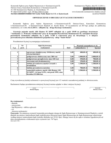 Komornik Sądowy przy Sądzie Rejonowym w Siemianowicach Śl. Dariusz Graca, Kancelaria Komornicza w Siemianowicach Śl. 41-106 Siemianowice Śląskie, ul. Józefa Bema 19 W odpowiedzi podać: sygn. akt Km 1442/11i inne 56156011080000935000067453 Getin Noble Bank SA I O. w Katowicach Siemianowice Śląskie, dnia 02.12.2011 r. *2011120200354* www.komornik.siemianowice-slaskie.com.pl tel.(032)7502030 OBWIESZCZENIE O DRUGIEJ LICYTACJI RUCHOMOŚCI Komornik Sądowy przy Sądzie Rejonowym w Siemianowicach Śl. Dariusz Graca, Kancelaria Komornicza w Siemianowicach Śl. w Siemianowicach Śląskich ul. Józefa Bema 19 na podstawie art. 867 kpc podaje do publicznej wiadomości, że w dniu 16.12.2011r. odbędzie się druga licytacja ruchomości. Licytacja pojazdu marki Alfa Romeo SI 36997 odbędzie się o godz 10:00 na parkingu strzeżonym "Autokomis s.c. Walczak i Orlikowski" przy ul. Krupanka/Wrocławska Siemianowice Śl., natomiast licytacja pozostałych ruchomości odbędzie się o godz. 11:00 w Chorzowie przy ul. Strzybnego 7, w miejscu prowadzenia przez dłużnika działalności gospodarczej - sklep "Sanit-Metal" Przedmiotem licytacji są następujące ruchomości: Nr prot. L.p. 1 2 3 4 5 6 7 Opis licytowanej ruchomości ogrzewacz elemktryczny 10-litrowy marki ELEKTROMET podgrzewacz elektryczny moc 380 wat podgrzewacz przepływowy moc 220 wat zlewozmywak dwukomorowy kabina prysznicowa marki Cersanit z brodzikiem kabina prysznicowa narożna samochód osobowy marki Alfa Romeo 145, SI 36997, 1.6 benz+LPG, rok prod 1995, stan licznika:215.806 km ilość Wartość szacunkowa w zł. jednostkowa łączna 1,00 400,00 zł 400,00 zł 3,00 2,00 2,00 1,00 1.000,00 zł 350,00 zł 150,00 zł 1.300,00 zł 3.000,00 zł 700,00 zł 300,00 zł 1.300,00 zł 1,00 1,00 700,00 zł 3.500,00 zł 700,00 zł 3.500,00 zł Ceną wywoławczą każdej ruchomości w powyższej licytacji jest 1/2 wartości szacunkowej podanej w obwieszczeniu. Ruchomości będące przedmiotem niniejszej licytacji można oglądać w dniu i miejscu licytacji. asesor komornik Michał Kupny Dariusz Graca Do wiadomości: - dłużnik; - wierzyciele; - Sąd Rejonowy - tablica ogłoszeń - a/a - dozorca ruchomości Pouczenie: Na niniejszą czynność komornika przysługuje skarga do Sądu Rejonowego w Siemianowicach Śląskich, a jeżeli dłużnik ma miejsce zamieszkania bądź siedzibę poza obszarem tegoż Sądu Rejonowego do Sądu Rejonowego właściwego według miejsca zamieszkania bądź siedziby dłużnika (art.767§1 kpc). Skargę wnosi się do sądu w terminie tygodniowym od dnia zawiadomienia o dokonaniu tejże czynności (art. 767 kpc). (Sporządził: MK )