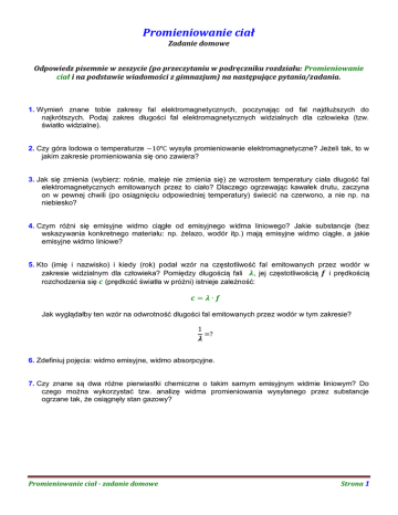 Promieniowanie ciał Zadanie domowe Odpowiedz pisemnie w zeszycie (po przeczytaniu w podręczniku rozdziału: Promieniowanie ciał i na podstawie wiadomości z gimnazjum) na następujące pytania/zadania. 1. Wymień znane tobie zakresy fal elektromagnetycznych, poczynając od fal najdłuższych do najkrótszych. Podaj zakres długości fal elektromagnetycznych widzialnych dla człowieka (tzw. światło widzialne). 2. Czy góra lodowa o temperaturze wysyła promieniowanie elektromagnetyczne? Jeżeli tak, to w jakim zakresie promieniowania się ono zawiera? 3. Jak się zmienia (wybierz: rośnie, maleje nie zmienia się) ze wzrostem temperatury ciała długość fal elektromagnetycznych emitowanych przez to ciało? Dlaczego ogrzewając kawałek drutu, zaczyna on w pewnej chwili (po osiągnięciu odpowiedniej temperatury) świecić na czerwono, a nie np. na niebiesko? 4. Czym różni się emisyjne widmo ciągłe od emisyjnego widma liniowego? Jakie substancje (bez wskazywania konkretnego materiału: np. żelazo, wodór itp.) mają emisyjne widmo ciągłe, a jakie emisyjne widmo liniowe? 5. Kto (imię i nazwisko) i kiedy (rok) podał wzór na częstotliwość fal emitowanych przez wodór w zakresie widzialnym dla człowieka? Pomiędzy długością fali , jej częstotliwością i prędkością rozchodzenia się (prędkość światła w próżni) istnieje zależność: Jak wyglądałby ten wzór na odwrotność długości fal emitowanych przez wodór w tym zakresie? 6. Zdefiniuj pojęcia: widmo emisyjne, widmo absorpcyjne. 7. Czy znane są dwa różne pierwiastki chemiczne o takim samym emisyjnym widmie liniowym? Do czego można wykorzystać tzw. analizę widma promieniowania wysyłanego przez substancje ogrzane tak, że osiągnęły stan gazowy? Promieniowanie ciał - zadanie domowe Strona 1