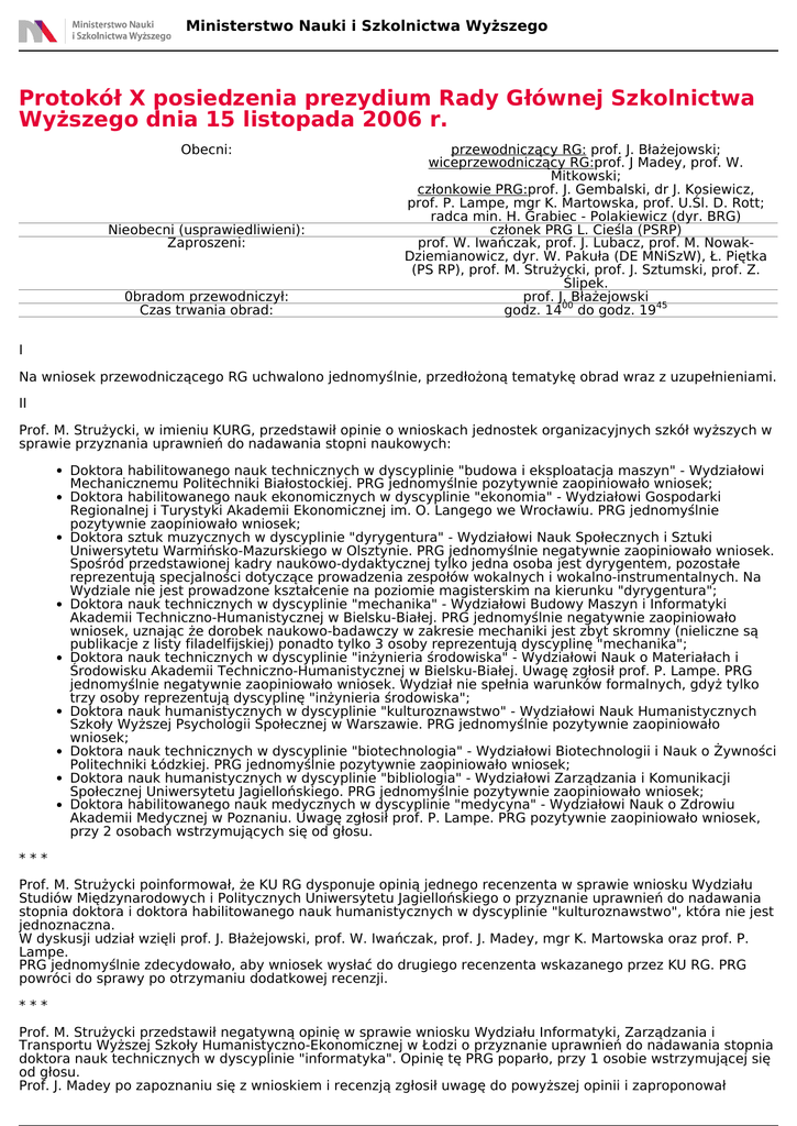 Ministerstwo Nauki i Szkolnictwa Wyższego Protokół X posiedzenia prezydium Rady Głównej Szkolnictwa Wyższego dnia 15 listopada 2006 r. Obecni: Nieobecni (usprawiedliwieni): Zaproszeni: 0bradom przewodniczył: Czas trwania obrad: przewodniczący RG: prof. J. Błażejowski; wiceprzewodniczący RG:prof. J Madey, prof. W. Mitkowski; członkowie PRG:prof. J. Gembalski, dr J. Kosiewicz, prof. P. Lampe, mgr K. Martowska, prof. U.Śl. D. Rott; radca min. H. Grabiec - Polakiewicz (dyr. BRG) członek PRG L. Cieśla (PSRP) prof. W. Iwańczak, prof. J. Lubacz, prof. M. NowakDziemianowicz, dyr. W. Pakuła (DE MNiSzW), Ł. Piętka (PS RP), prof. M. Strużycki, prof. J. Sztumski, prof. Z. Ślipek. prof. J. Błażejowski godz. 1400 do godz. 1945 I Na wniosek przewodniczącego RG uchwalono jednomyślnie, przedłożoną tematykę obrad wraz z uzupełnieniami. II Prof. M. Strużycki, w imieniu KURG, przedstawił opinie o wnioskach jednostek organizacyjnych szkół wyższych w sprawie przyznania uprawnień do nadawania stopni naukowych: Doktora habilitowanego nauk technicznych w dyscyplinie "budowa i eksploatacja maszyn" - Wydziałowi Mechanicznemu Politechniki Białostockiej. PRG jednomyślnie pozytywnie zaopiniowało wniosek; Doktora habilitowanego nauk ekonomicznych w dyscyplinie "ekonomia" - Wydziałowi Gospodarki Regionalnej i Turystyki Akademii Ekonomicznej im. O. Langego we Wrocławiu. PRG jednomyślnie pozytywnie zaopiniowało wniosek; Doktora sztuk muzycznych w dyscyplinie "dyrygentura" - Wydziałowi Nauk Społecznych i Sztuki Uniwersytetu Warmińsko-Mazurskiego w Olsztynie. PRG jednomyślnie negatywnie zaopiniowało wniosek. Spośród przedstawionej kadry naukowo-dydaktycznej tylko jedna osoba jest dyrygentem, pozostałe reprezentują specjalności dotyczące prowadzenia zespołów wokalnych i wokalno-instrumentalnych. Na Wydziale nie jest prowadzone kształcenie na poziomie magisterskim na kierunku "dyrygentura"; Doktora nauk technicznych w dyscyplinie "mechanika" - Wydziałowi Budowy Maszyn i Informatyki Akademii Techniczno-Humanistycznej w Bielsku-Białej. PRG jednomyślnie negatywnie zaopiniowało wniosek, uznając że dorobek naukowo-badawczy w zakresie mechaniki jest zbyt skromny (nieliczne są publikacje z listy filadelfijskiej) ponadto tylko 3 osoby reprezentują dyscyplinę "mechanika"; Doktora nauk technicznych w dyscyplinie "inżynieria środowiska" - Wydziałowi Nauk o Materiałach i Środowisku Akademii Techniczno-Humanistycznej w Bielsku-Białej. Uwagę zgłosił prof. P. Lampe. PRG jednomyślnie negatywnie zaopiniowało wniosek. Wydział nie spełnia warunków formalnych, gdyż tylko trzy osoby reprezentują dyscyplinę "inżynieria środowiska"; Doktora nauk humanistycznych w dyscyplinie "kulturoznawstwo" - Wydziałowi Nauk Humanistycznych Szkoły Wyższej Psychologii Społecznej w Warszawie. PRG jednomyślnie pozytywnie zaopiniowało wniosek; Doktora nauk technicznych w dyscyplinie "biotechnologia" - Wydziałowi Biotechnologii i Nauk o Żywności Politechniki Łódzkiej. PRG jednomyślnie pozytywnie zaopiniowało wniosek; Doktora nauk humanistycznych w dyscyplinie "bibliologia" - Wydziałowi Zarządzania i Komunikacji Społecznej Uniwersytetu Jagiellońskiego. PRG jednomyślnie pozytywnie zaopiniowało wniosek; Doktora habilitowanego nauk medycznych w dyscyplinie "medycyna" - Wydziałowi Nauk o Zdrowiu Akademii Medycznej w Poznaniu. Uwagę zgłosił prof. P. Lampe. PRG pozytywnie zaopiniowało wniosek, przy 2 osobach wstrzymujących się od głosu. *** Prof. M. Strużycki poinformował, że KU RG dysponuje opinią jednego recenzenta w sprawie wniosku Wydziału Studiów Międzynarodowych i Politycznych Uniwersytetu Jagiellońskiego o przyznanie uprawnień do nadawania stopnia doktora i doktora habilitowanego nauk humanistycznych w dyscyplinie "kulturoznawstwo", która nie jest jednoznaczna. W dyskusji udział wzięli prof. J. Błażejowski, prof. W. Iwańczak, prof. J. Madey, mgr K. Martowska oraz prof. P. Lampe. PRG jednomyślnie zdecydowało, aby wniosek wysłać do drugiego recenzenta wskazanego przez KU RG. PRG powróci do sprawy po otrzymaniu dodatkowej recenzji. *** Prof. M. Strużycki przedstawił negatywną opinię w sprawie wniosku Wydziału Informatyki, Zarządzania i Transportu Wyższej Szkoły Humanistyczno-Ekonomicznej w Łodzi o przyznanie uprawnień do nadawania stopnia doktora nauk technicznych w dyscyplinie "informatyka". Opinię tę PRG poparło, przy 1 osobie wstrzymującej się od głosu. Prof. J. Madey po zapoznaniu się z wnioskiem i recenzją zgłosił uwagę do powyższej opinii i zaproponował Ministerstwo Nauki i Szkolnictwa Wyższego reasumpcję głosowania. PRG poparło wniosek o reasumpcję głosowania, przy 1 osobie głosującej przeciw i 1 wstrzymującej się. W dyskusji udział wzięli: dr A. Bartczak, prof. J. Błażejowski, prof. W. Iwańczak, mgr K. Martowska oraz prof. W. Witkowski. Z uwagi na rozbieżność stanowisk prof. J. Błażejowski zaproponował skierowanie wniosku do drugiego recenzenta. KU RG wskaże nazwisko tej osoby. PRG powróci do sprawy po otrzymaniu dodatkowej recenzji. PRG zwróciło się do KU RG o przedstawienie projektu stosownej uchwały w sprawie zaopiniowanych wniosków na posiedzeniu plenarnym RG dn. 16.11.06 r. III Prof. M. Nowak-Dziemianowicz zreferowała projekt standardów kształcenia przygotowującego do wykonywania zawodu nauczyciela. Standardy te dotyczą kształcenia nauczycieli na studiach I i II stopnia oraz na studiach podyplomowych. Stosownie do art. 45 ust. 2 pkt 1, w związku z art. 9 pkt 3 ustawy Prawo o szkolnictwie wyższym RG przedstawia ministrowi właściwemu do spraw szkolnictwa wyższego standardy kształcenia przygotowującego do wykonywania zawodu nauczyciela. Projekt standardów przygotowany został przez zespół składający się z ekspertów - uznanych pedagogów oraz członków RG - został zaakceptowany przez KEd RG oraz skonsultowany ze środowiskiem akademickim. Uwagi do przygotowan